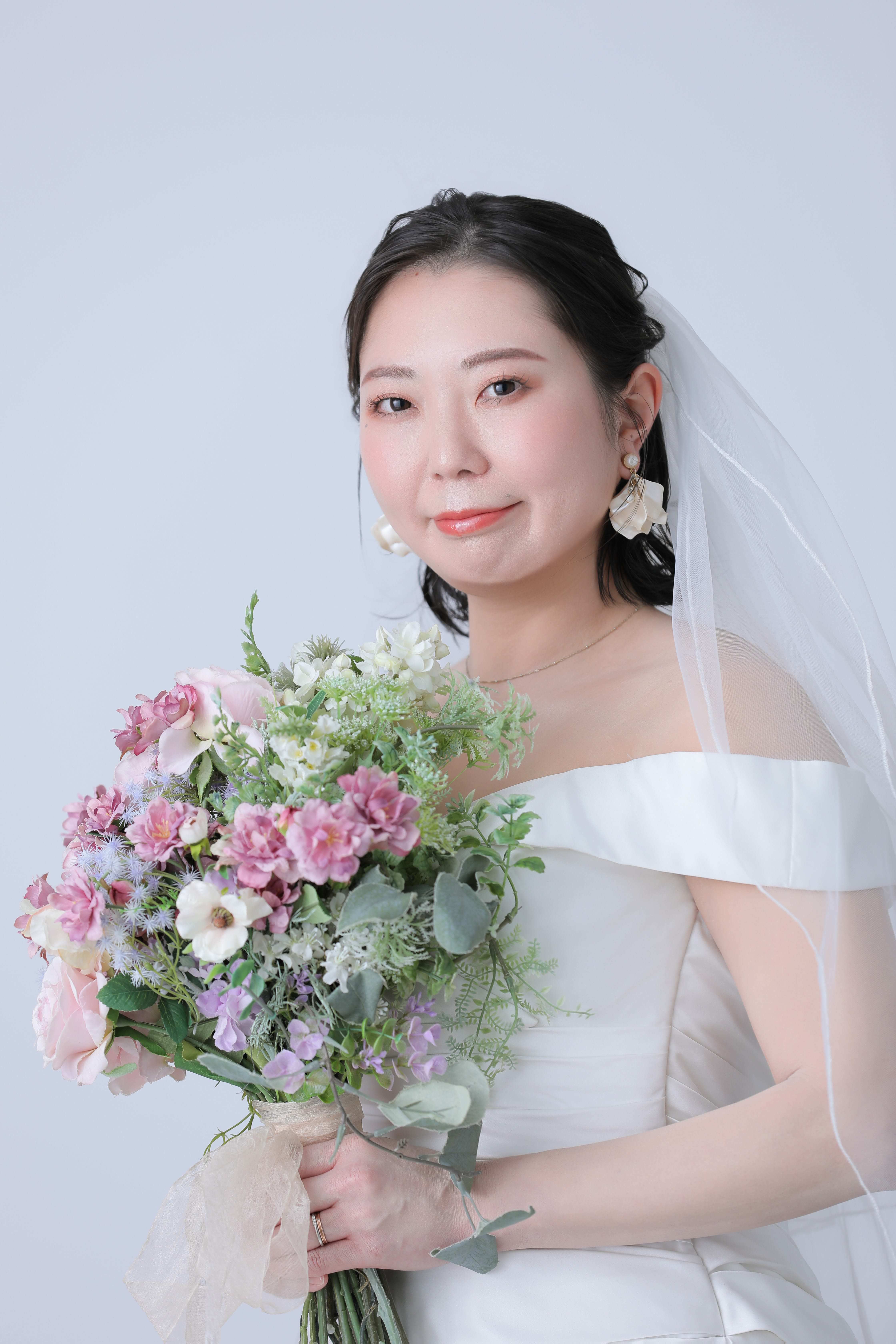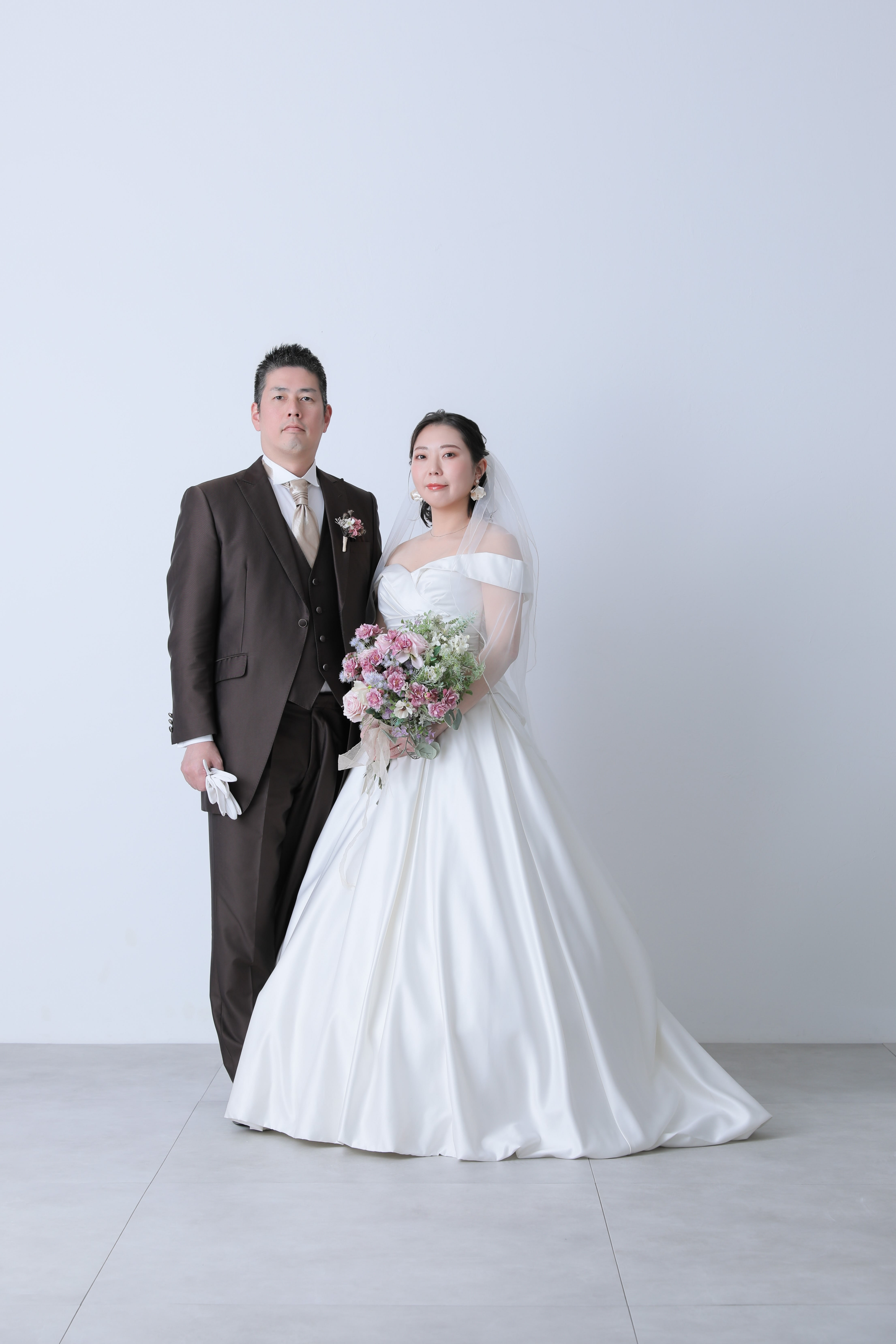 まずはシンプルに無地の背景で撮影! 背景がシンプルだからこそ、衣装の質感や色味がより伝わる1枚になります。