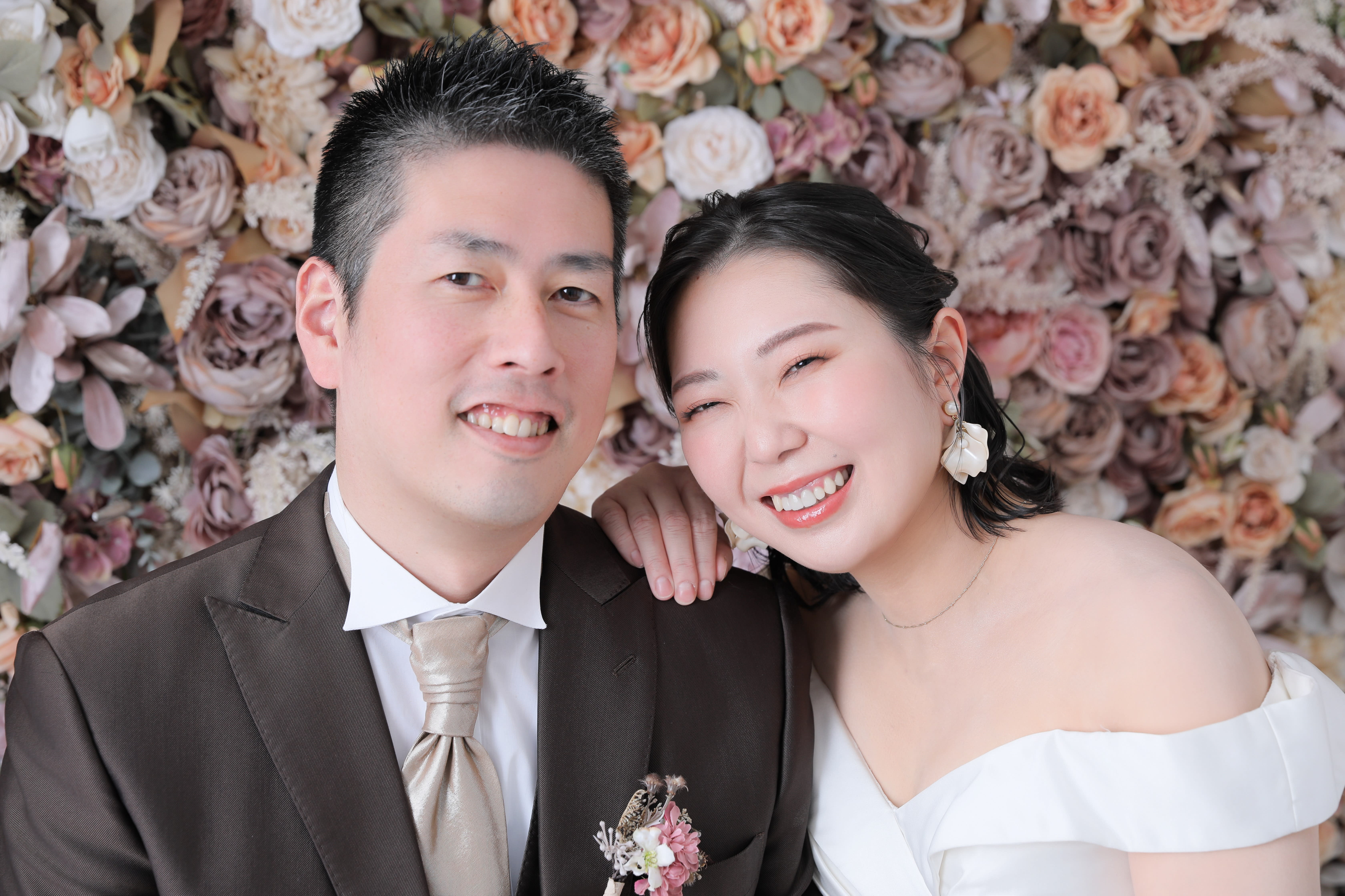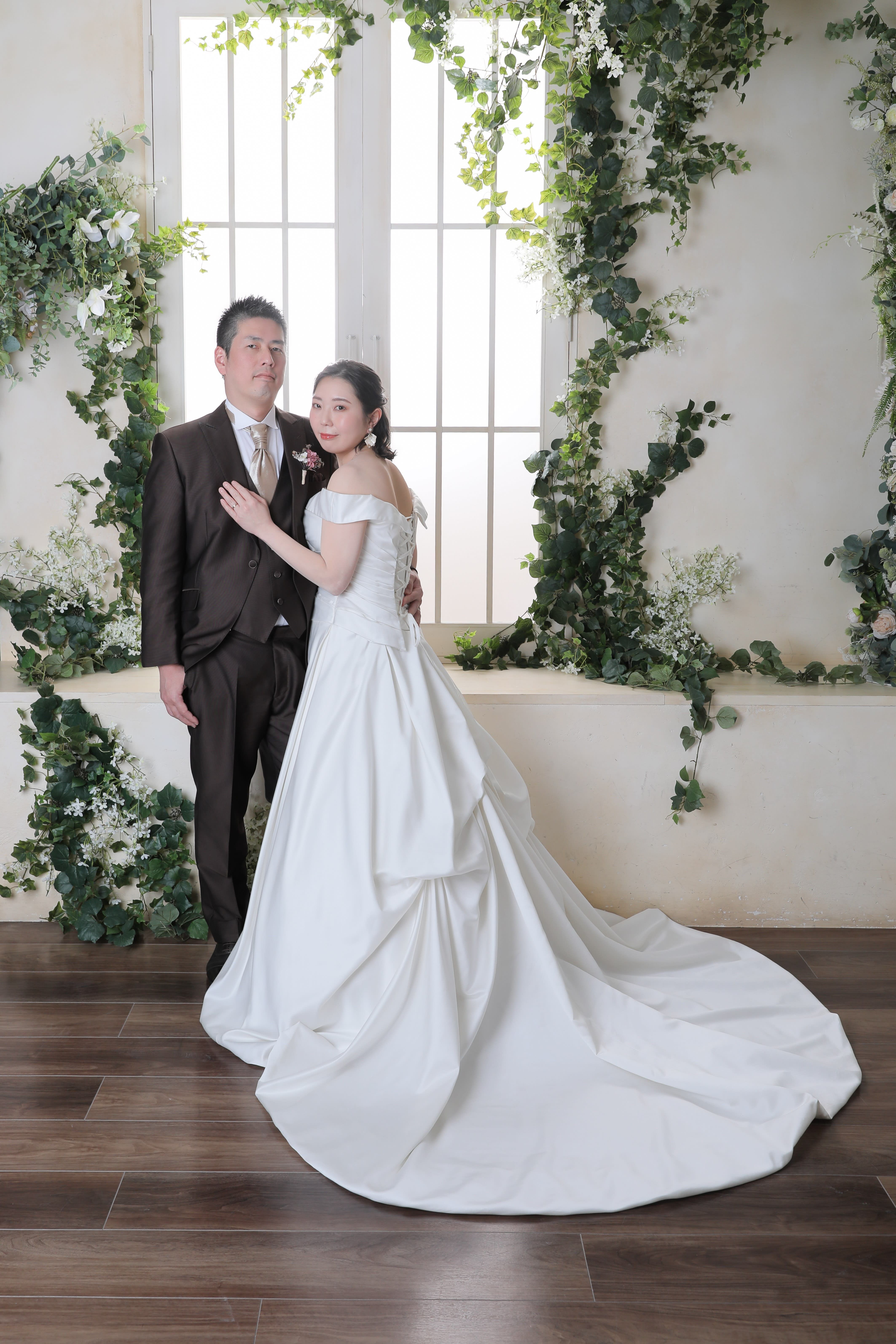 次はフラワーウォールで椅子に腰掛けてナチュラルなテイストで。