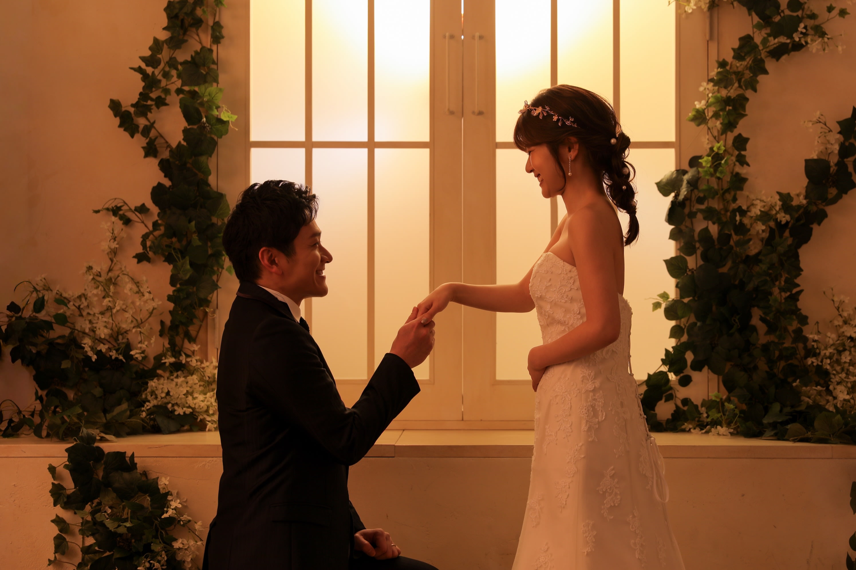 イニシャルオブジェと「LOVE」の置物を使って見つめ合うお二人!距離感に少しドキドキ❤︎