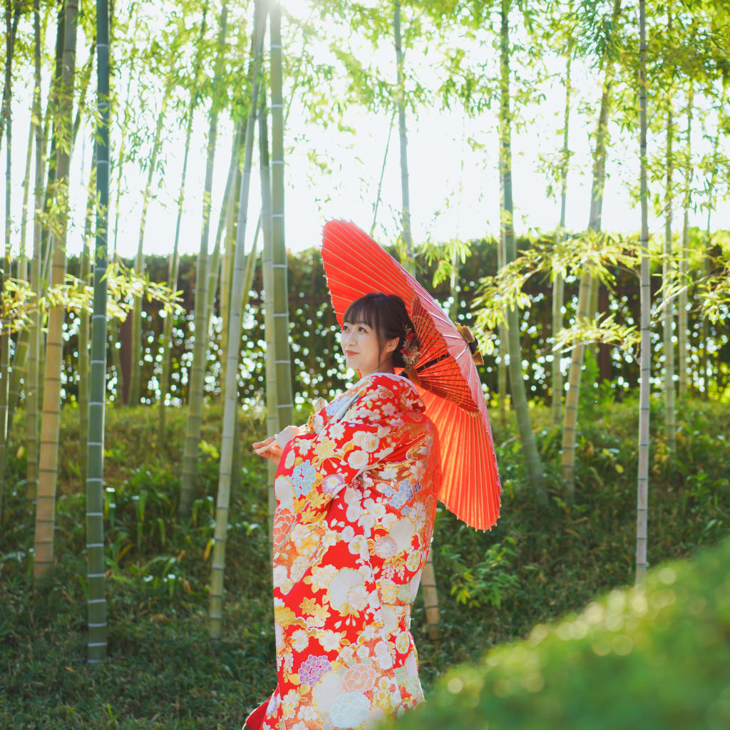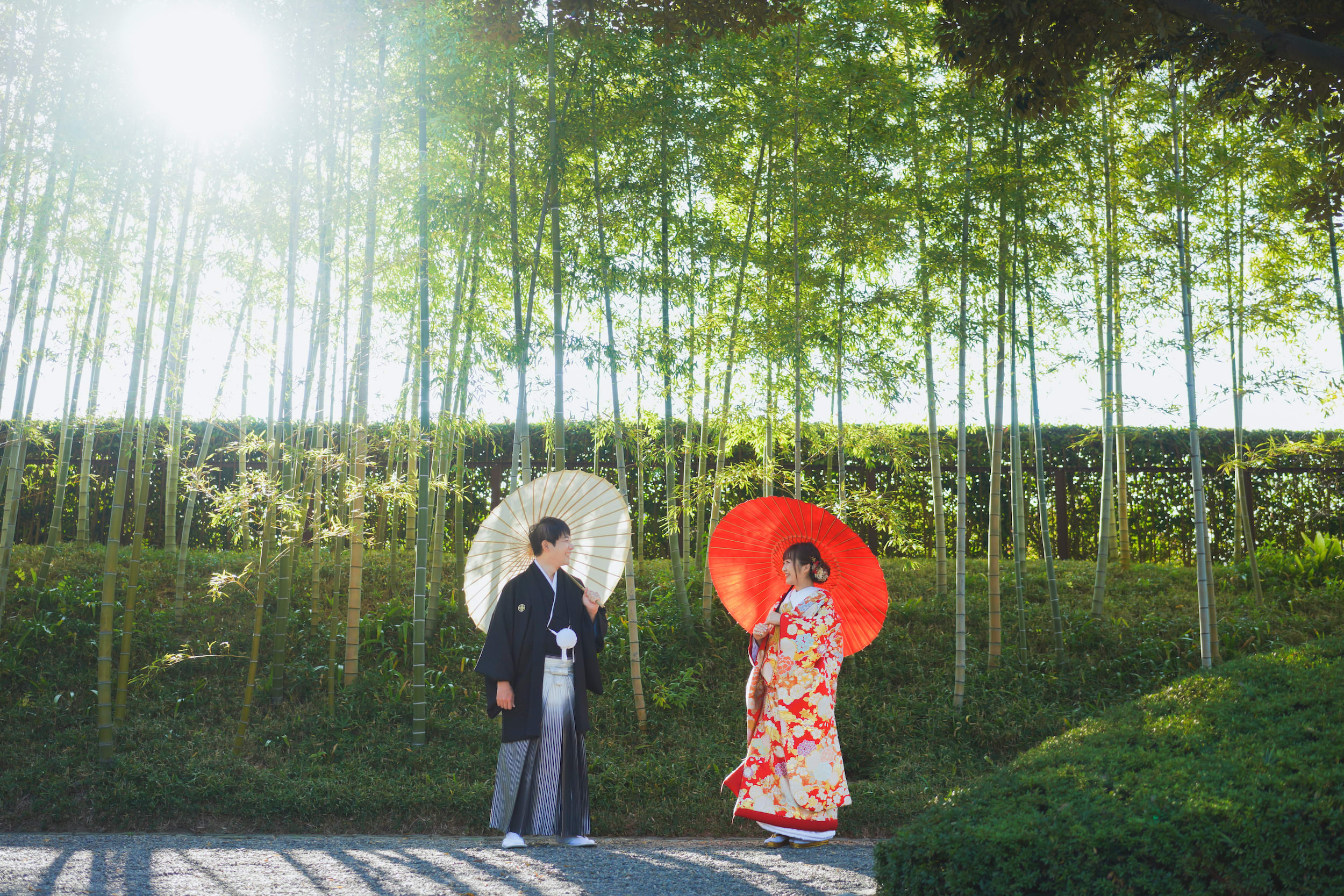綺麗な竹林の並木道を二人でお散歩。 西日が差し込んで印象的な雰囲気に。