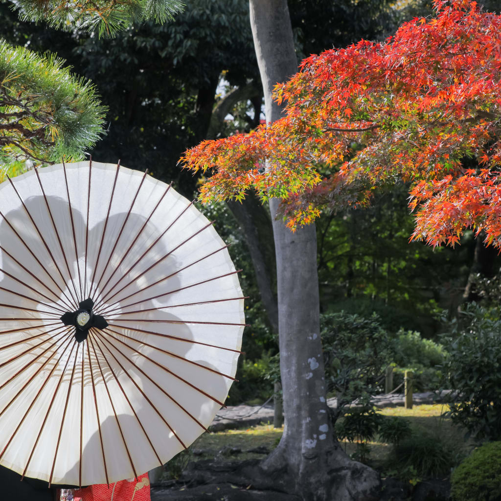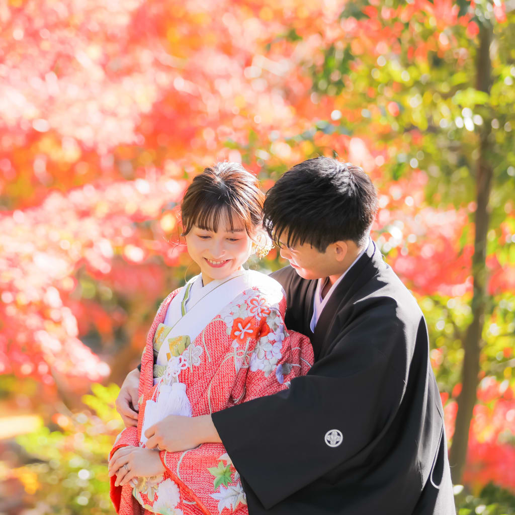お二人のシルエットを和傘に映し出しました。赤の紅葉に白い傘が映えました。