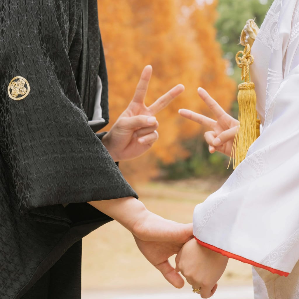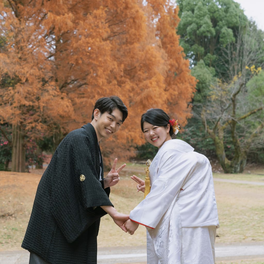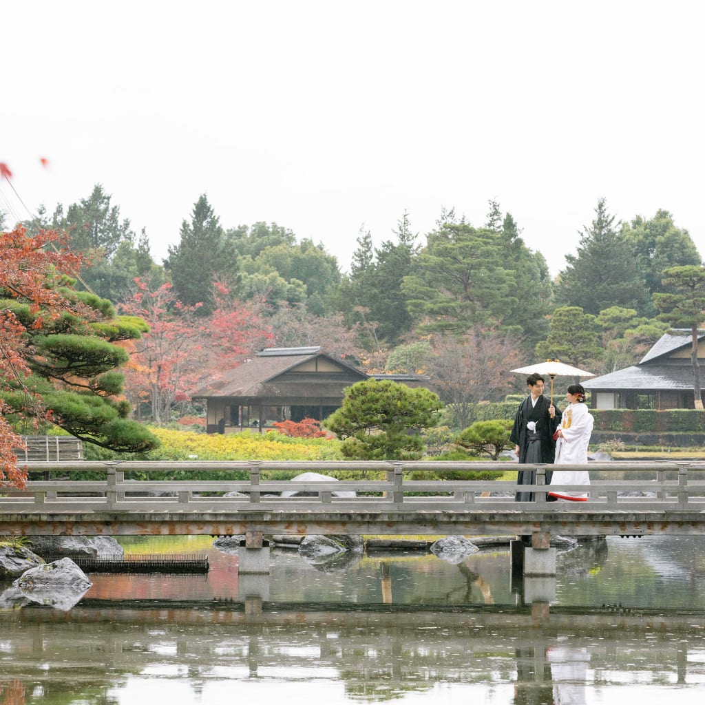 オレンジの紅葉が綺麗な橋の上で写真を撮りました!見つめ合うお二人がとても素敵です!