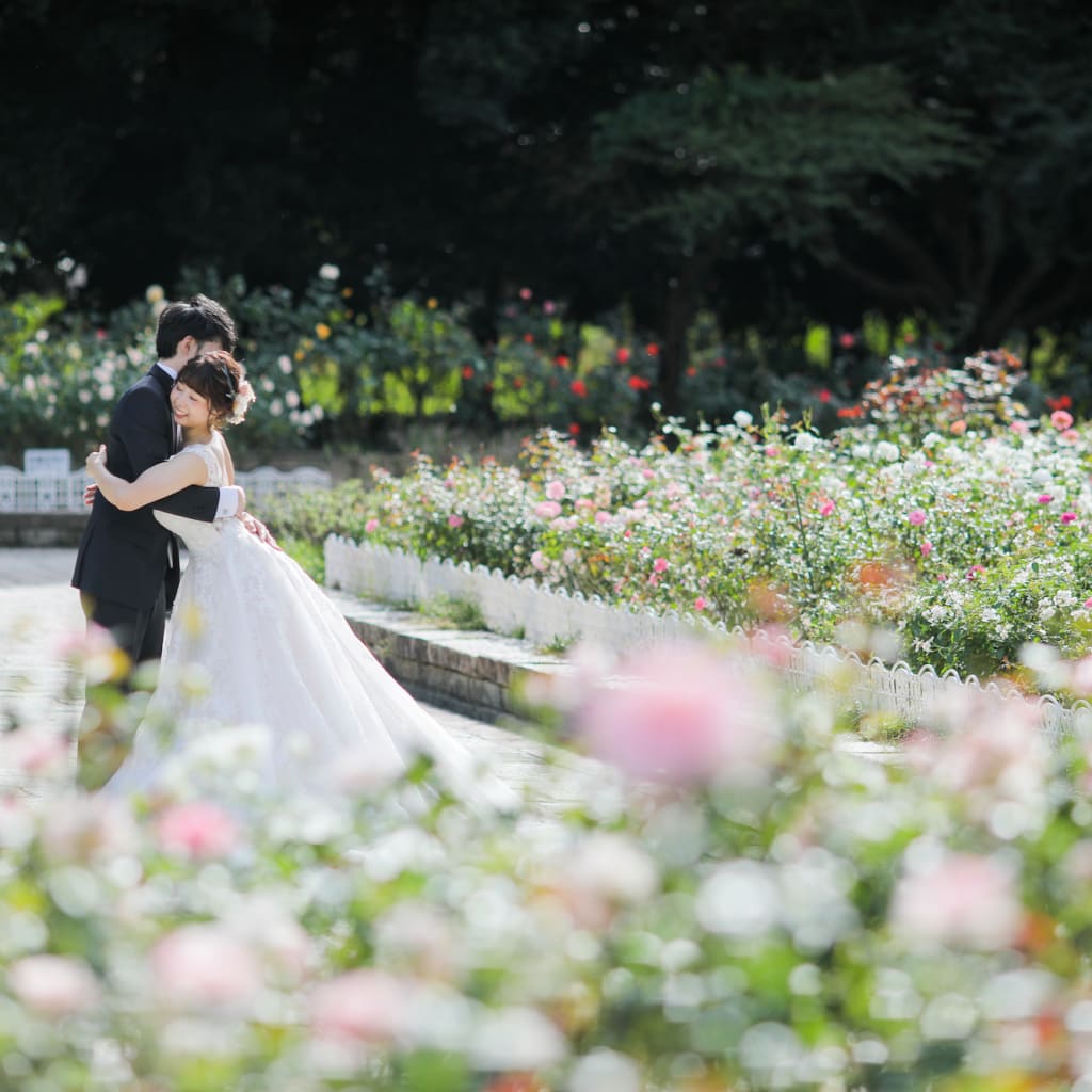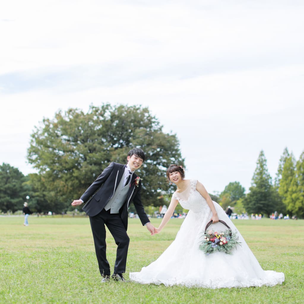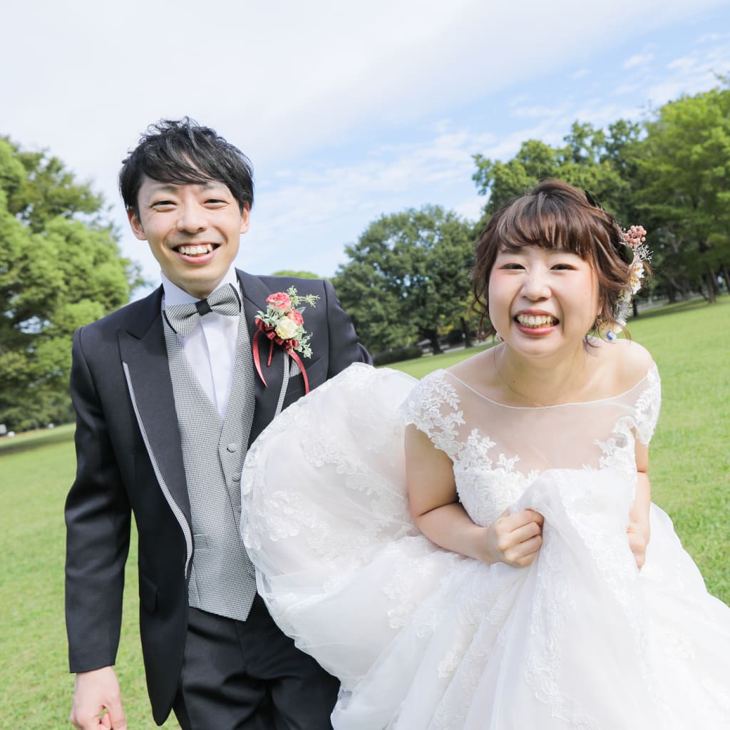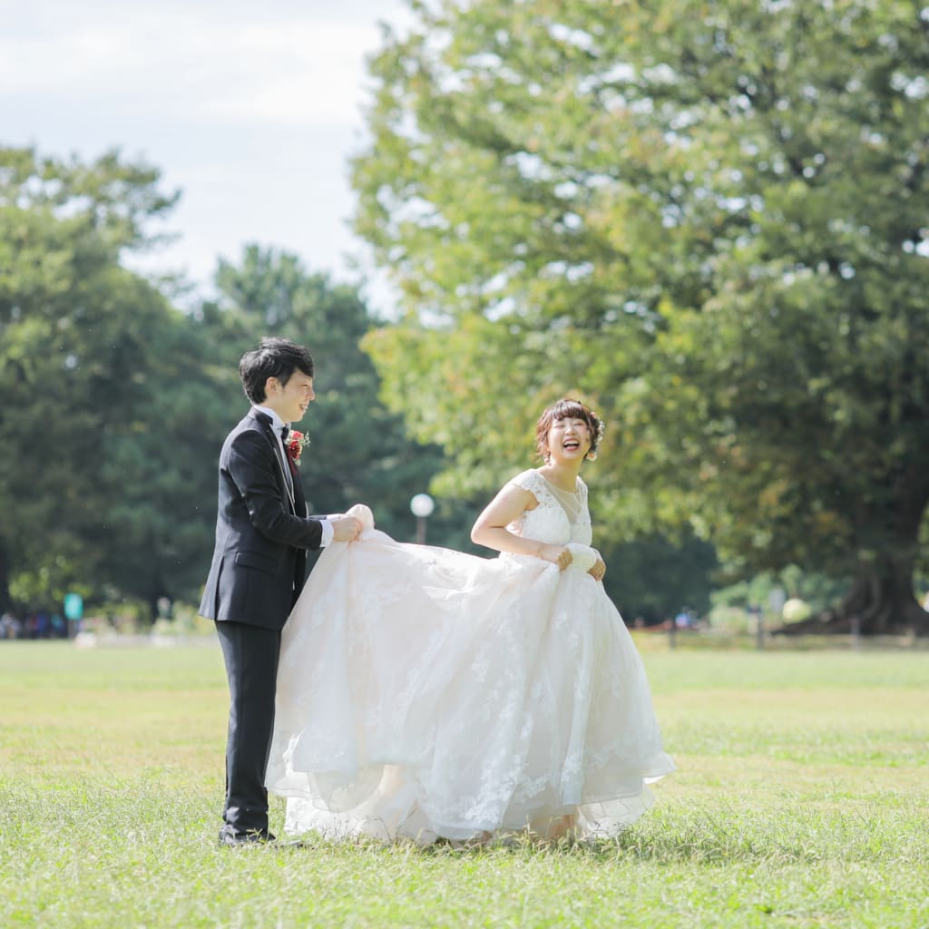 庄内川に面する緑あふれる公園で、自然体のおふたりを映す。