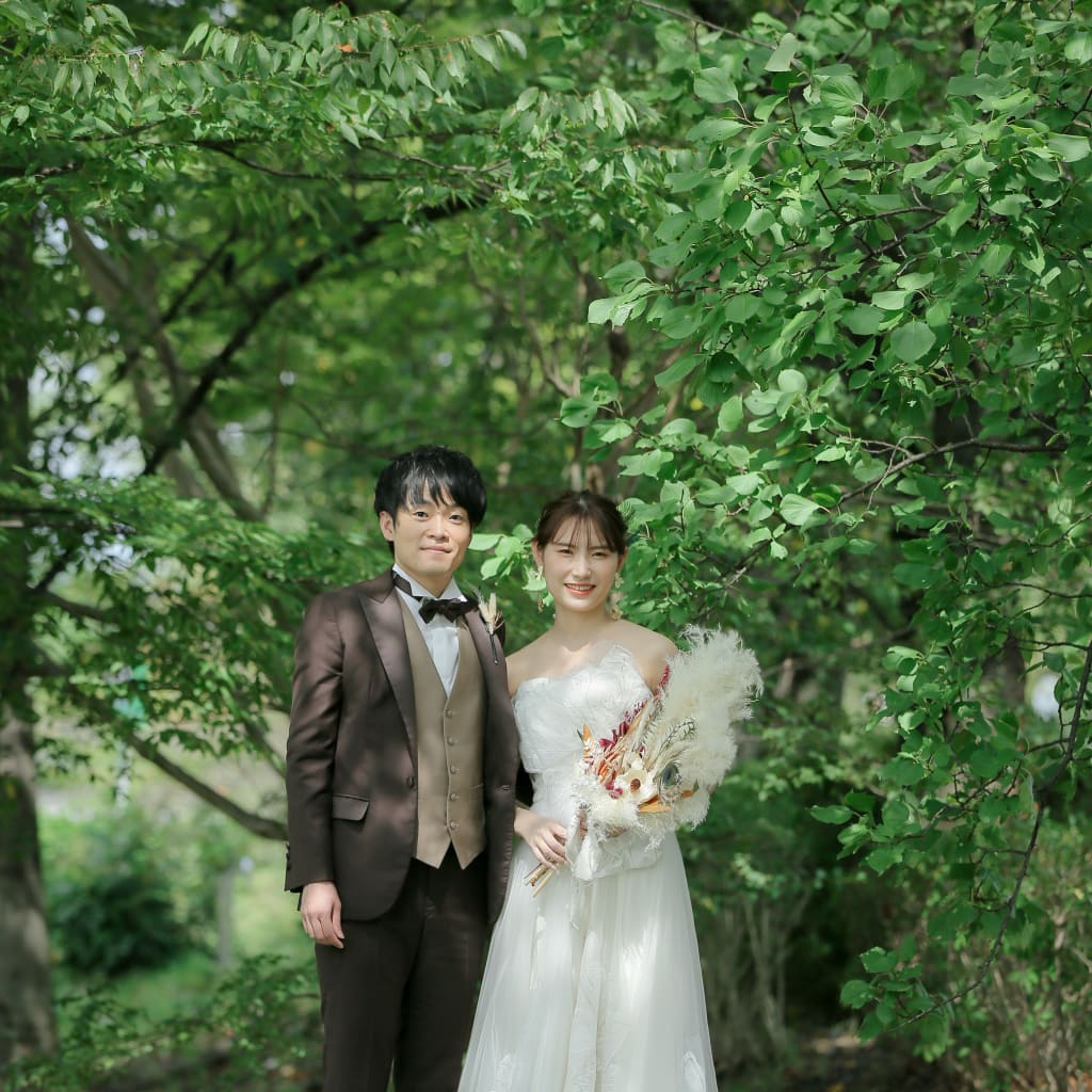 ヘアメイクと花束の中に散りばめられた赤色が可愛いです