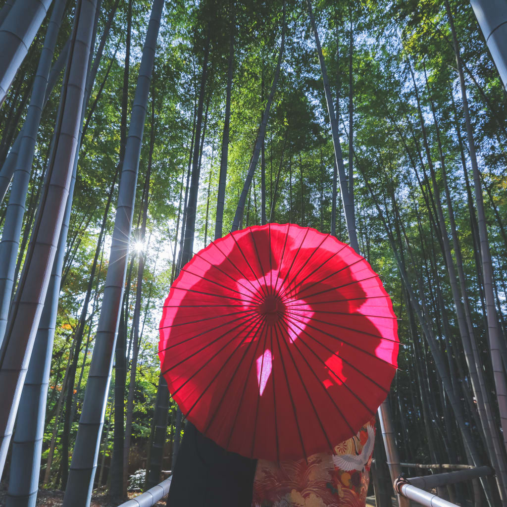 竹林の中でおふたりのシルエットを赤い番傘に映し出しました。緑に赤が映えますね。