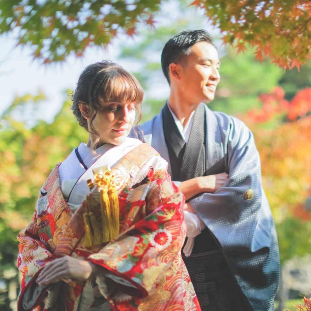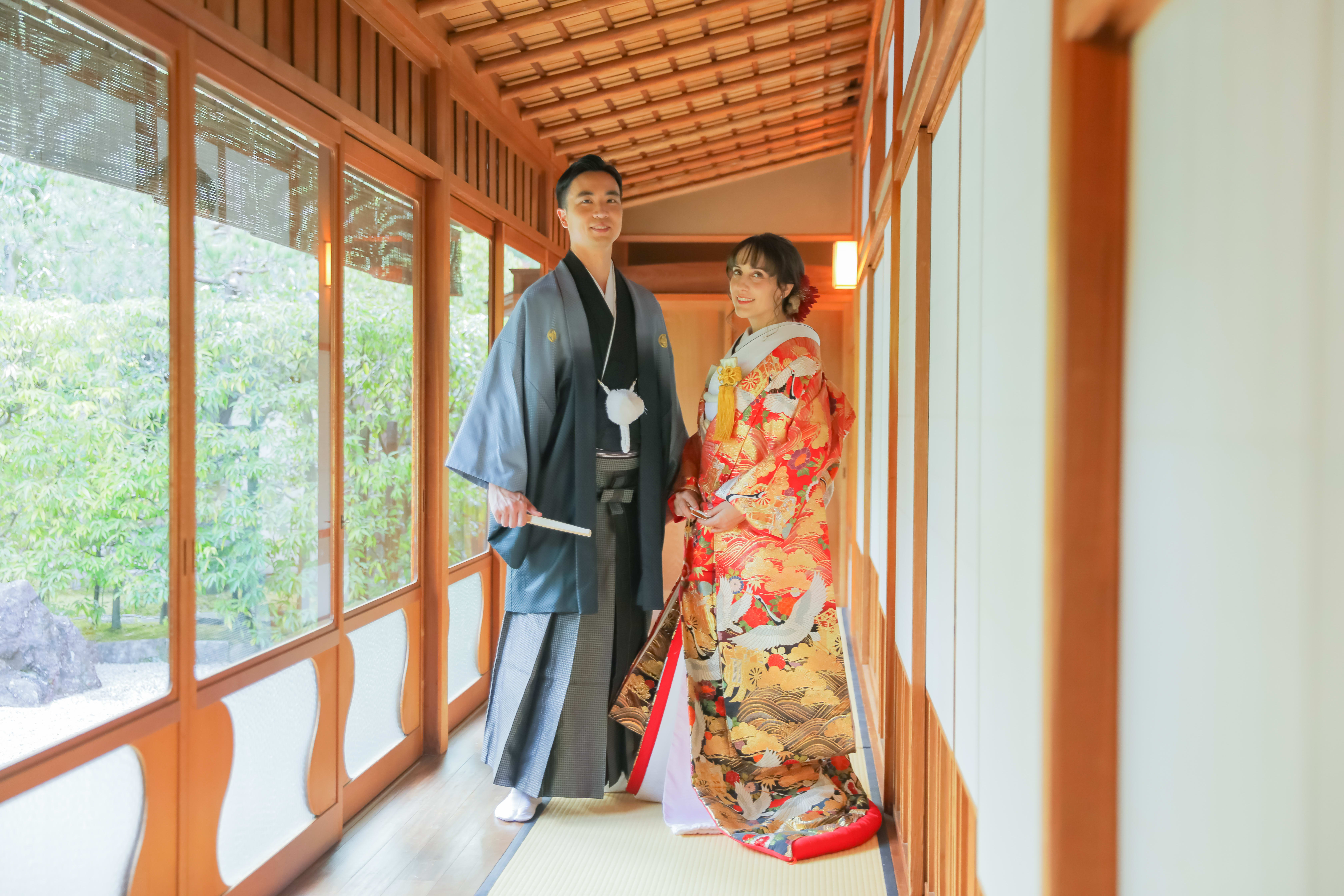 茶室の外には舞台があり庭園を見渡せます。景色と二人が映えますね。