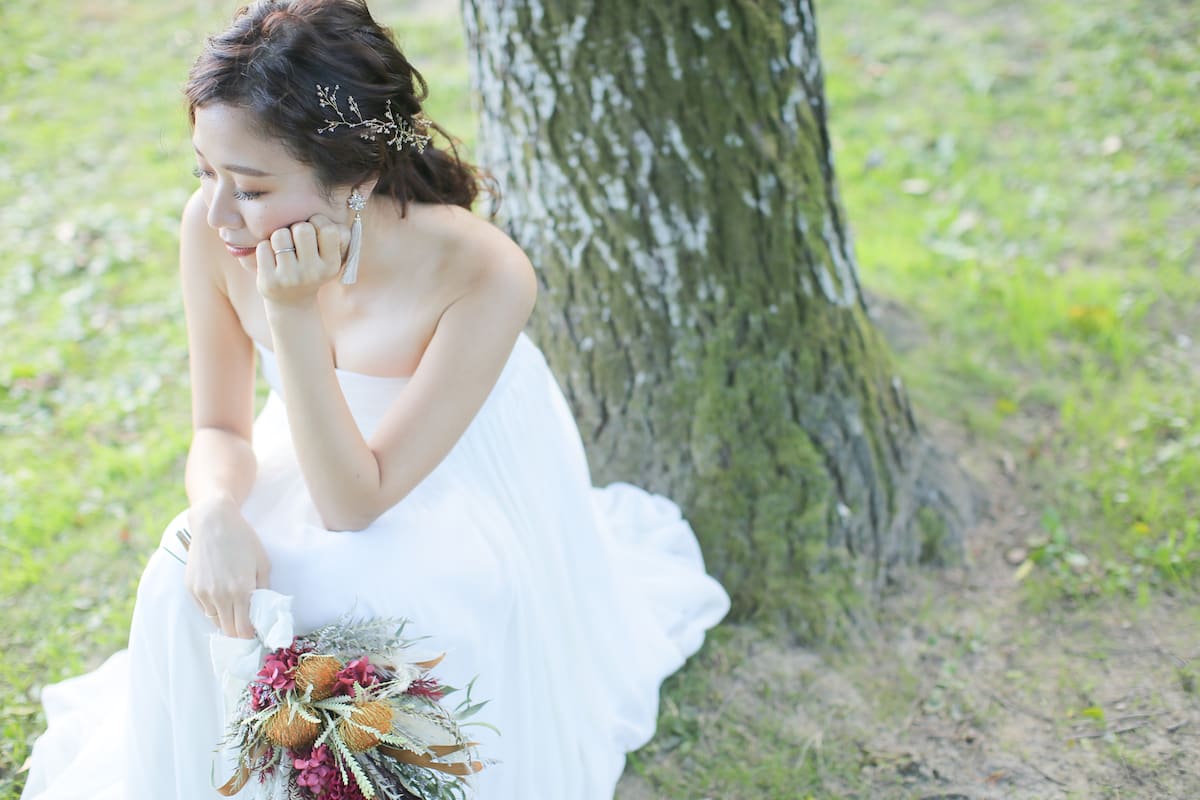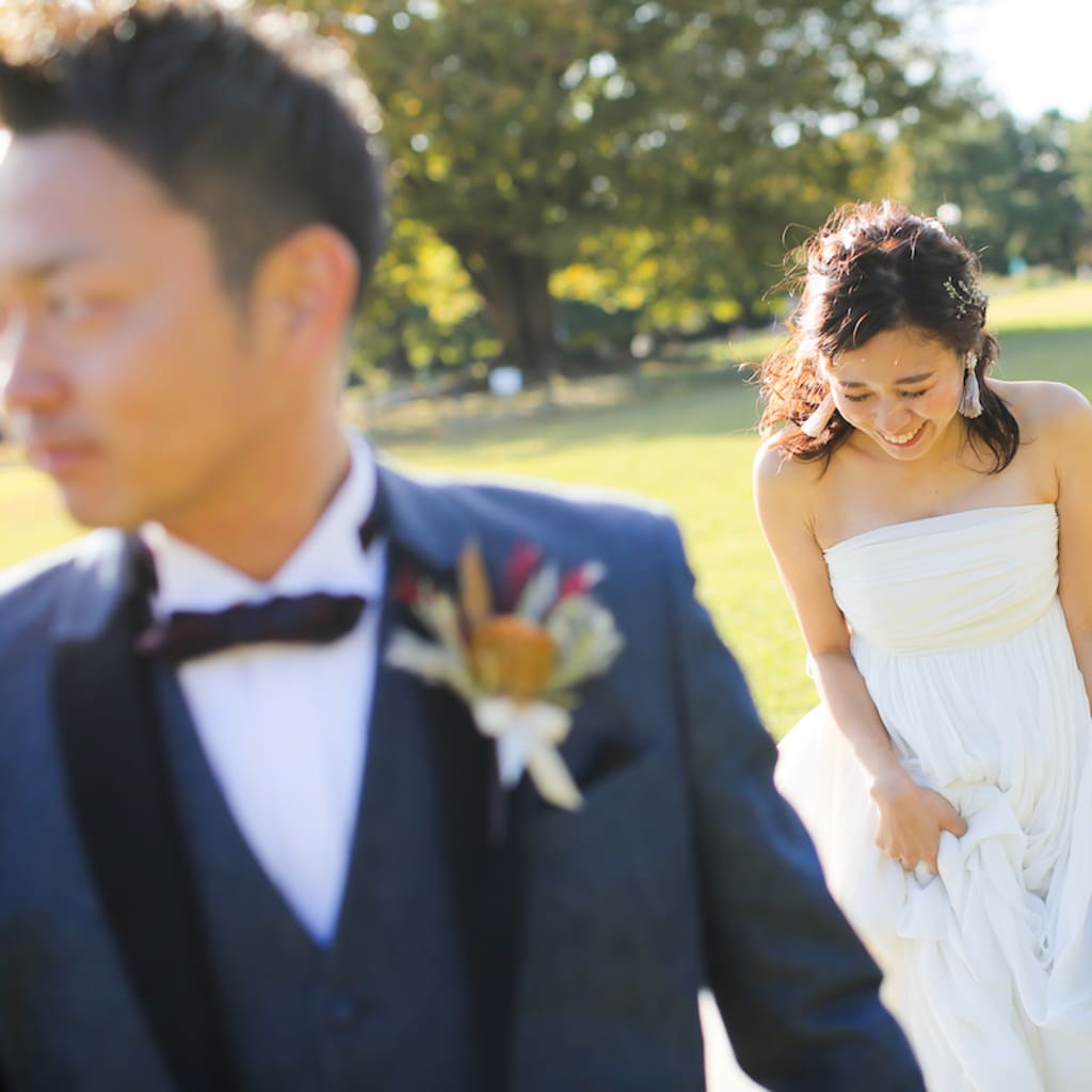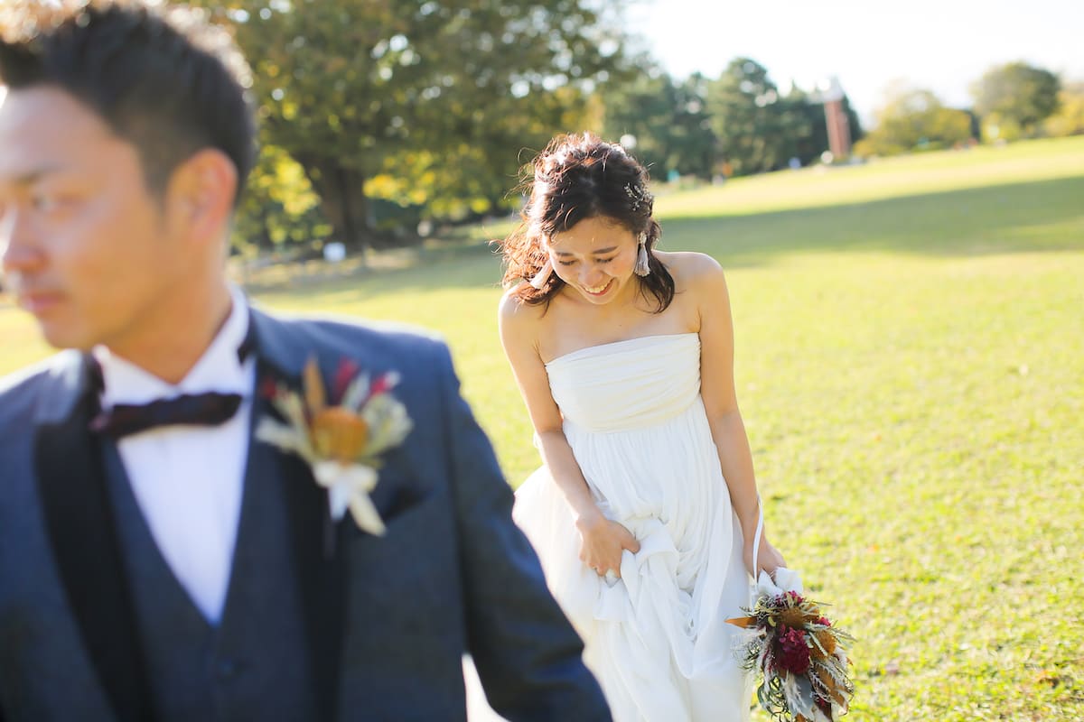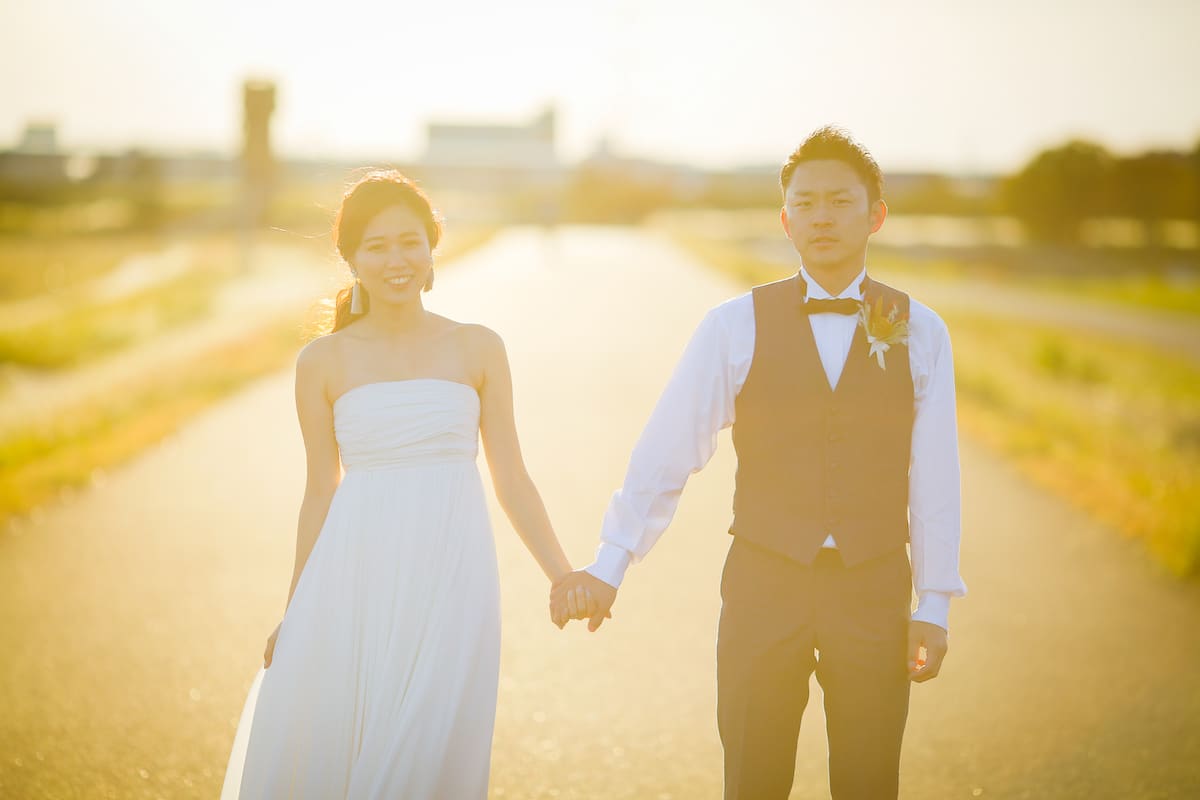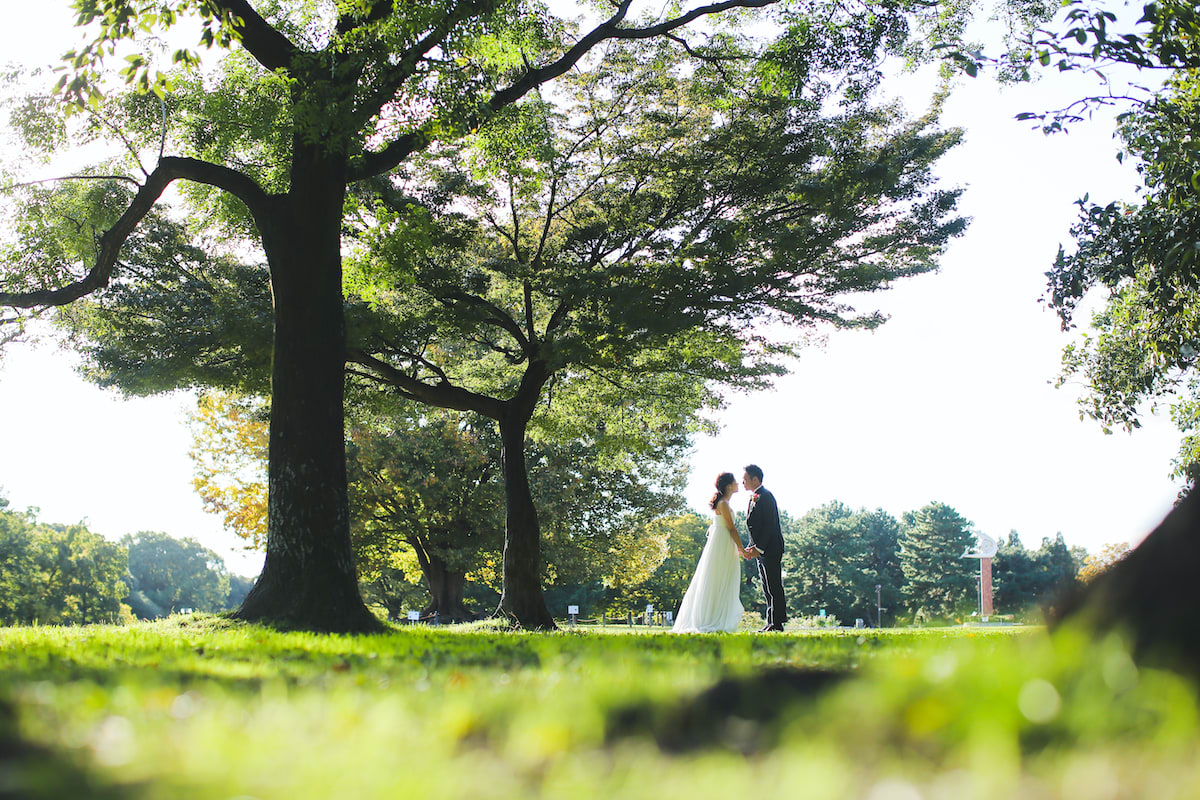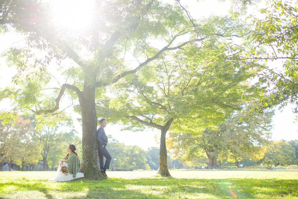 庄内川に面する緑あふれる公園で、自然体のおふたりを映す。