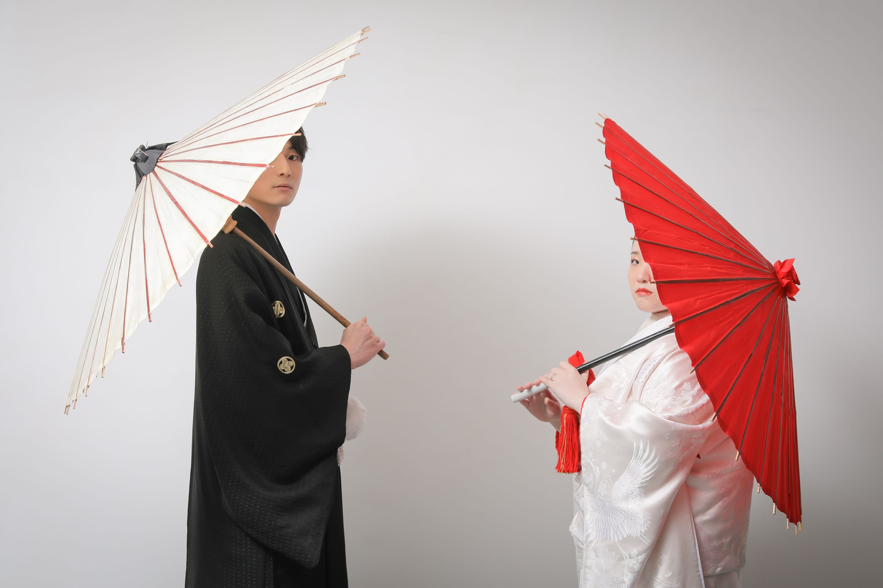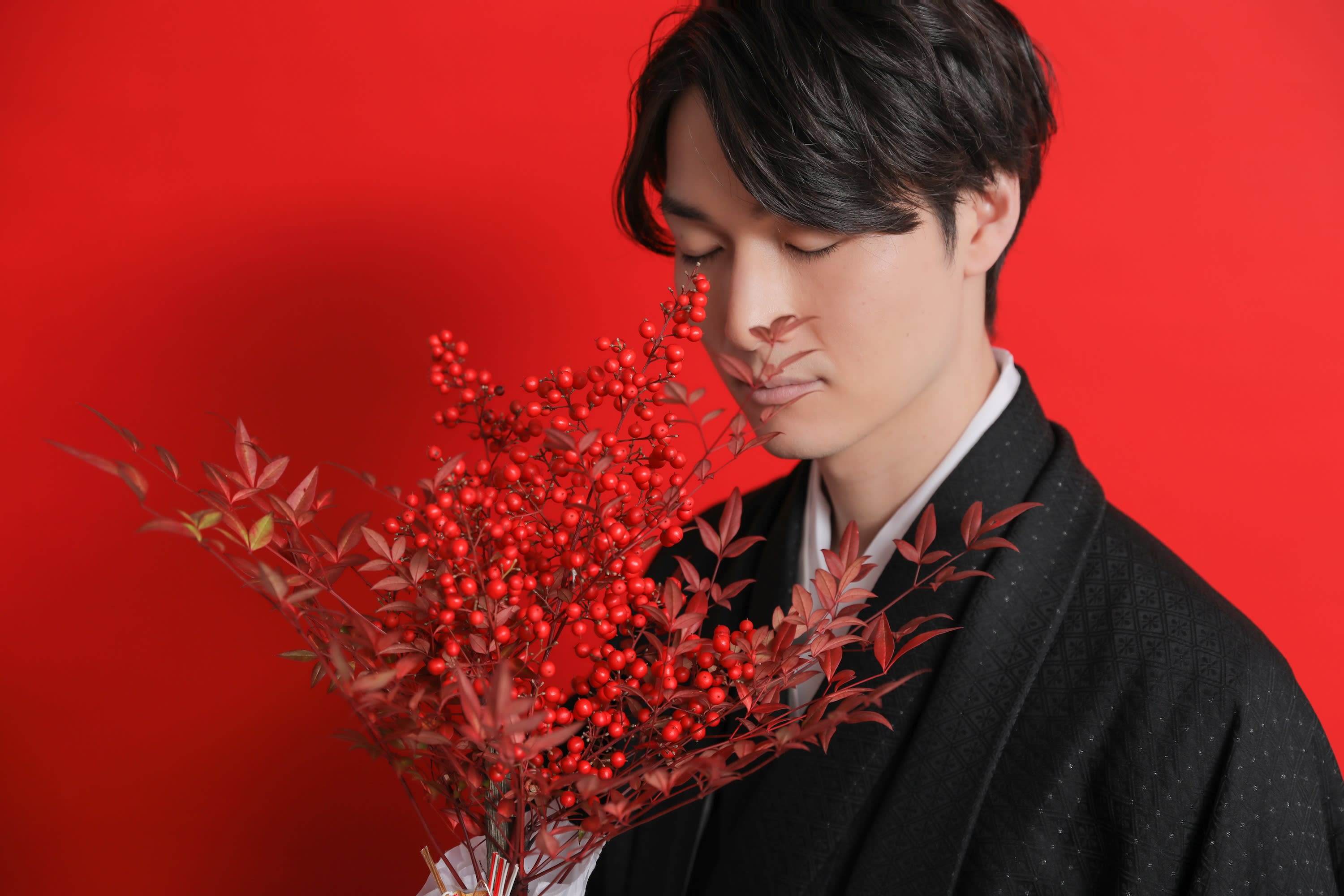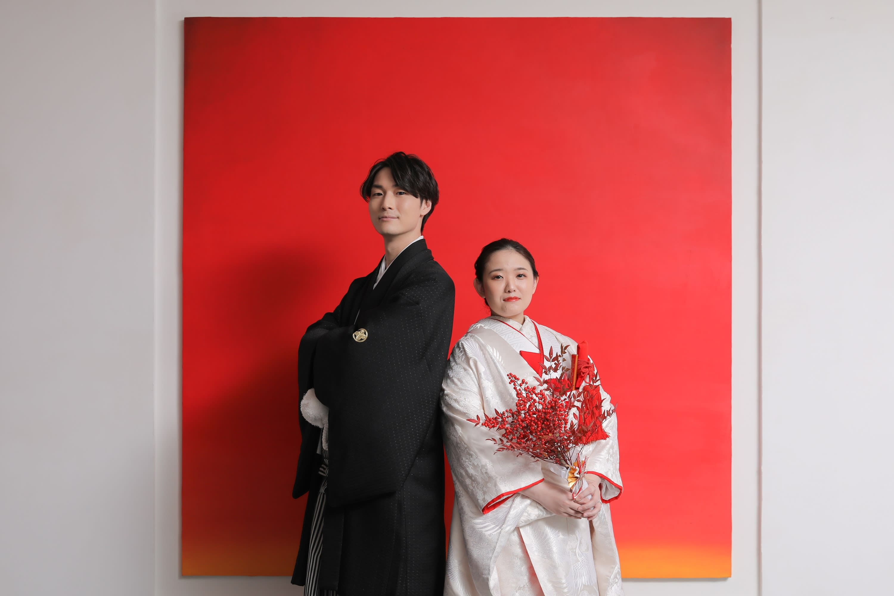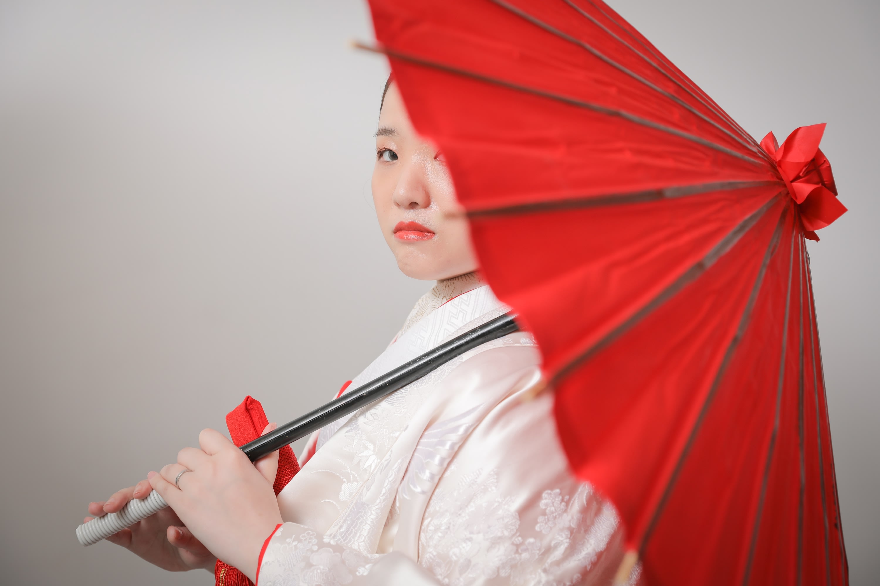 赤比翼の白無垢、赤リップ、赤い身のついたヘアアクセサリーとブーケ。白と赤、ご婚礼のお写真ならではですね。