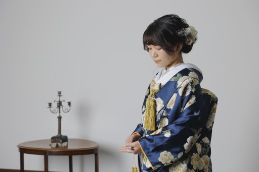 和装といえば正座のお写真ですよね!明るく演技のいい雰囲気になっていますね!