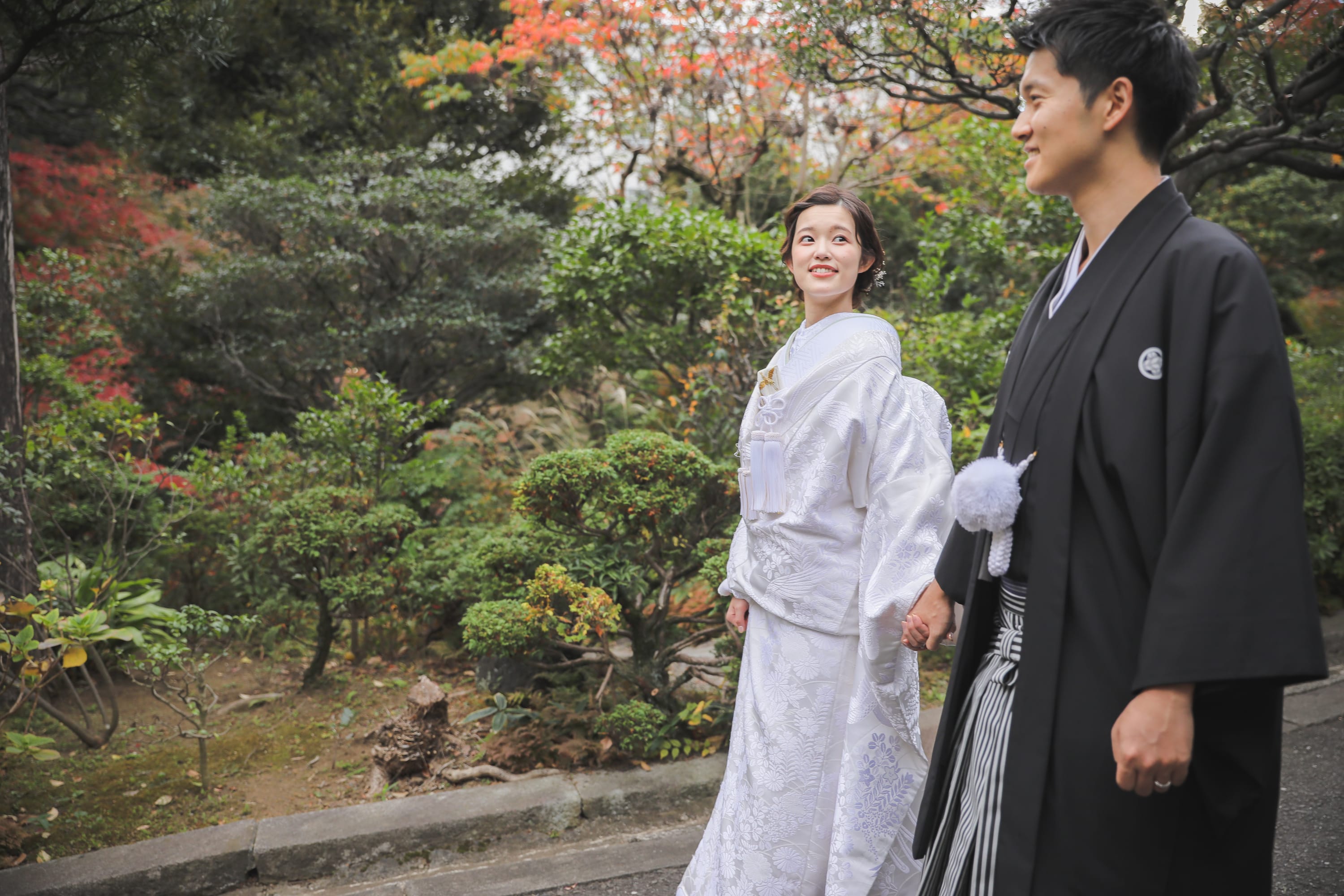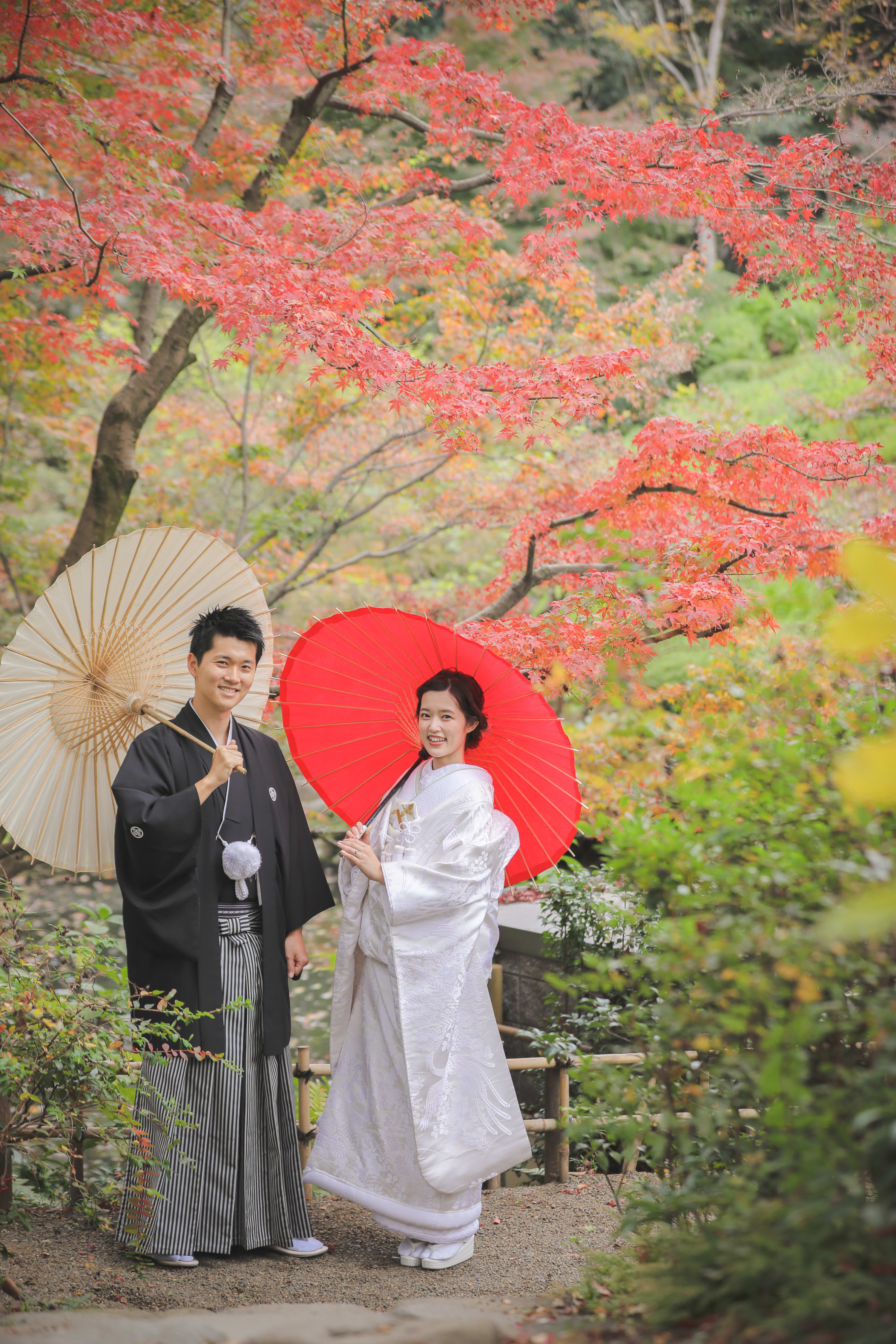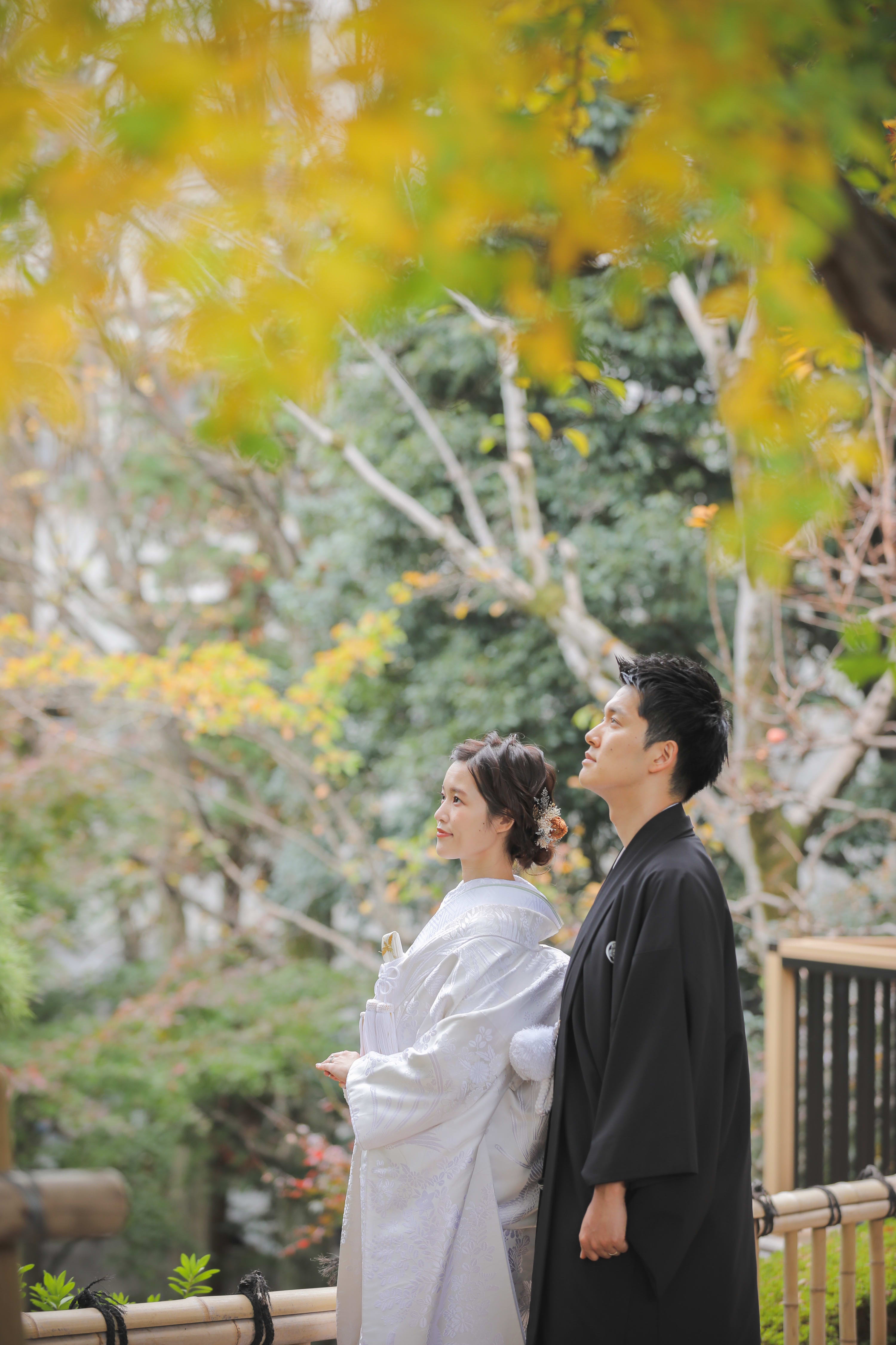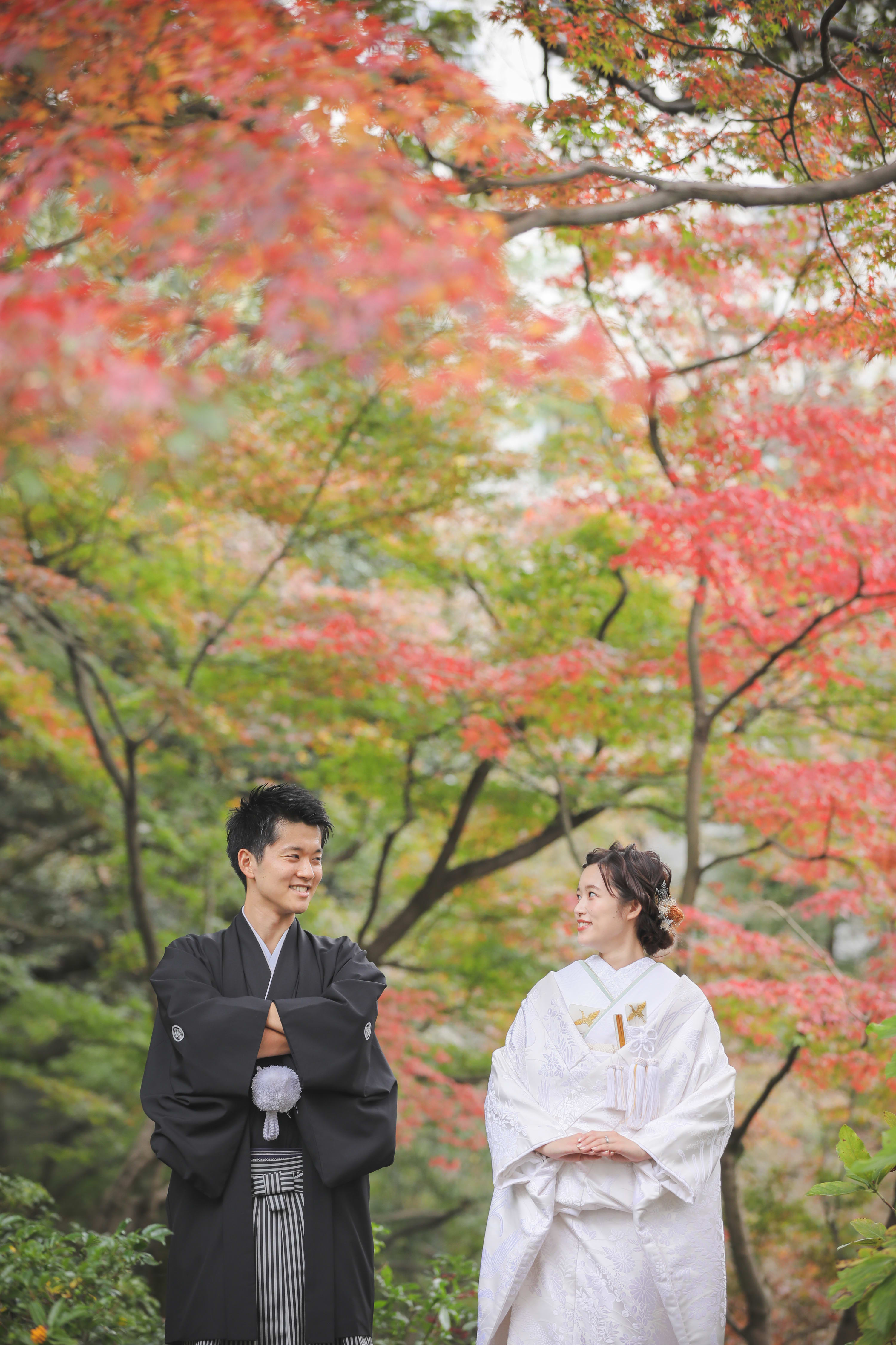 きれいな紅葉を眺めながらお散歩風に。 着物との相性もぴったりですね♪