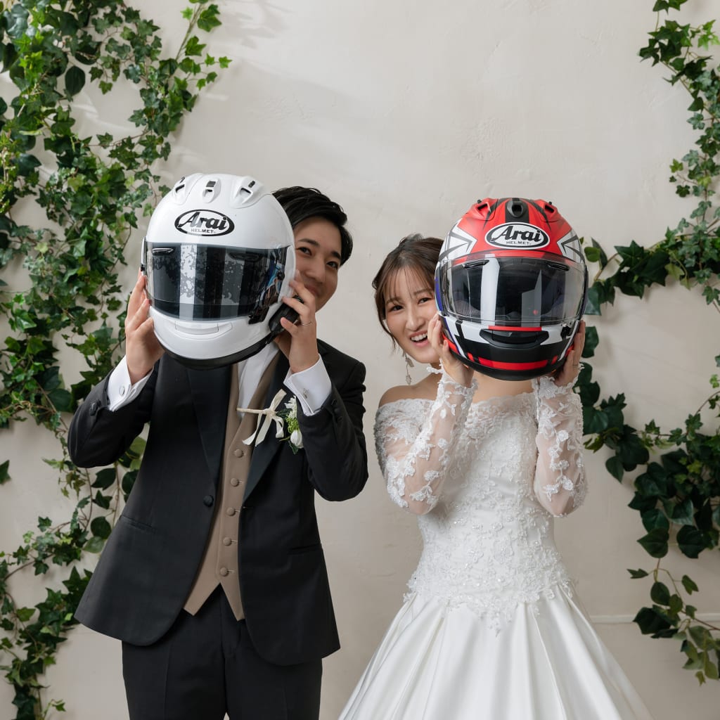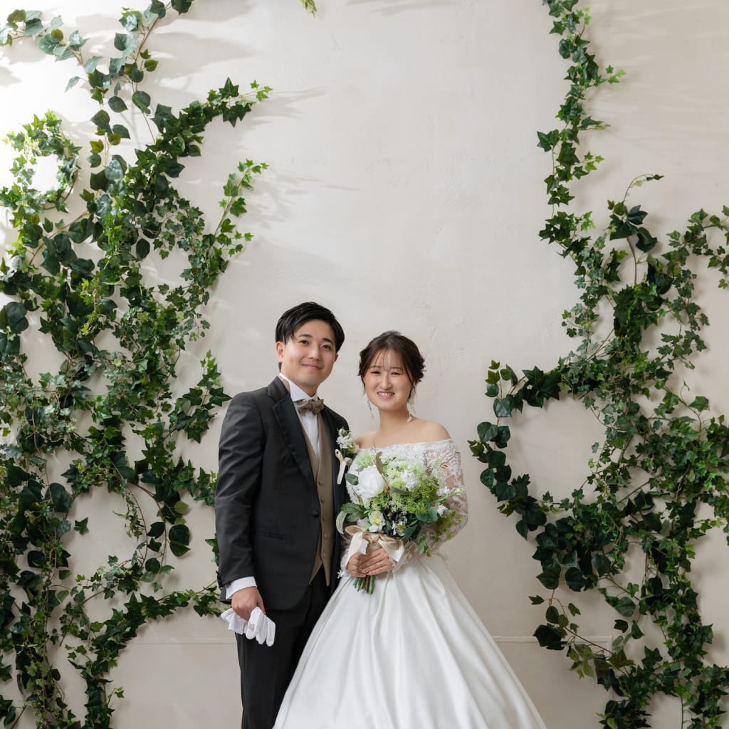 緑のアーチを使って撮影しました!お二人の見つめあった表情が素敵です!