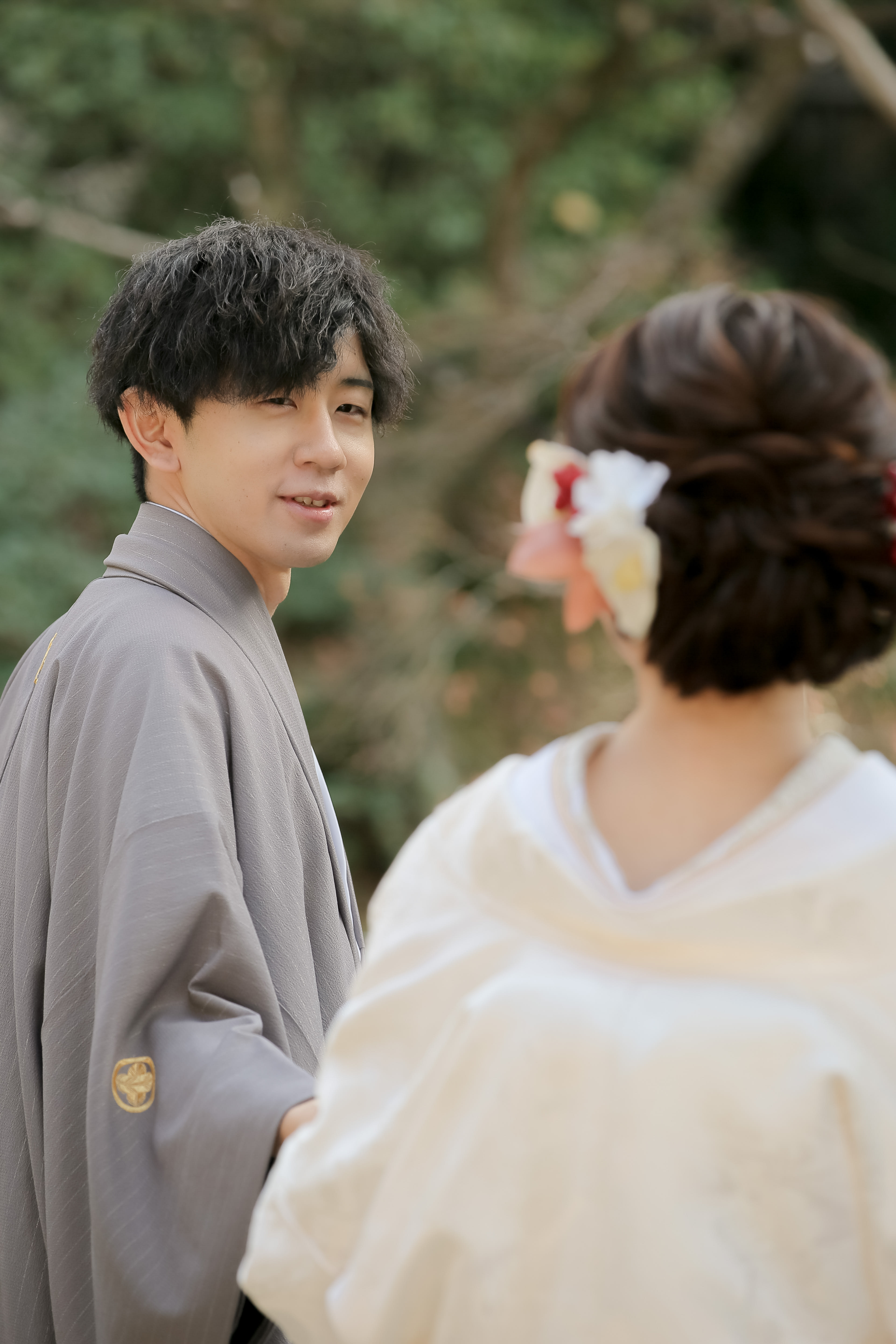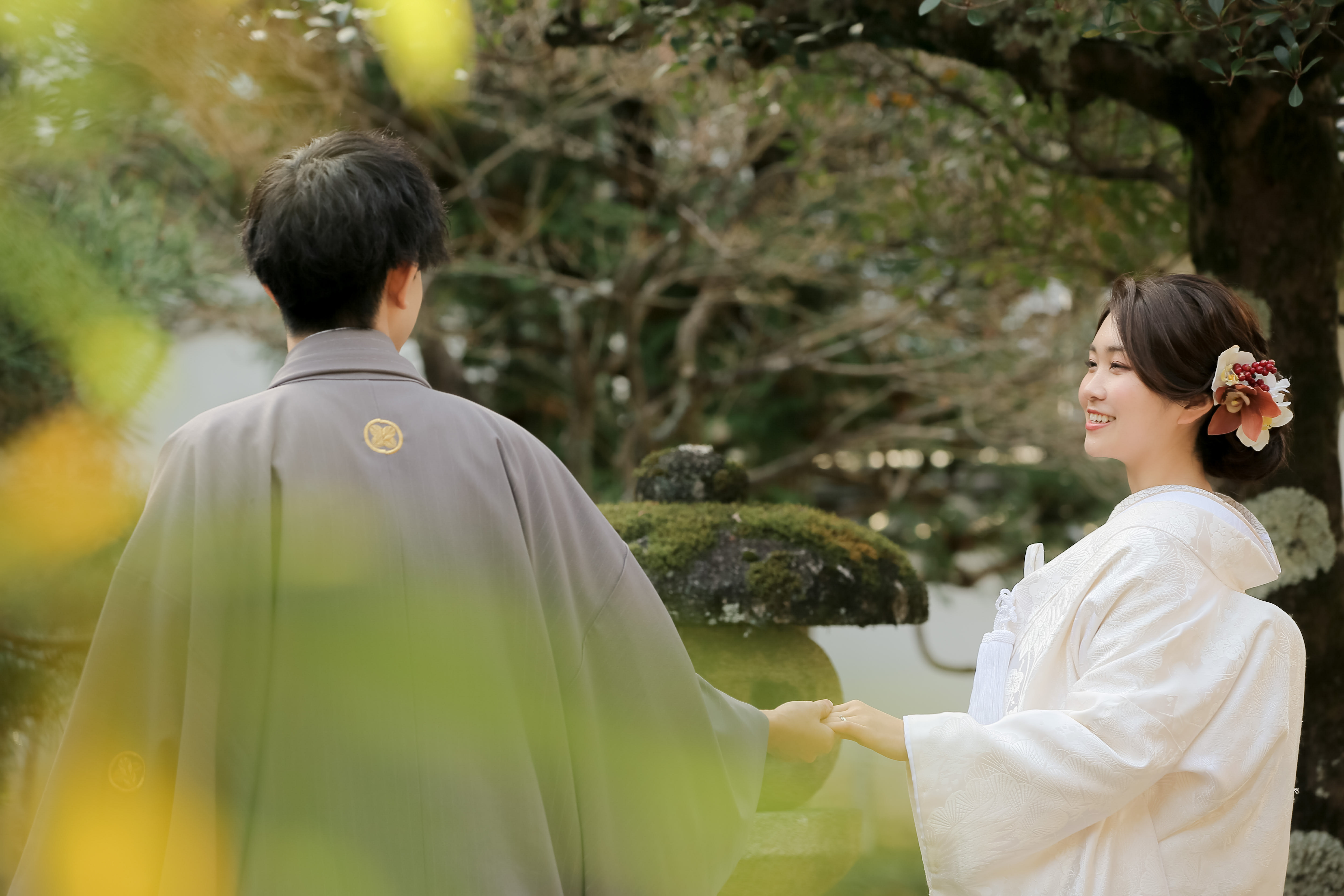 新郎様の優しいお色の紋付と白無垢がお寺の雰囲気にマッチして綺麗です◎