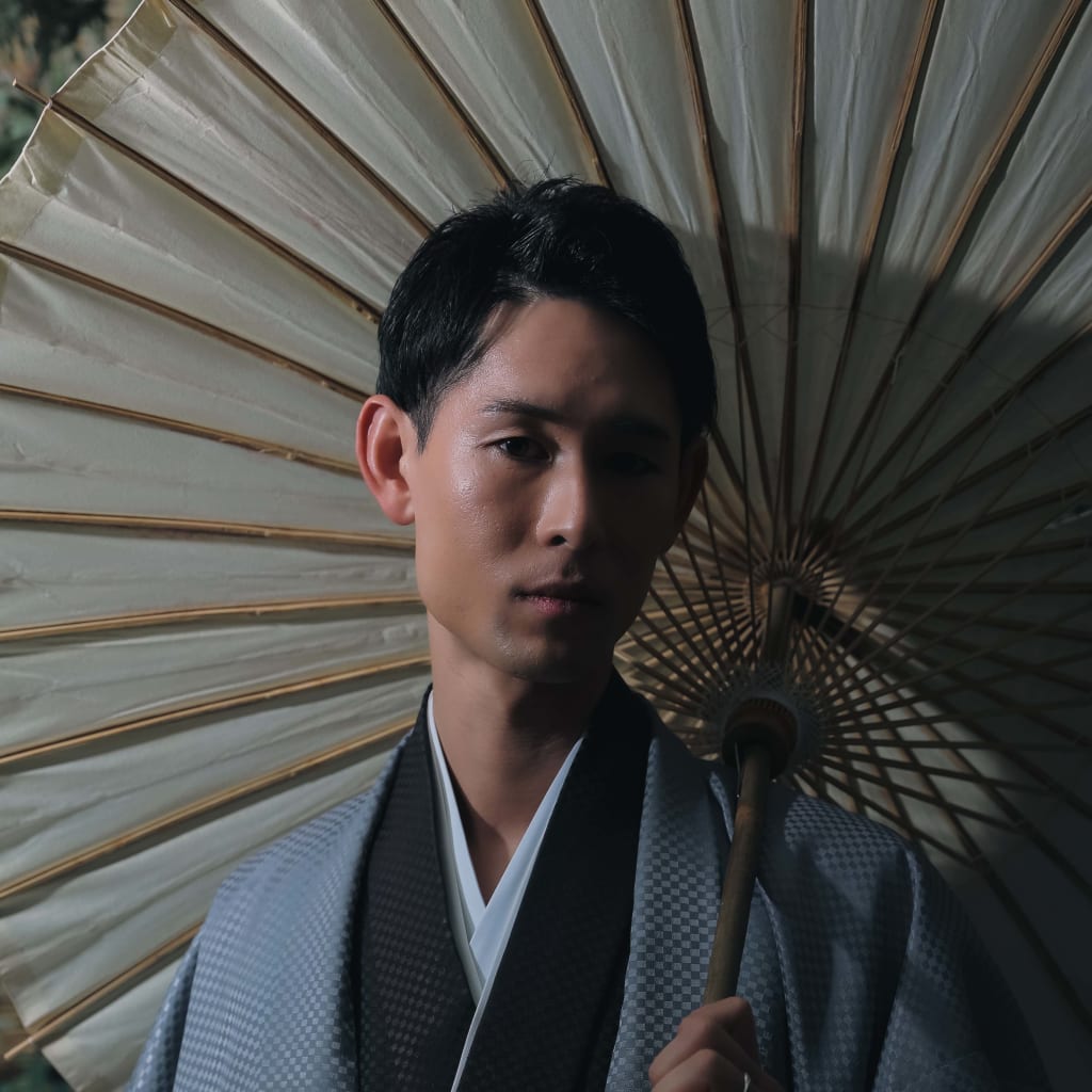 和傘を後方に倒して頂き、迫力のある構図でご新郎様をお撮りしました。
