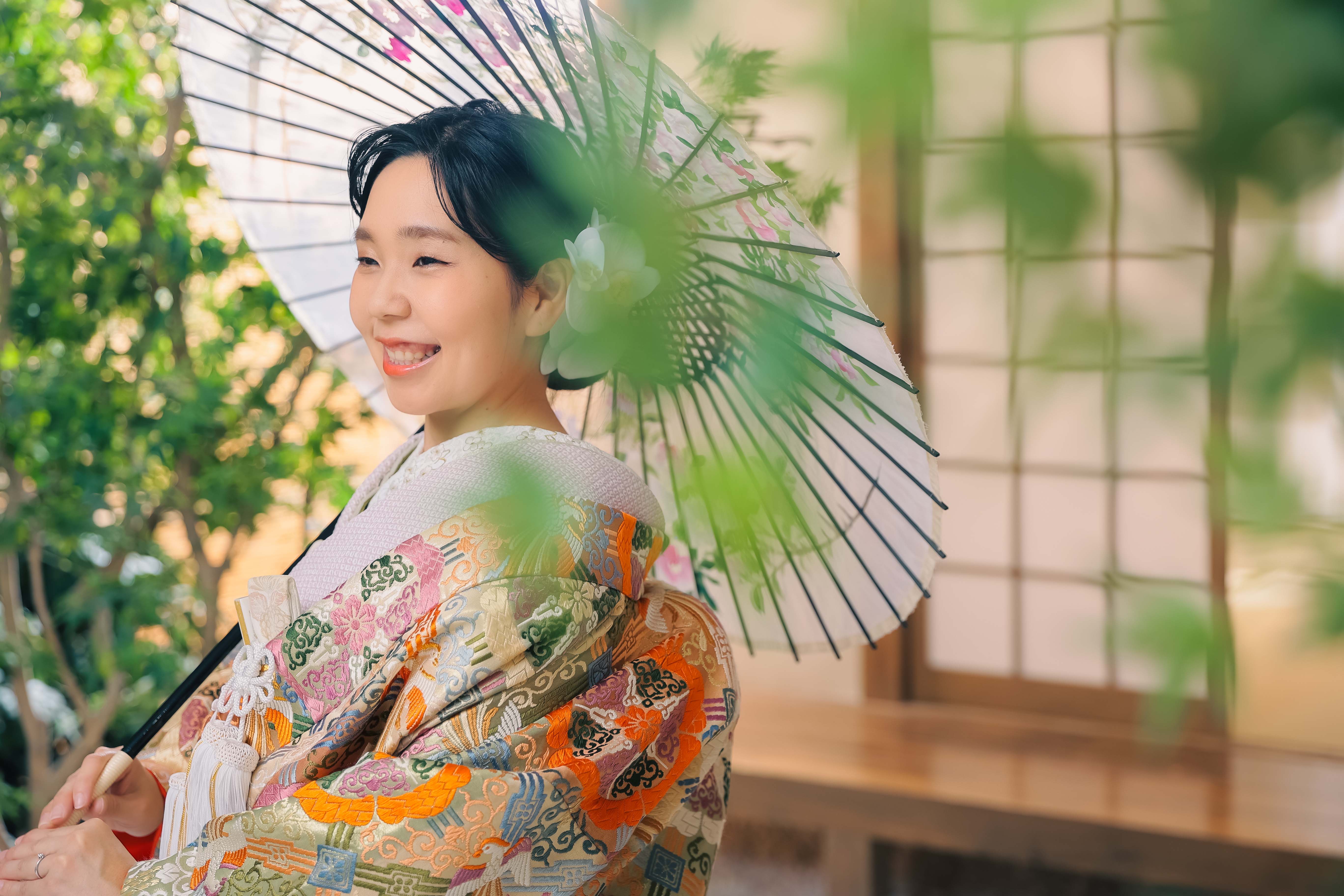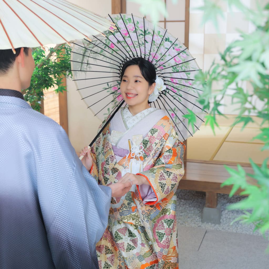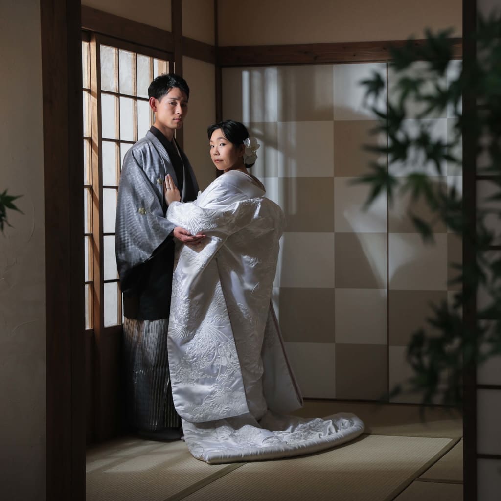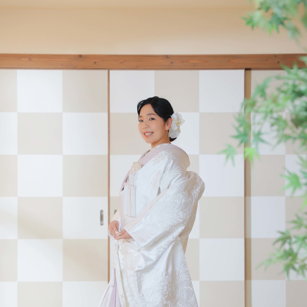 お茶室で白無垢の立ち姿。和風な雰囲気でとても雰囲気良くお写真を残して頂きました。
