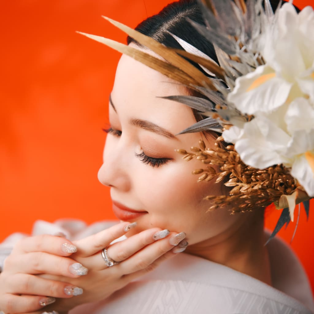 茜色の背景の中に一際美しく際立つご新婦様の横顔。ご新婦様のご希望に合わせて仕立てた大きな髪飾りがとてもお似合いでした...!♡