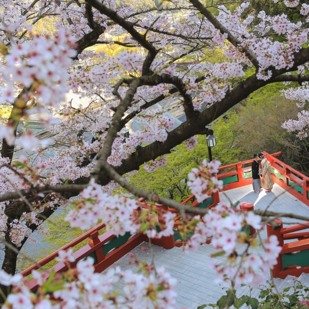 佐賀県の祐徳稲荷神社にて桜を背景にした写真は圧巻です!