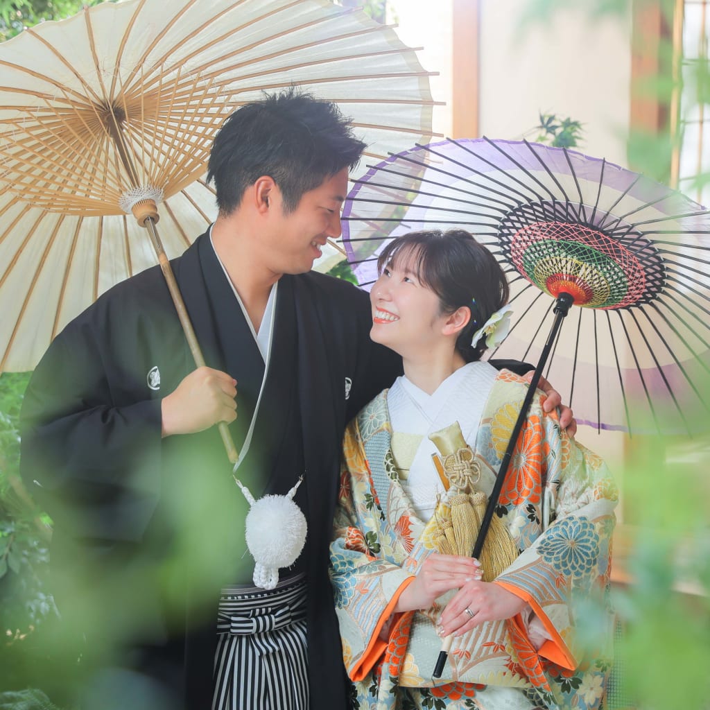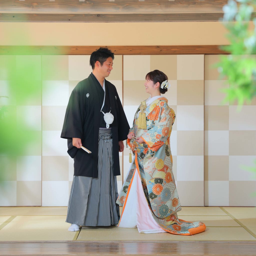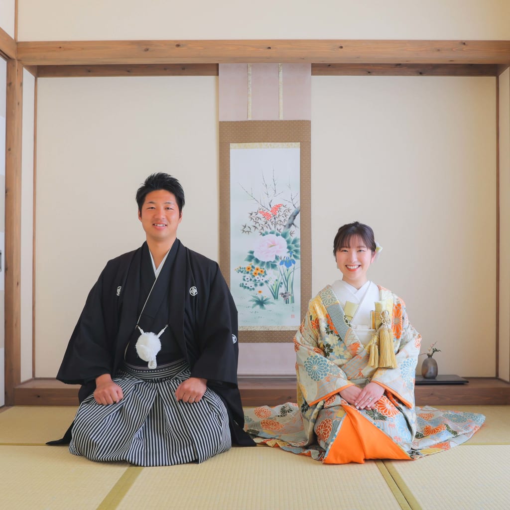 掛け軸の前での正座ショット!和装ならではの奥ゆかしいショットで、衣装の雰囲気とお二人の表情を素敵に残せます。