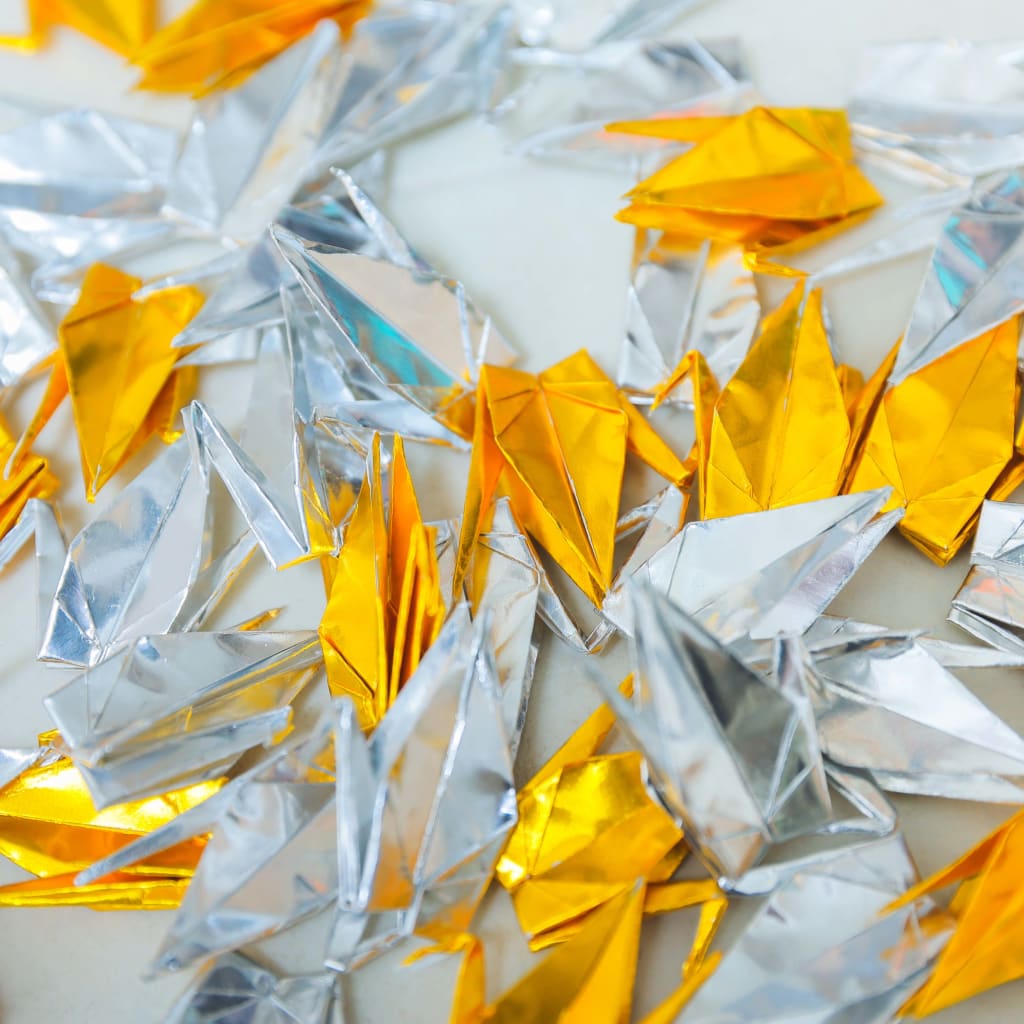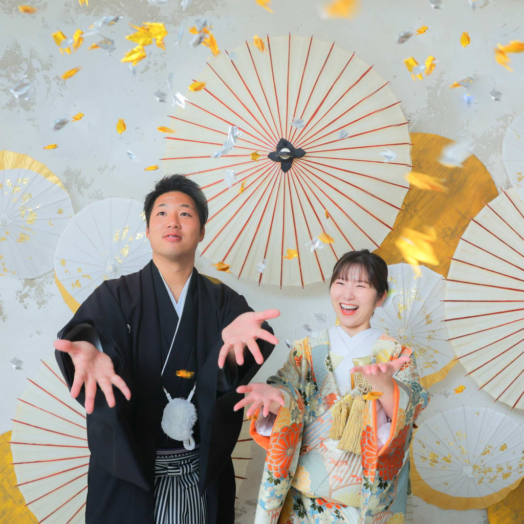 持ち込みの小物で持ってきていただいた、金と銀の折り鶴を全力で投げていただきました!一杯作っていただいた分、綺麗に散って素敵に撮影ができました!