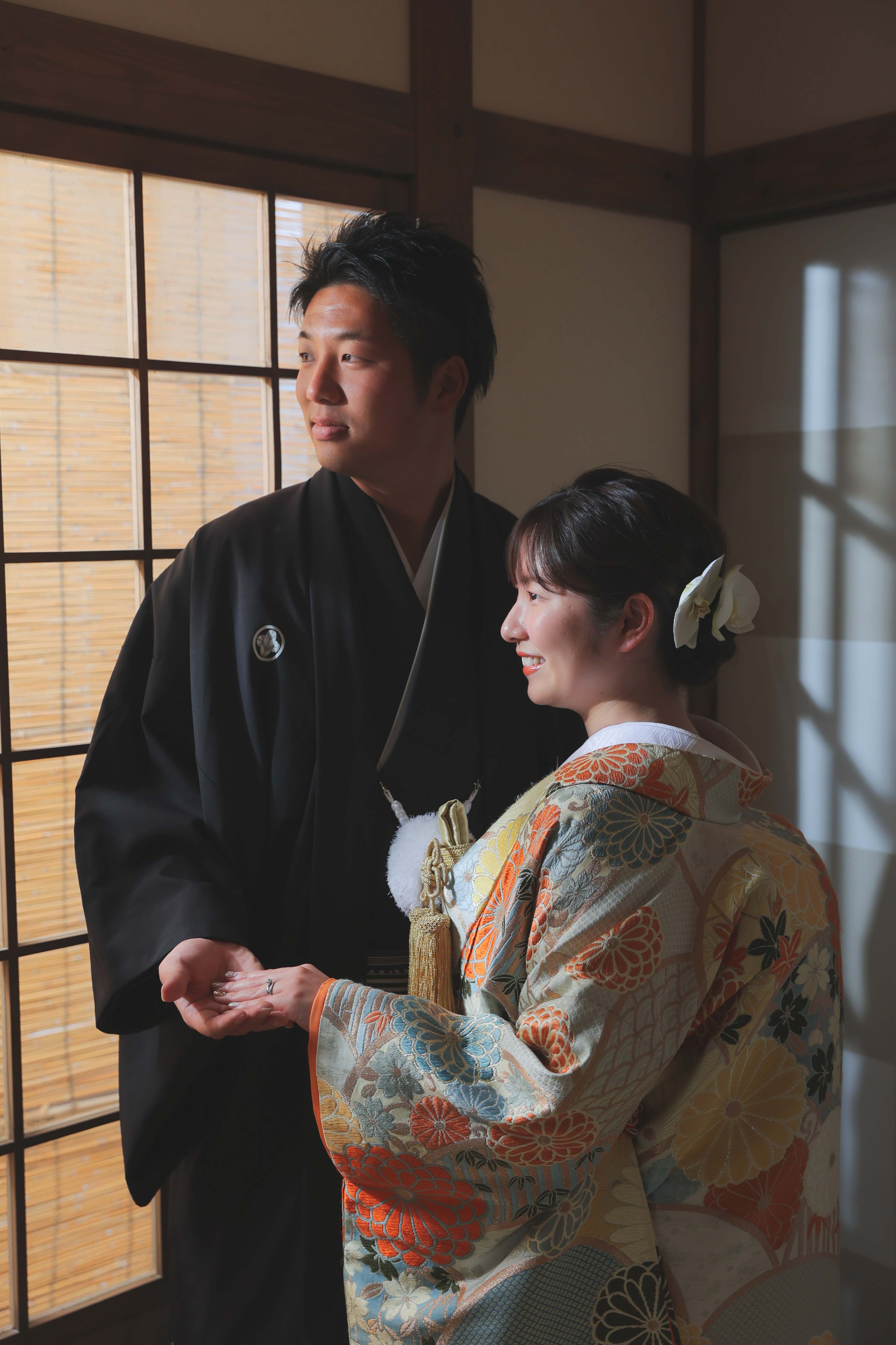 お茶室の窓際でしっとりした雰囲気で撮影させていただきました。ライティングの雰囲気で同じ場所でも雰囲気がガラリと変わります。