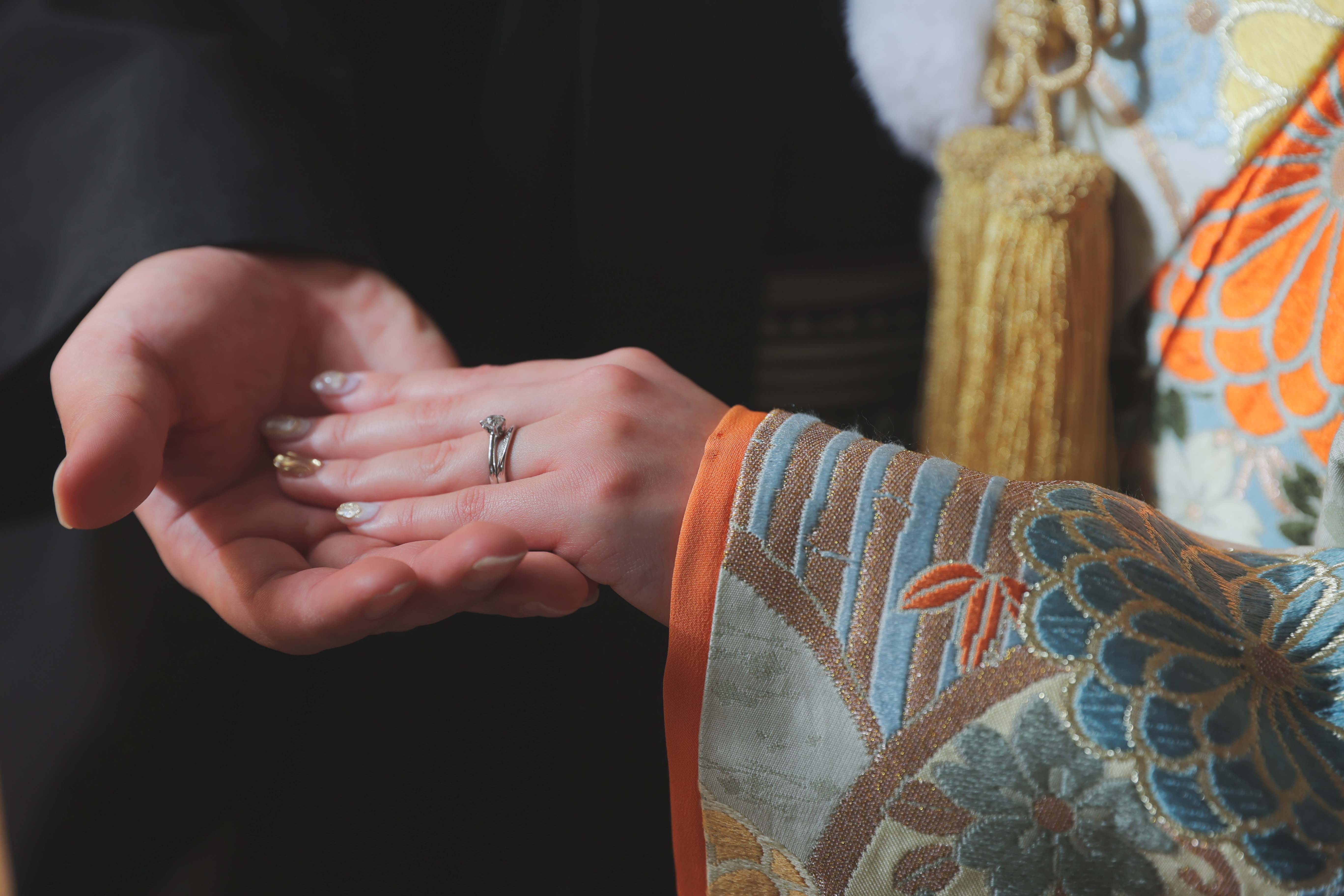 手でグーの形を作っていただき、ピントが手前に来るように前に出していただきました!きらりと光るお二人の指輪がとっても素敵でした!