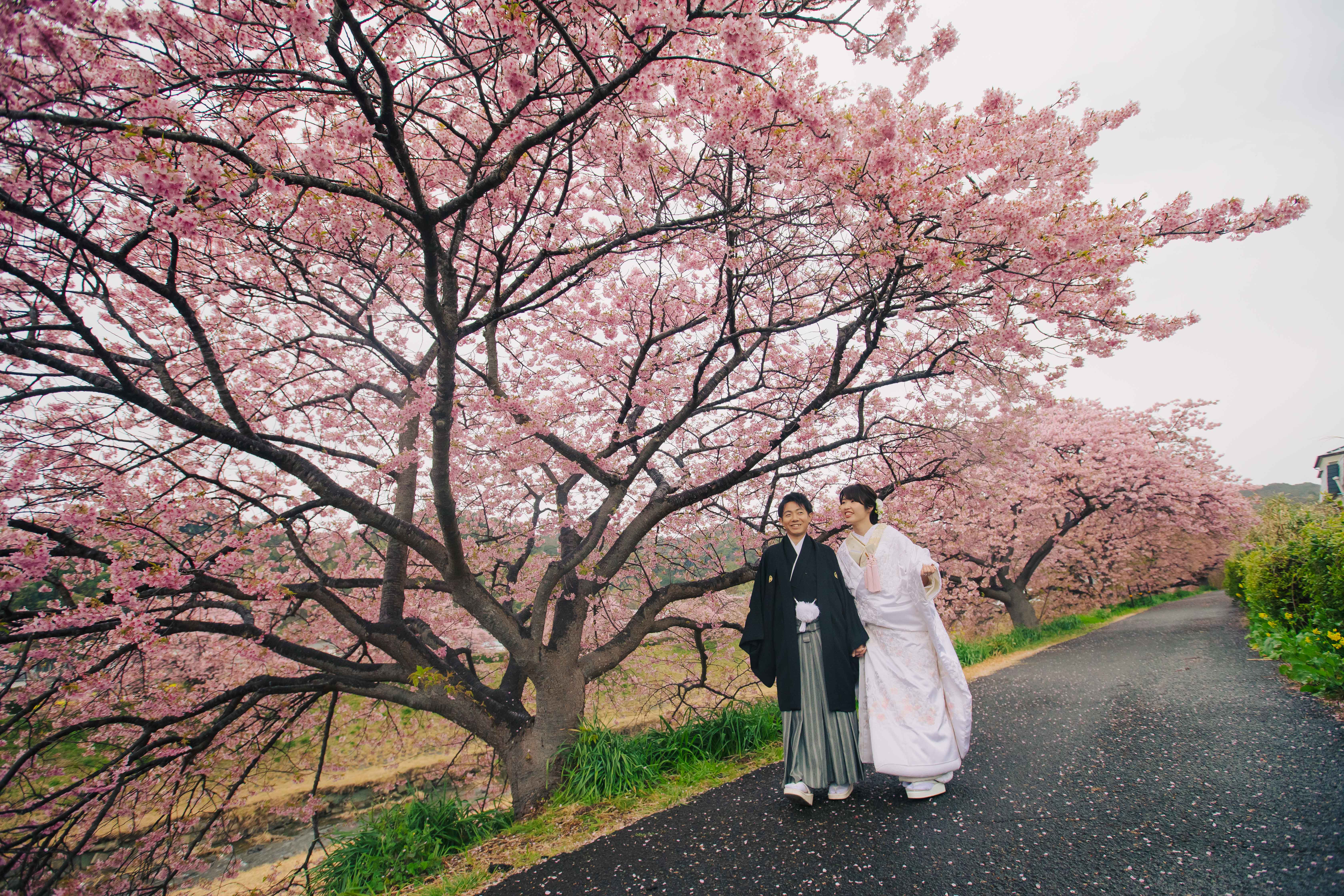 大人気の河津桜と周辺寺社で和にふさわしい結婚写真を