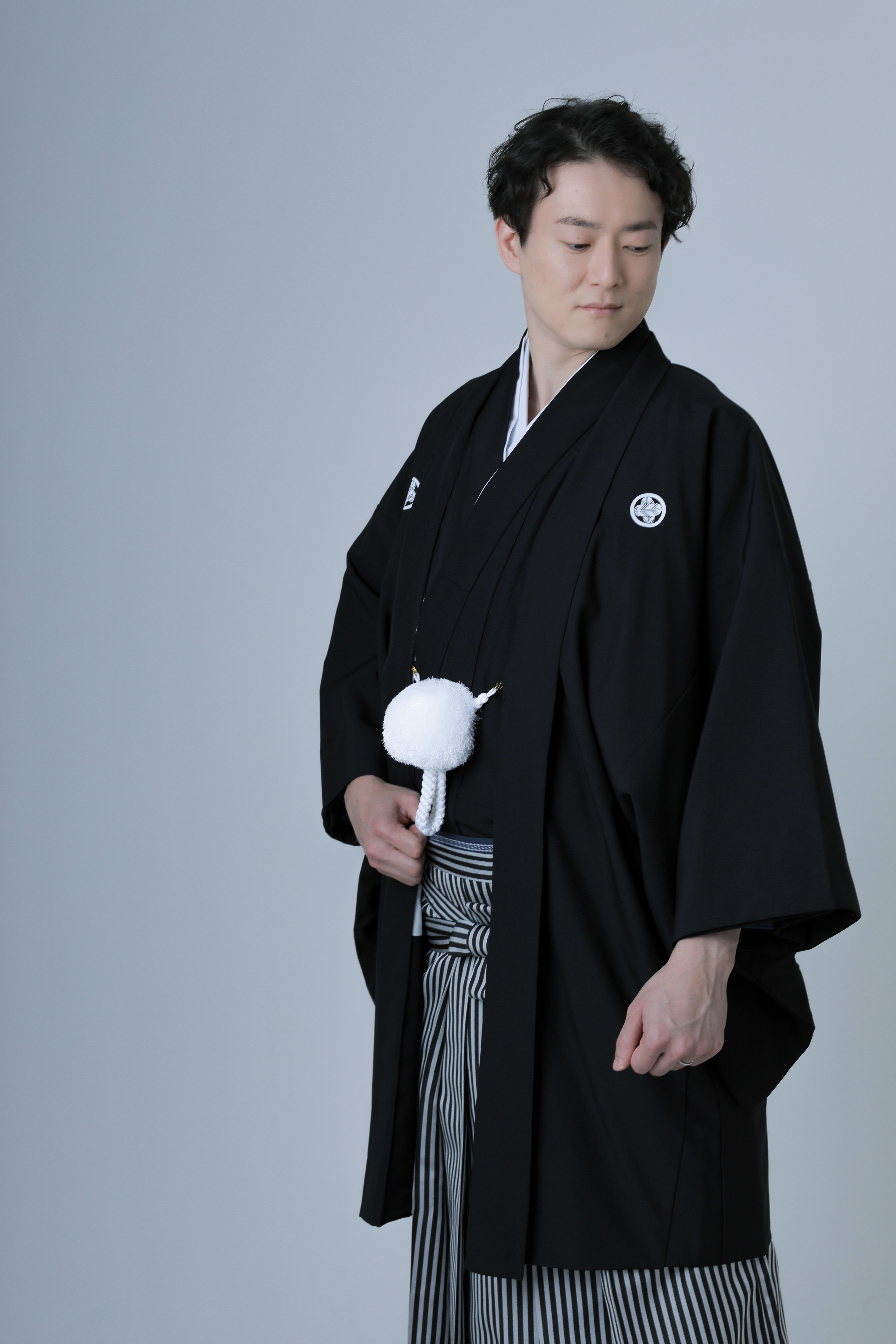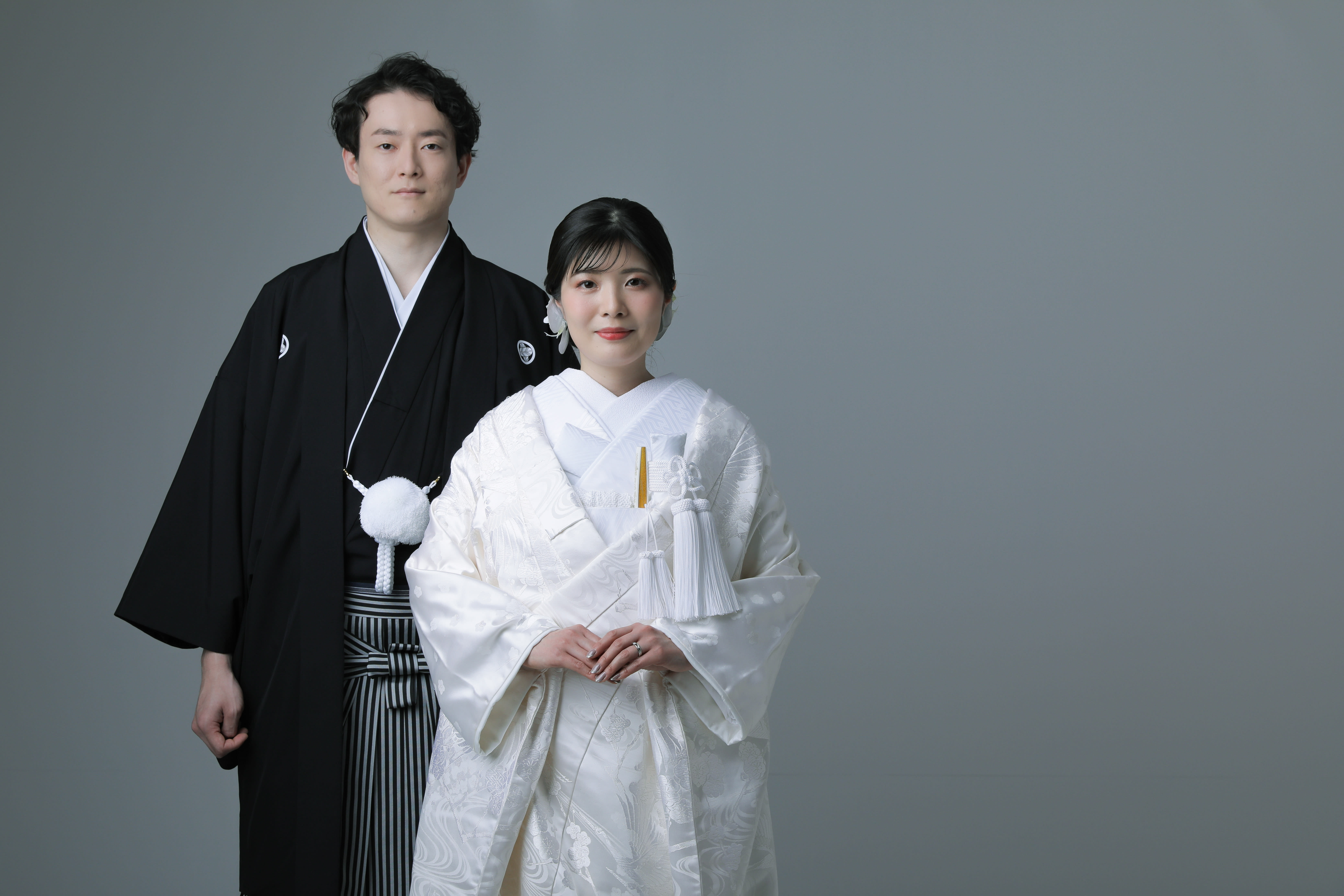 寄り添う新郎様も黒でコントラストをつけて頂くと、シンプルな背景でお互いを引き立て合います。