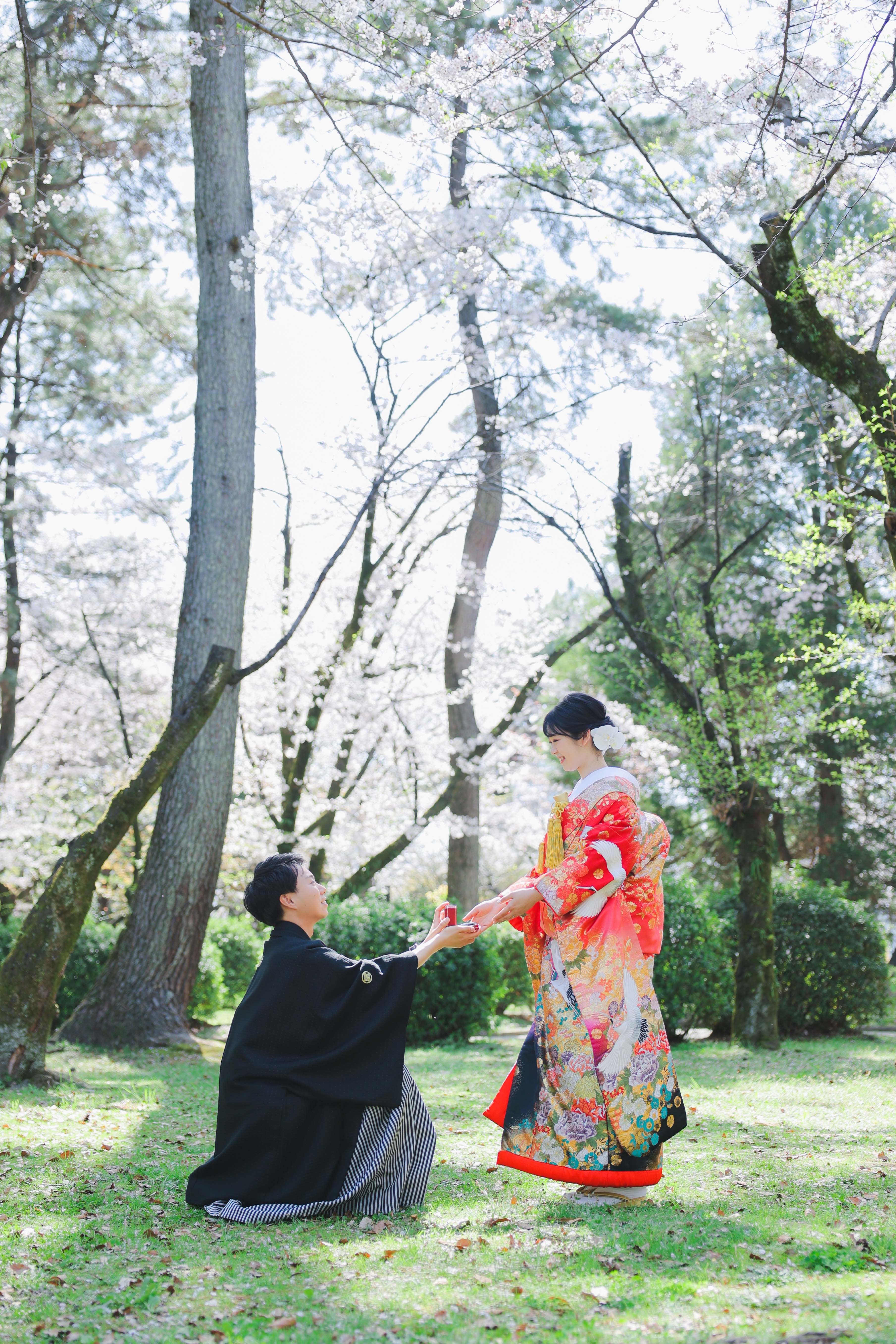 ピンク色に色づいたしだれ桜と、お二人の優しくてにこやかな表情がとても華やかで素敵でした!