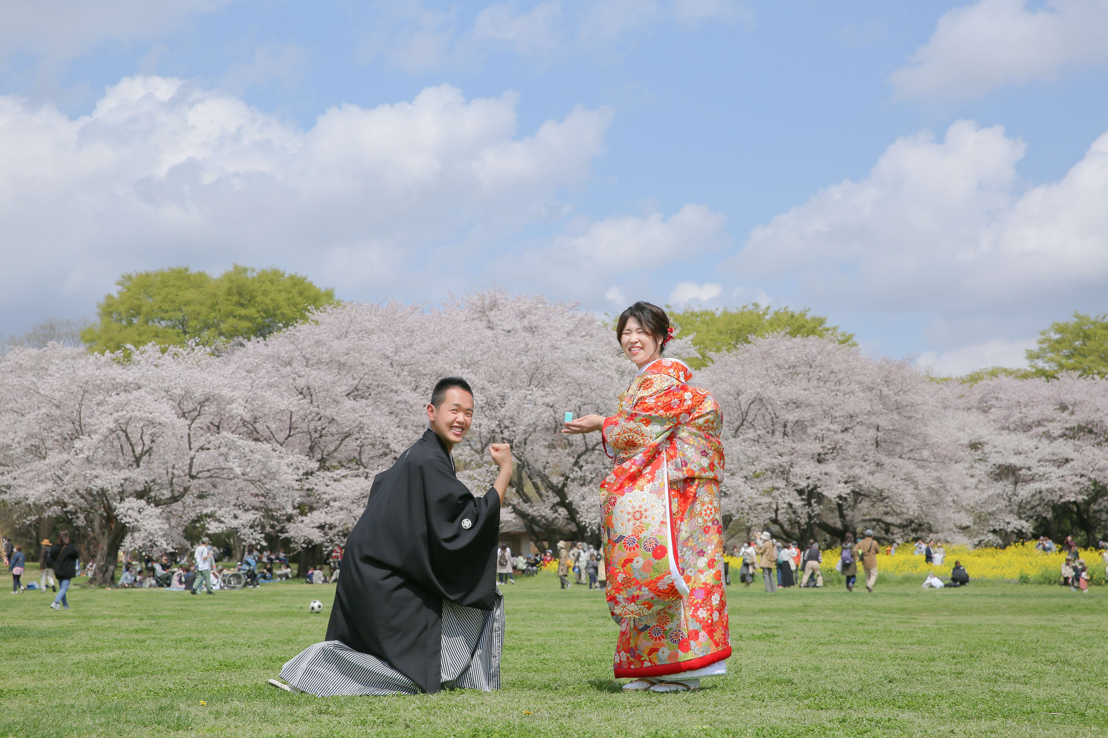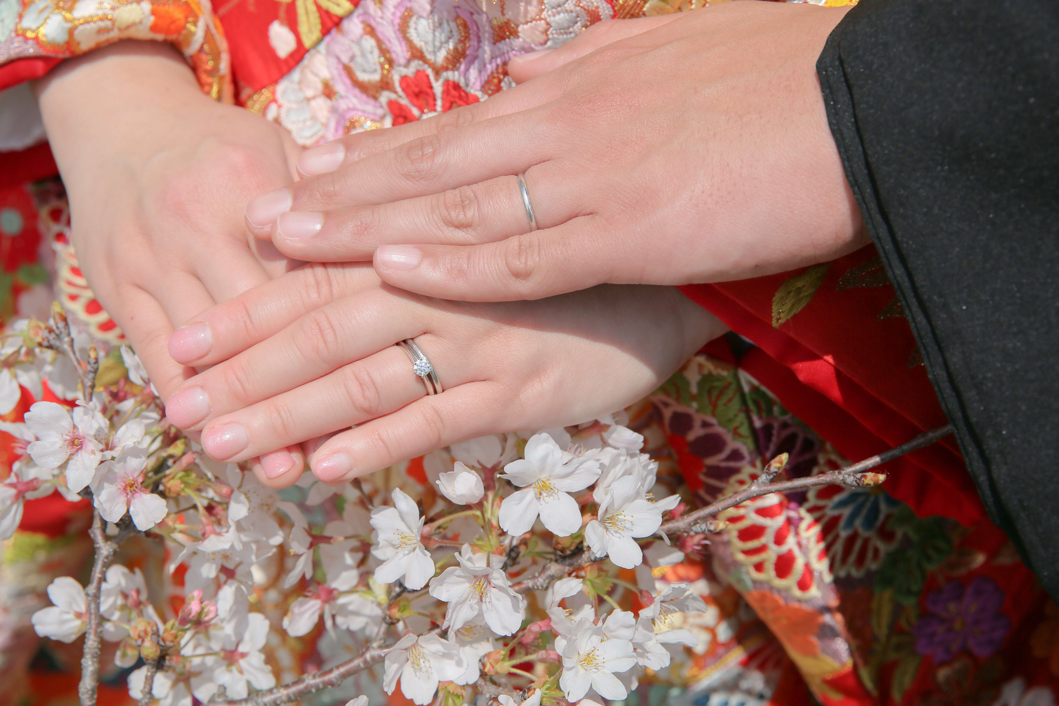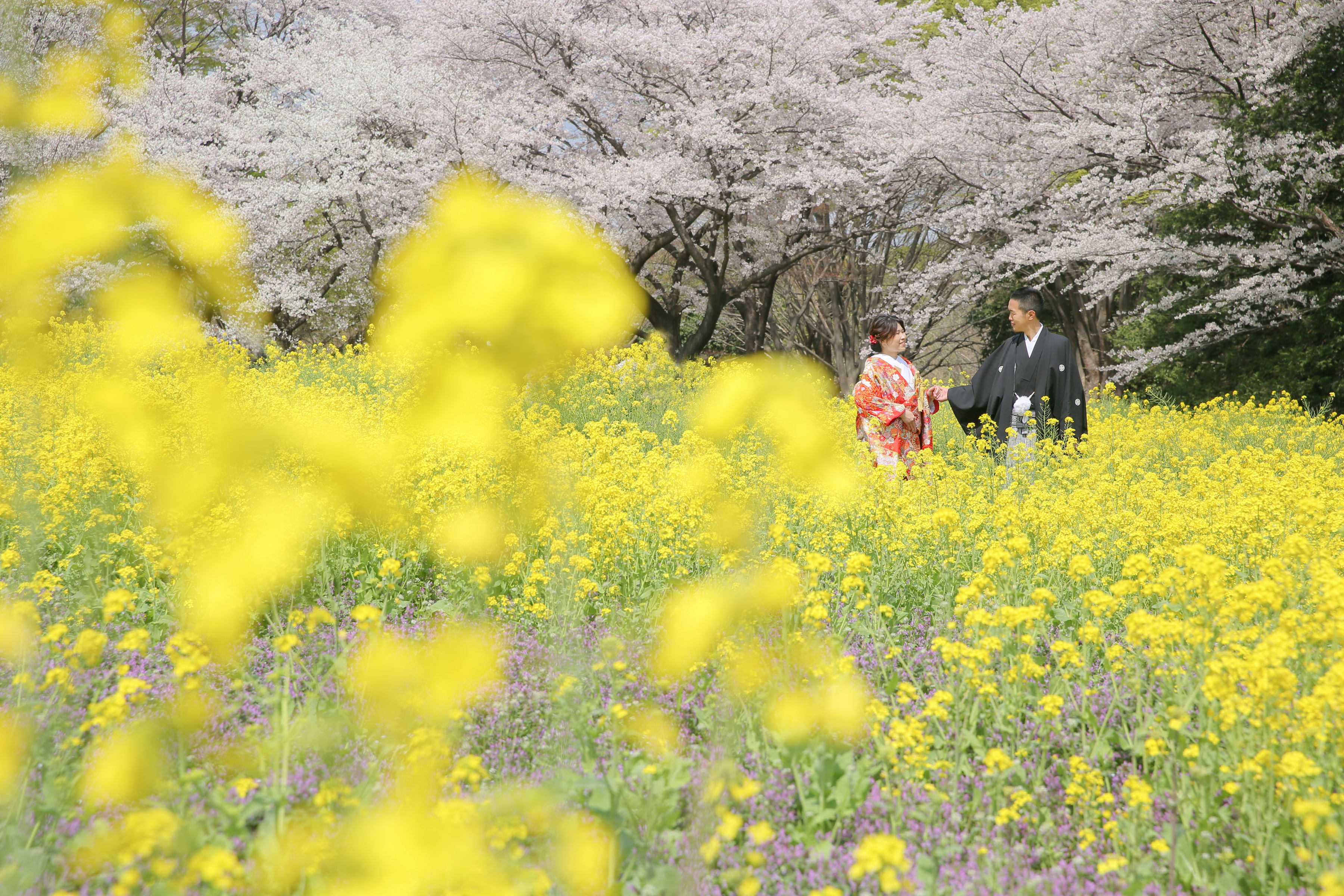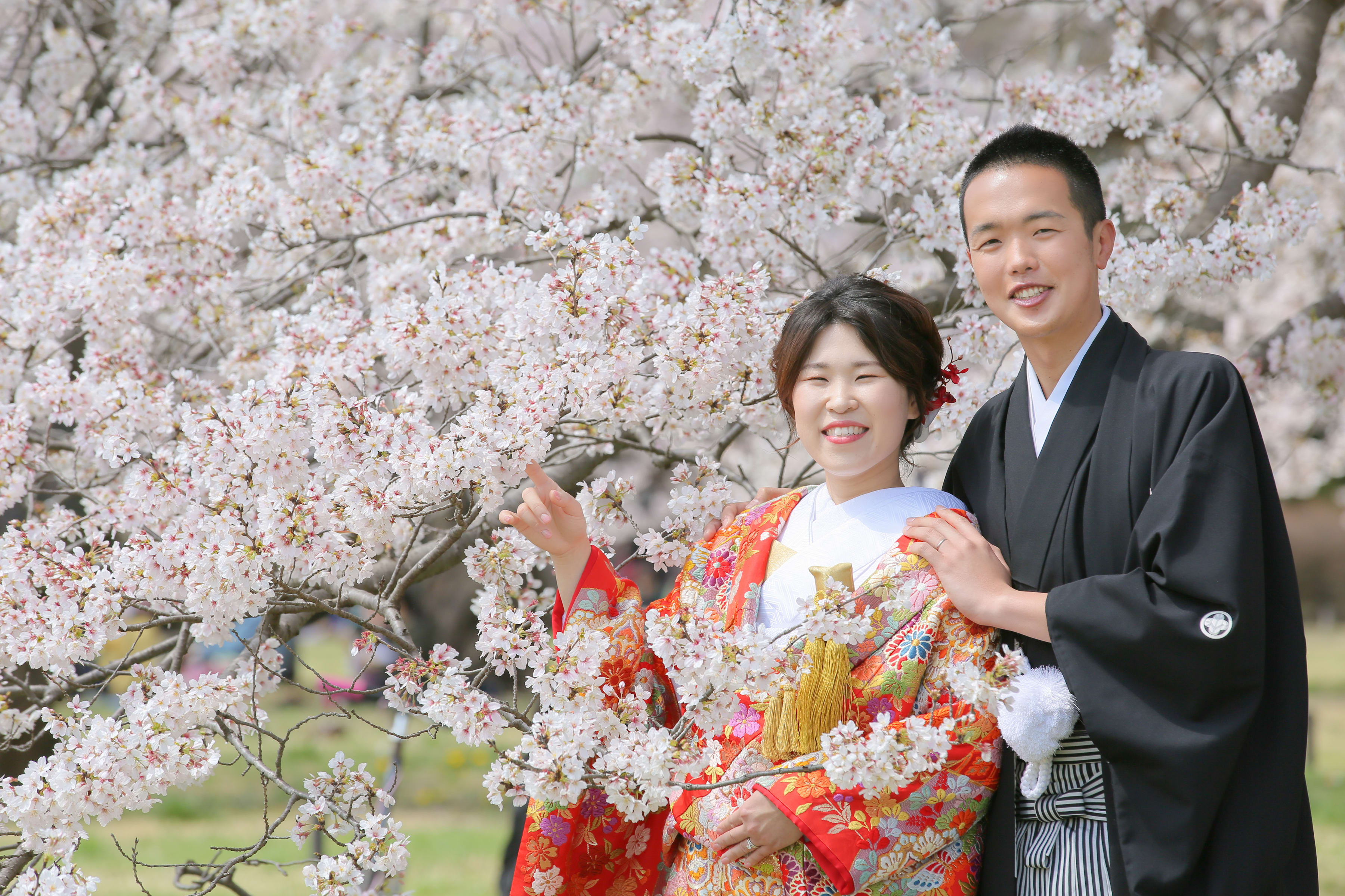 暖かな日差しのもと桜の下で前撮り。