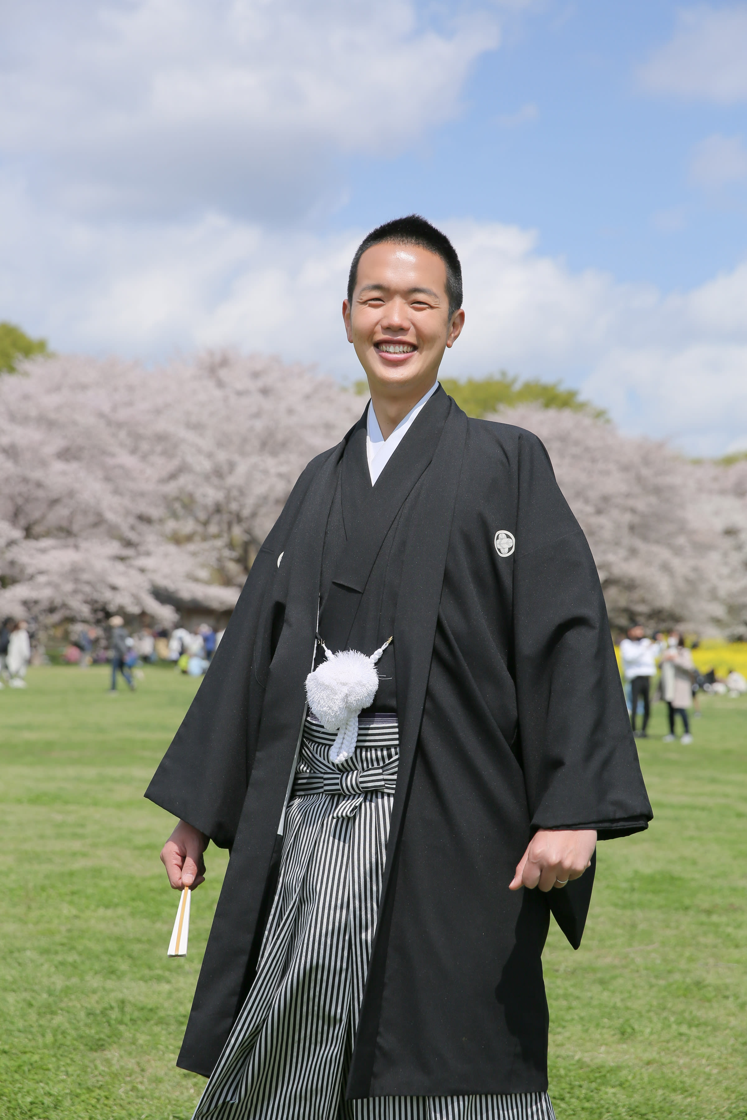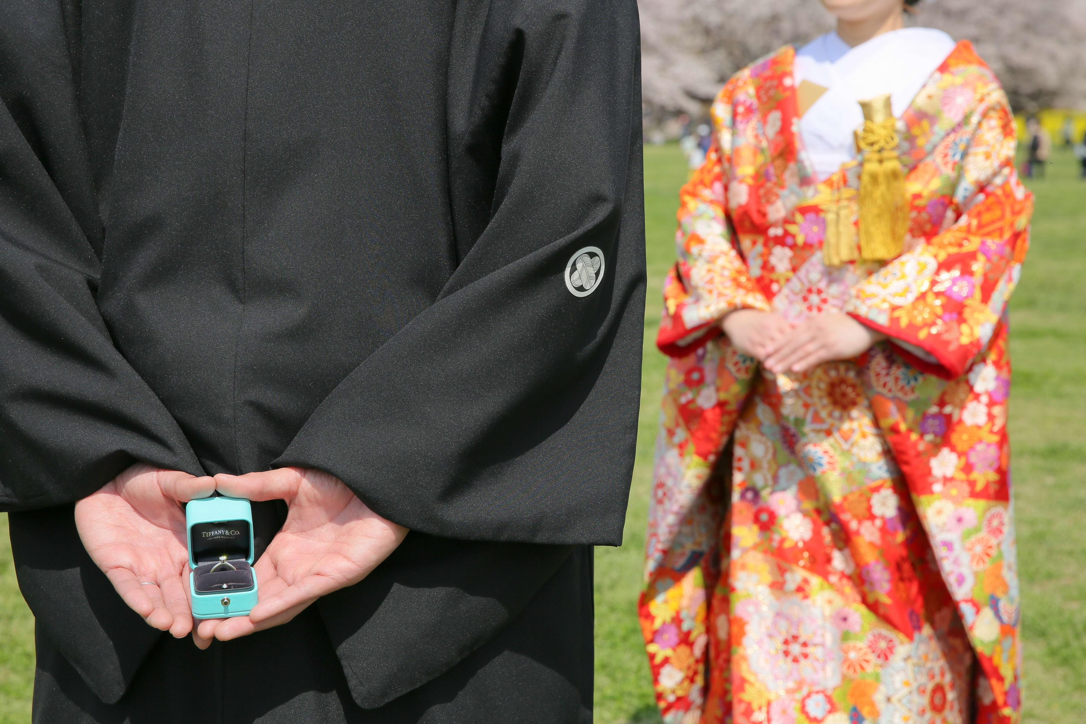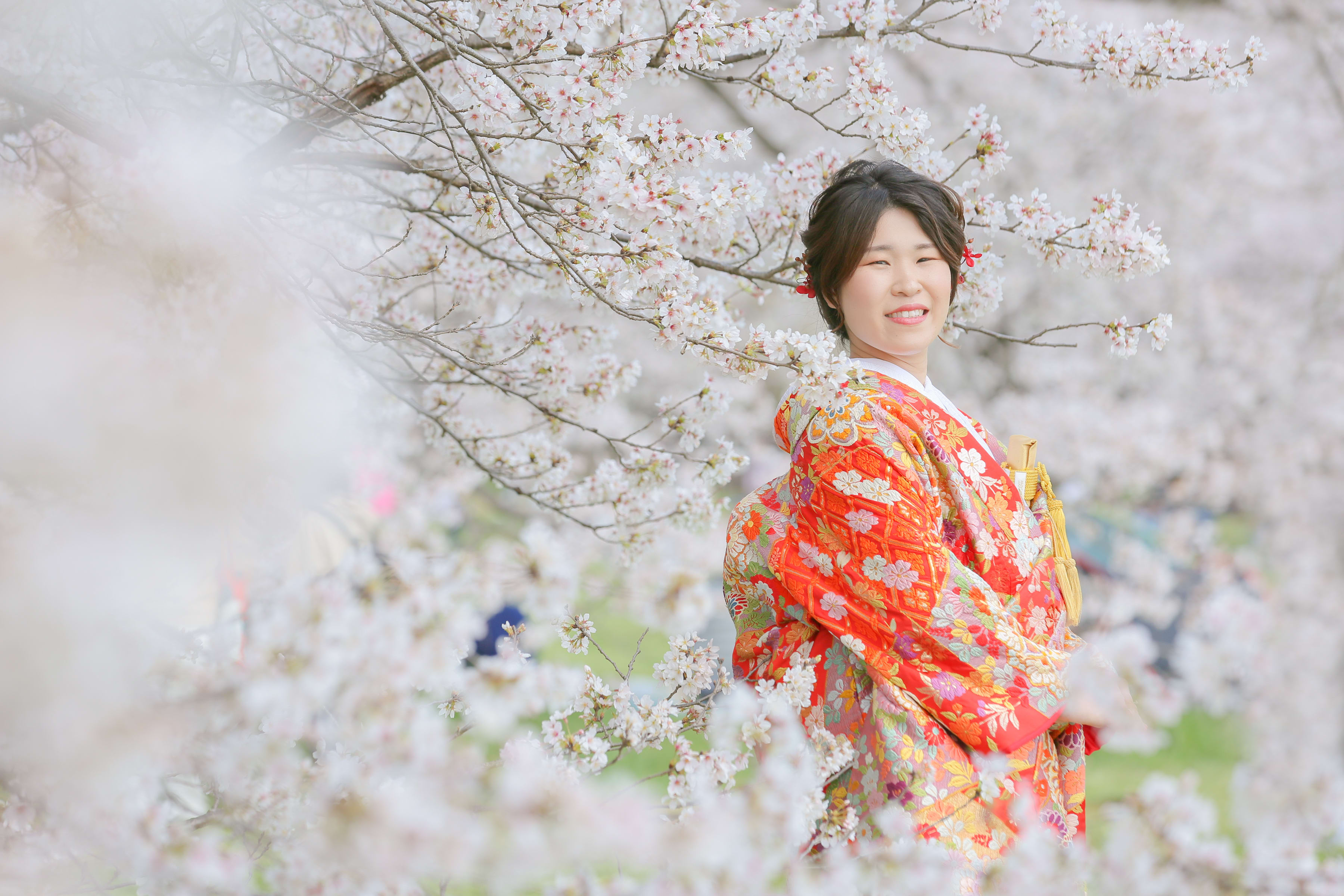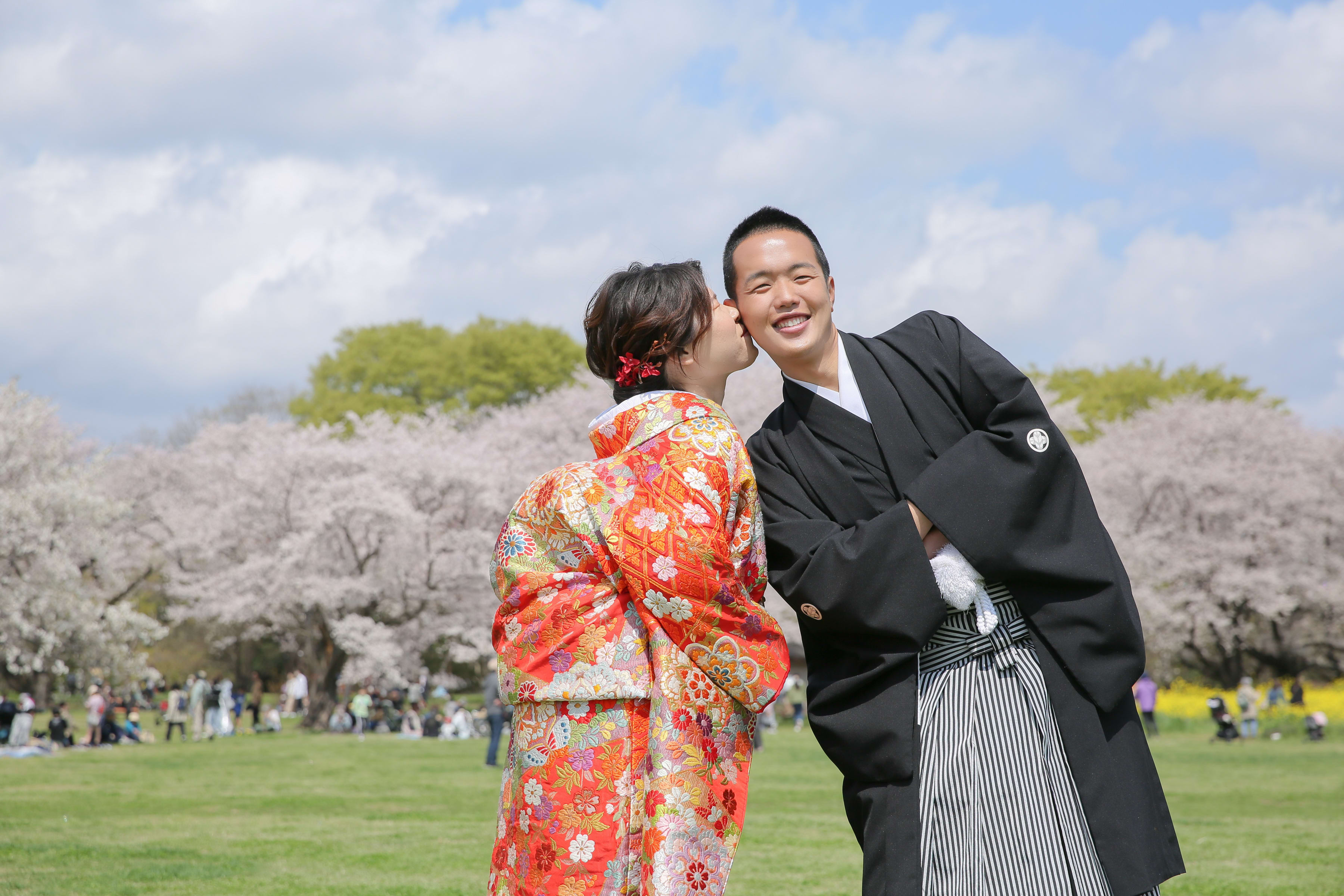 暖かな日差しのもと桜の下で前撮り。