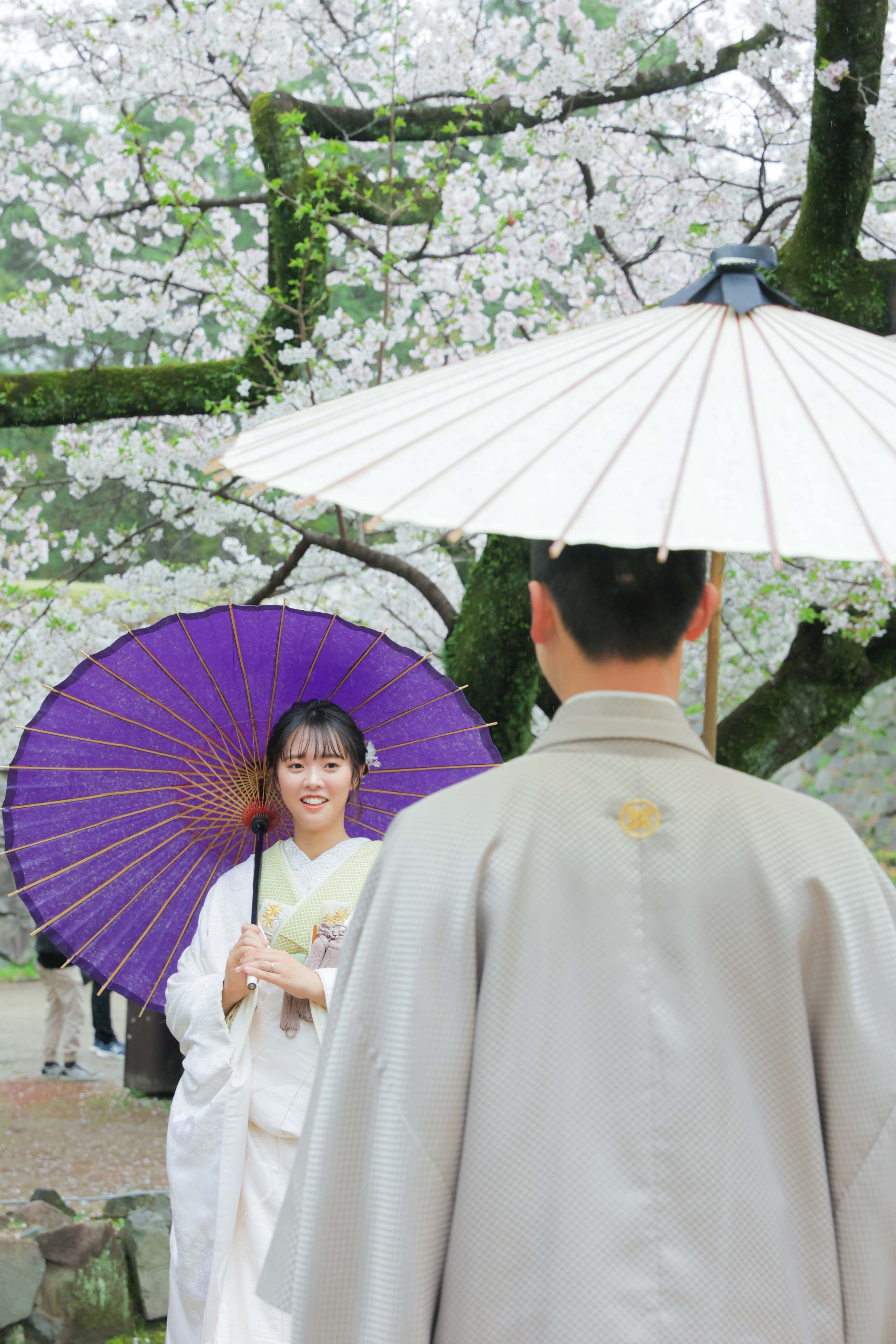 名古屋城を背景に和傘を持って頂き、日本ならではの情緒のあるお写真にしました!お二人とも和装姿がとてもお似合いでした!