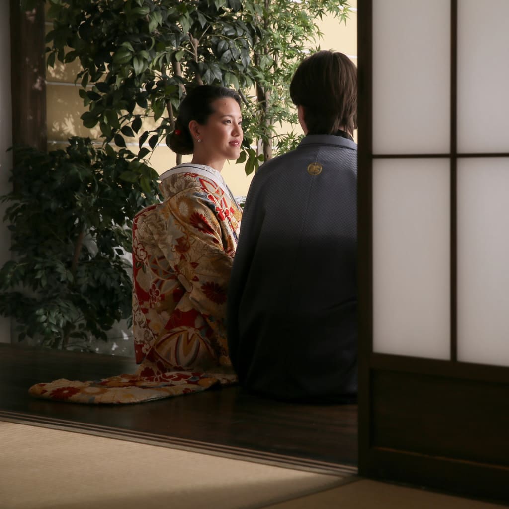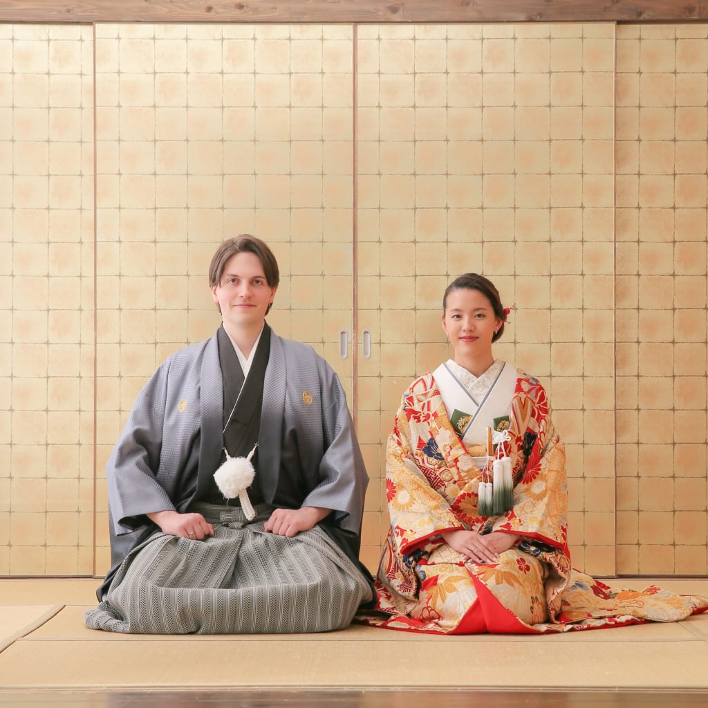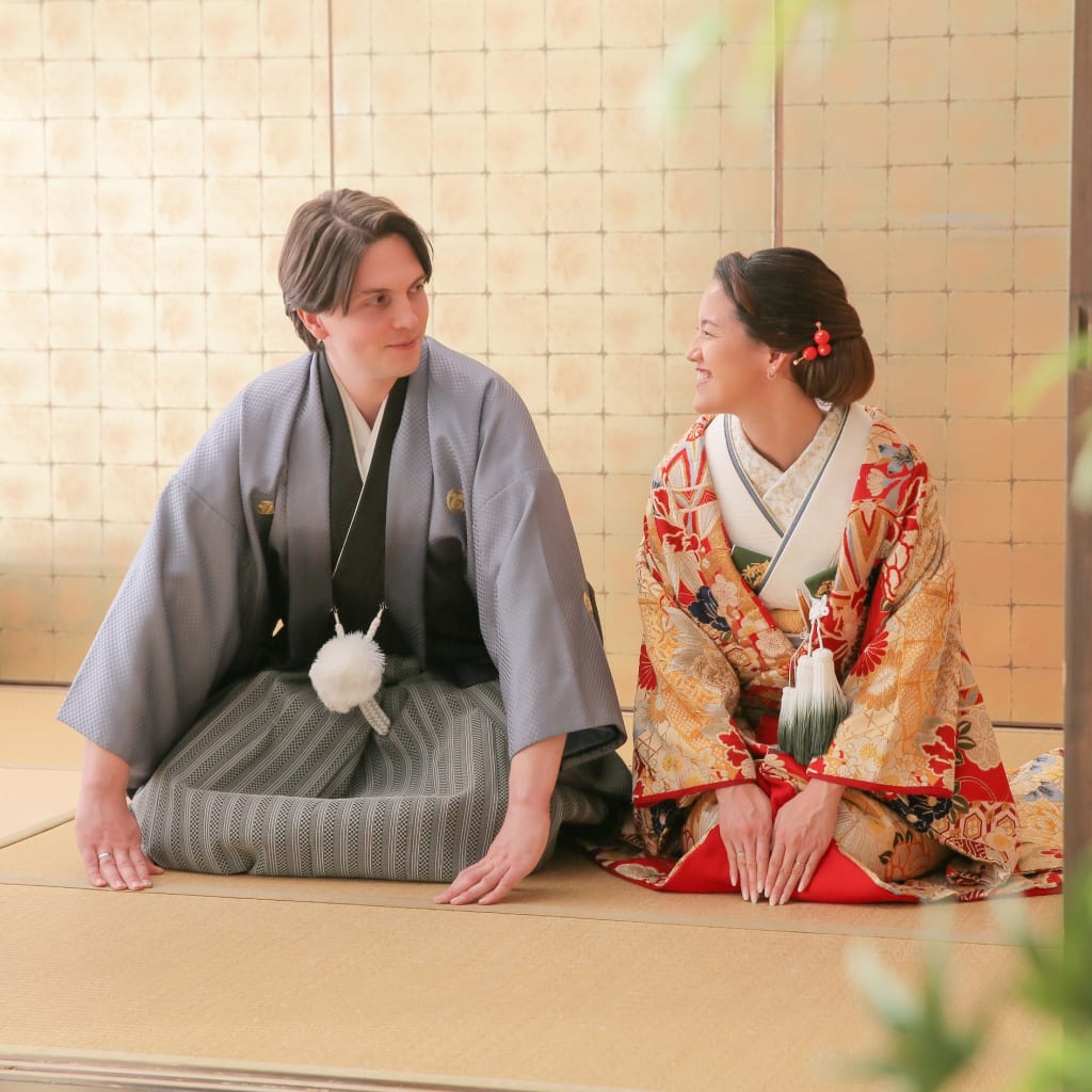 新宿店の本格的な茶室スタジオで撮影する、和装の結婚写真