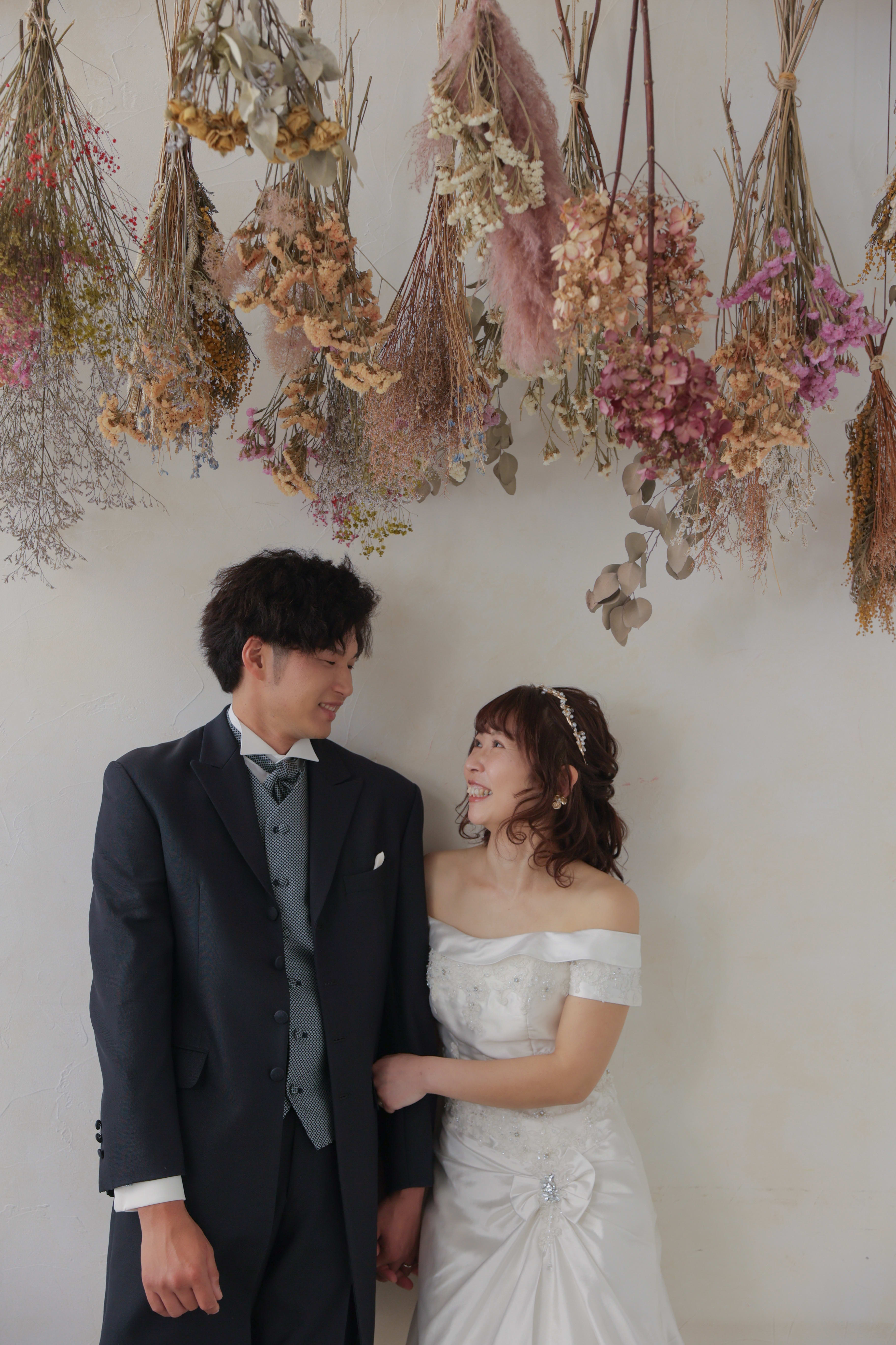 ドライフラワーから覗き込むご新婦様の可愛らしい笑顔が印象的です♡