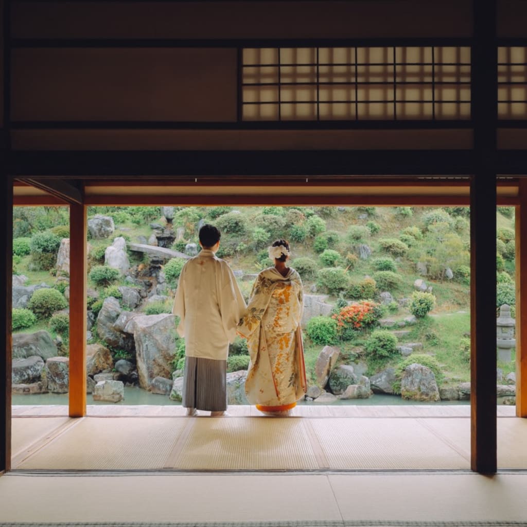 おふたりで、智積院の庭園を見ている後ろ姿をアップで♪