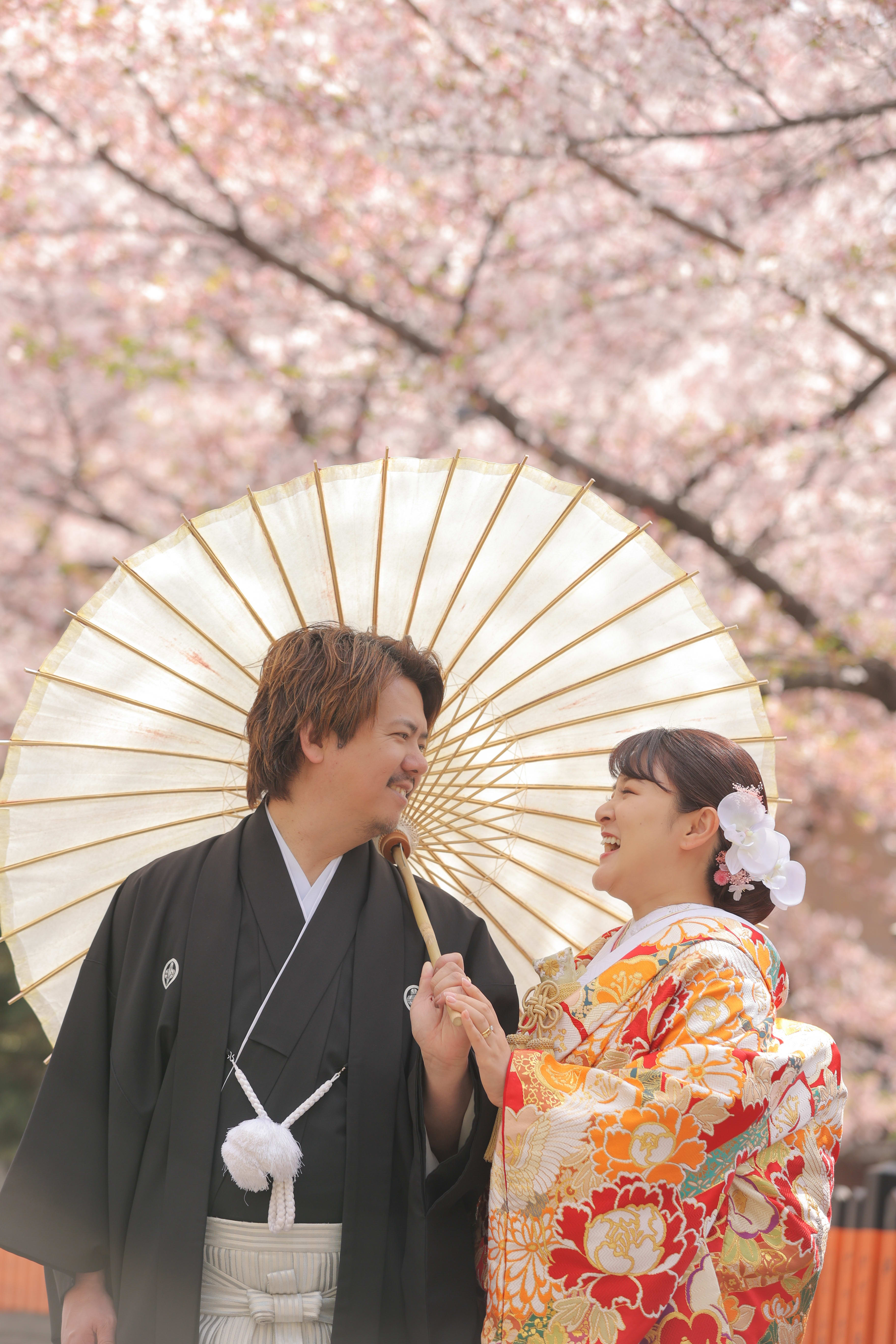桜の下で撮影した一枚。ご新婦様の色打掛と桜がとても似合っていました!