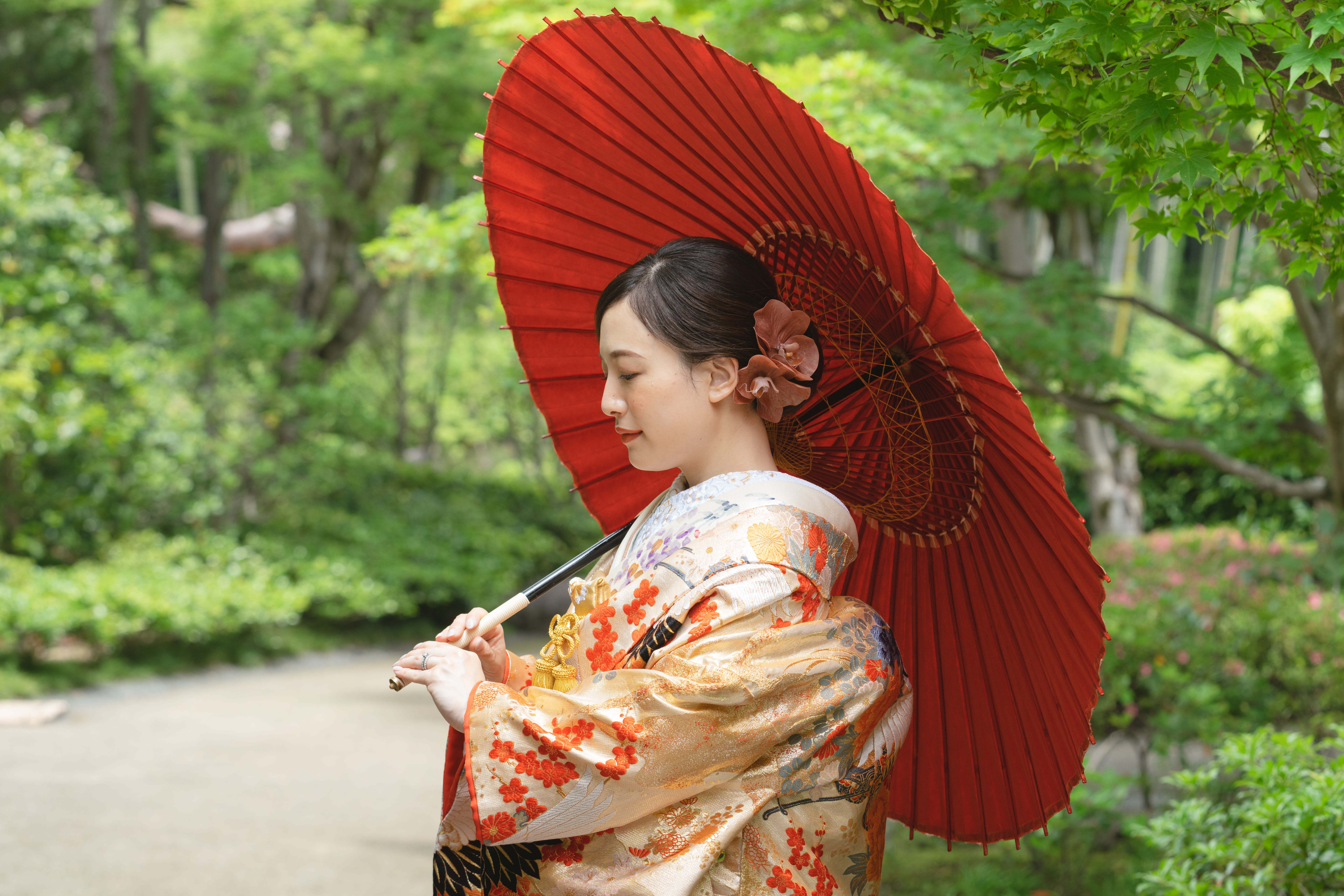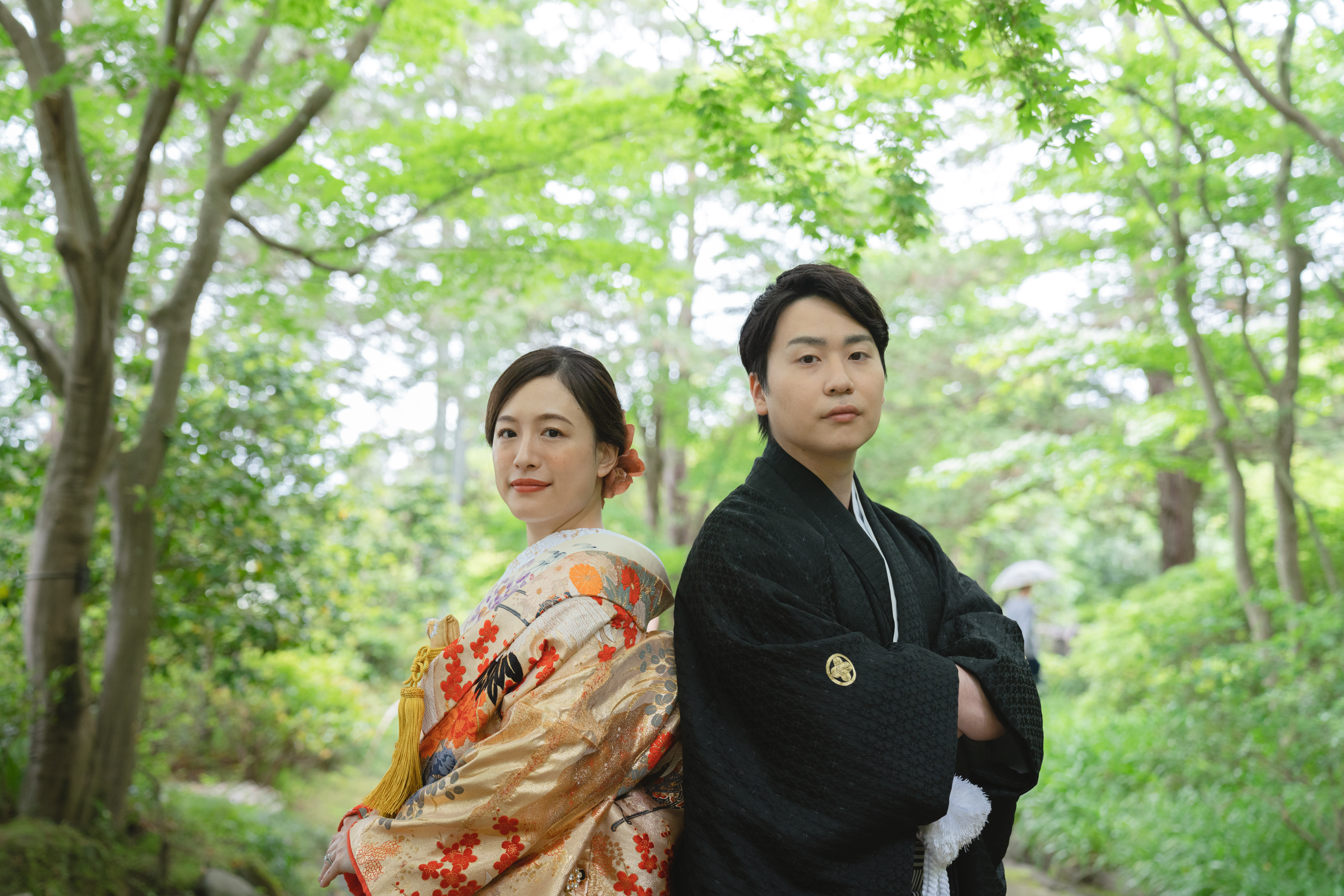 1着目は和装から! 日本庭園らしい橋の上でお写真を残しました!