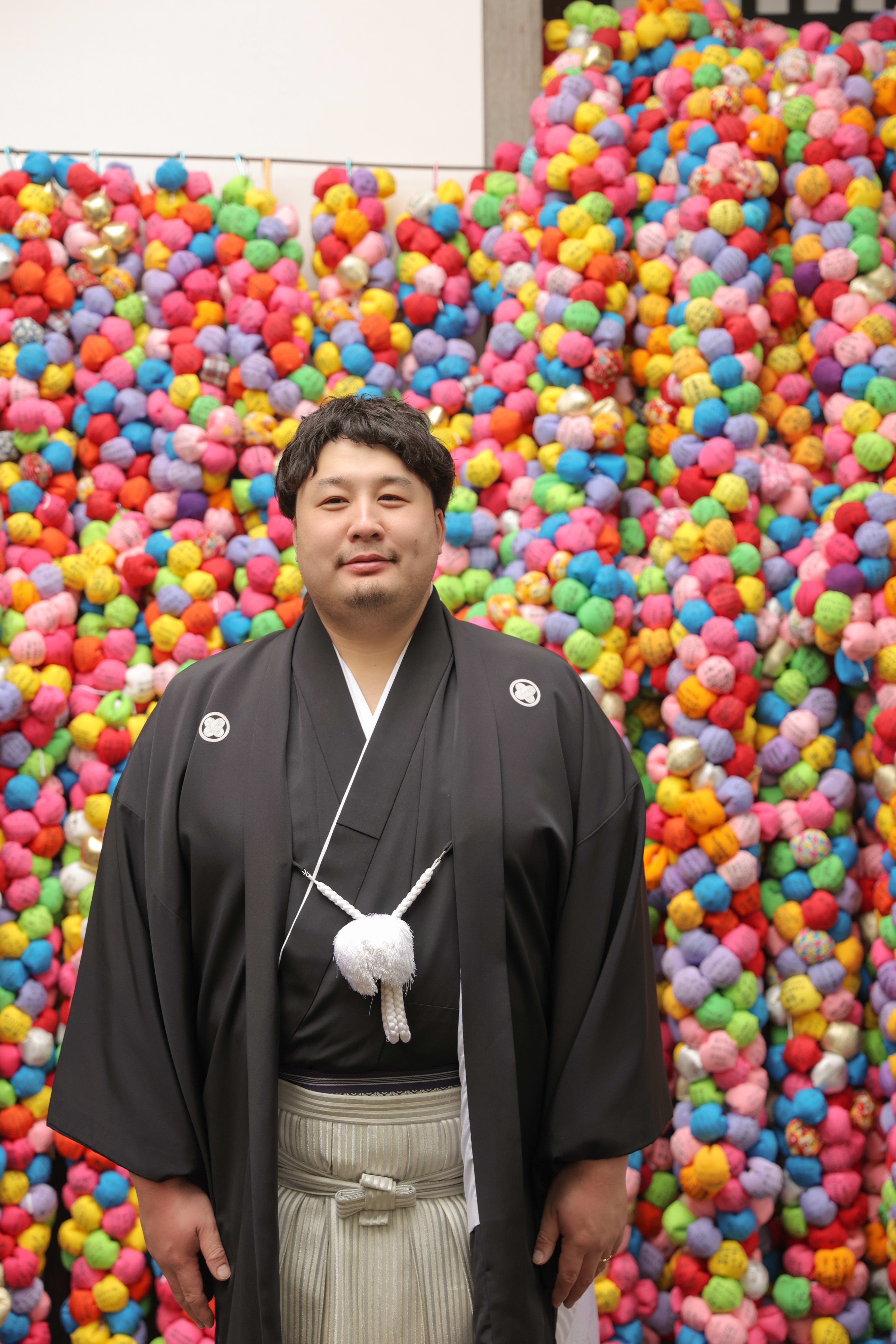 カラフルなくくり猿に囲まれた庚申堂で、手を合わせるおふたりを後ろからパシャリ♪