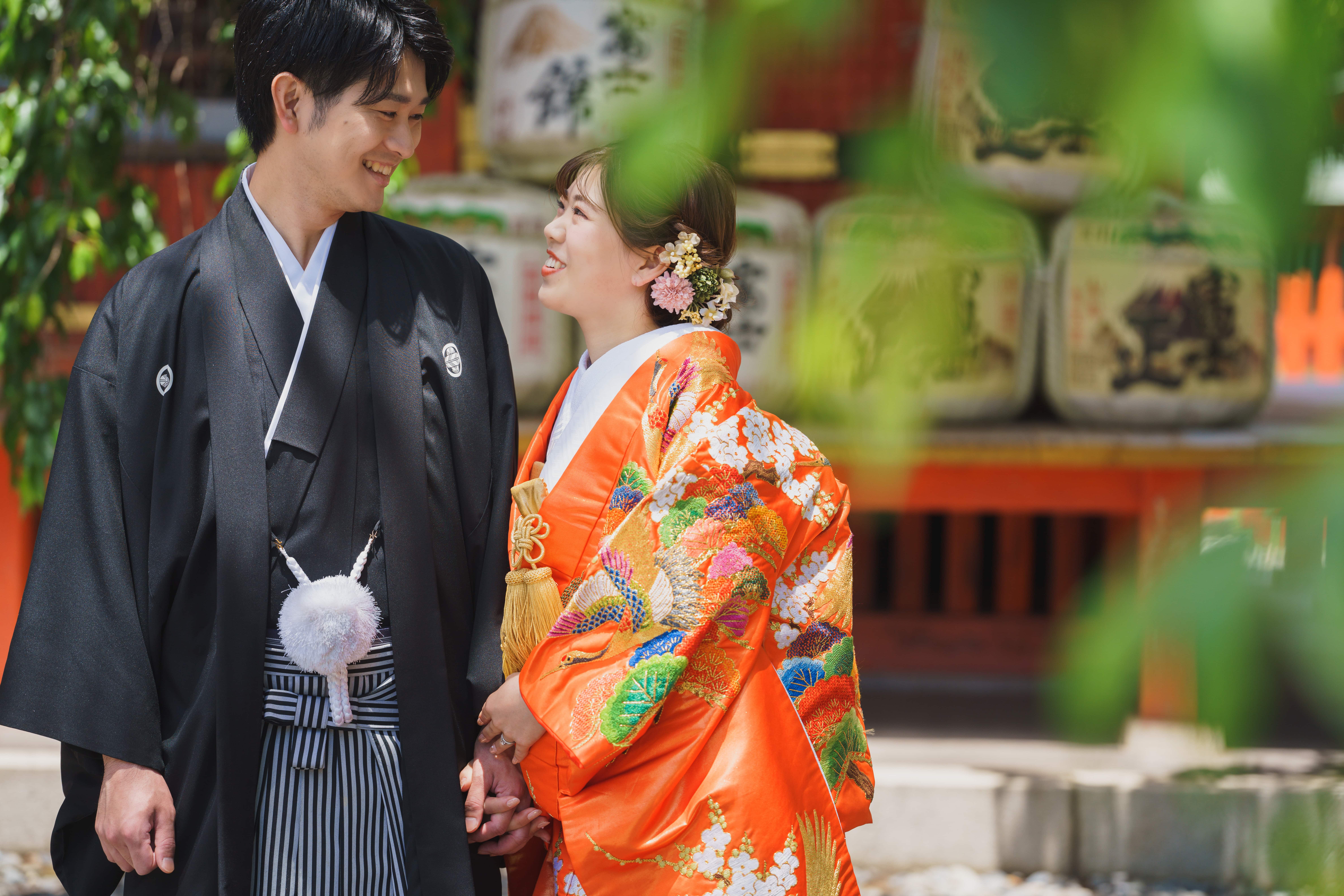 ゆっくりと話しながら歩くおふたり。おふたりを囲む木々の緑にご新婦様の朱色のお着物がしっかりと映えていて目を惹きます。