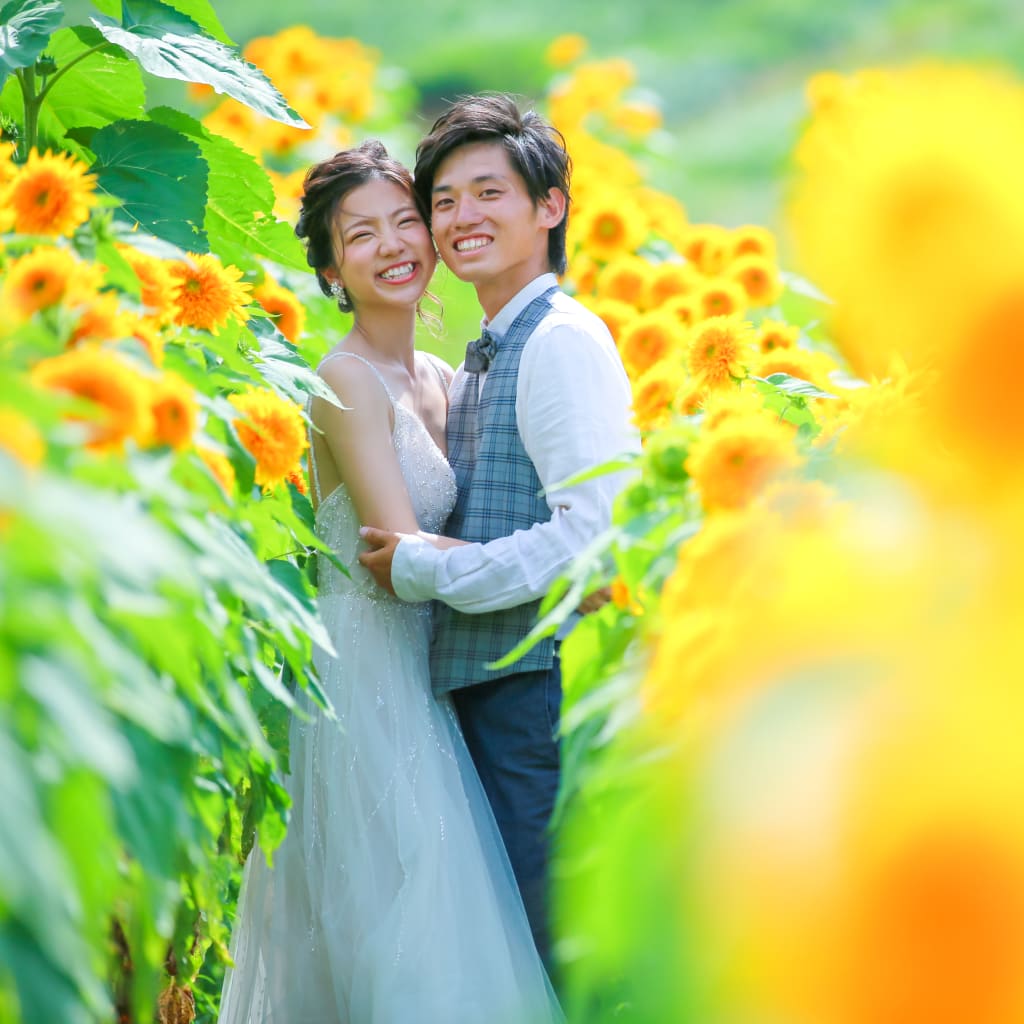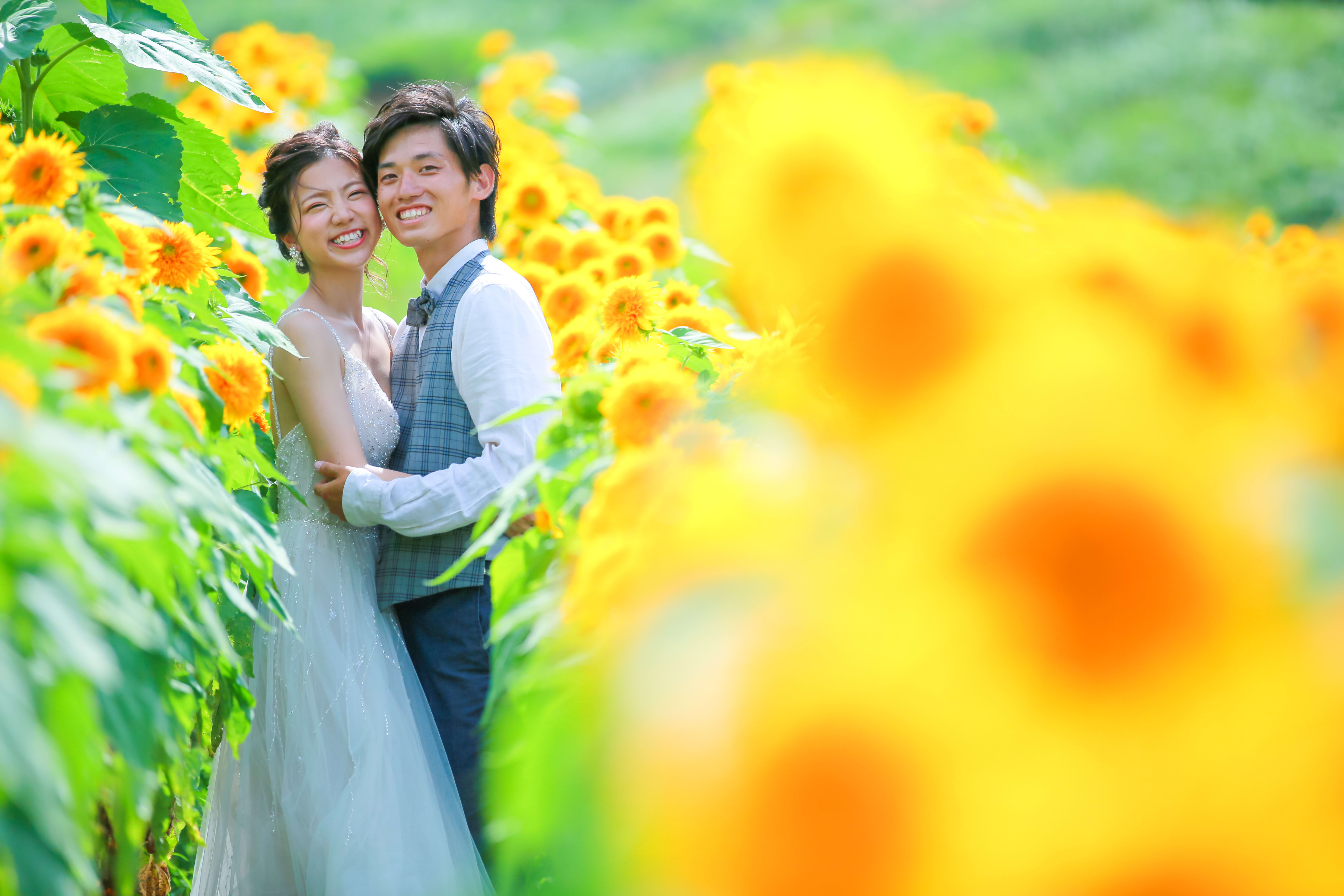 天を仰ぐ満開のひまわり畑のなかで出来合うお二人^^