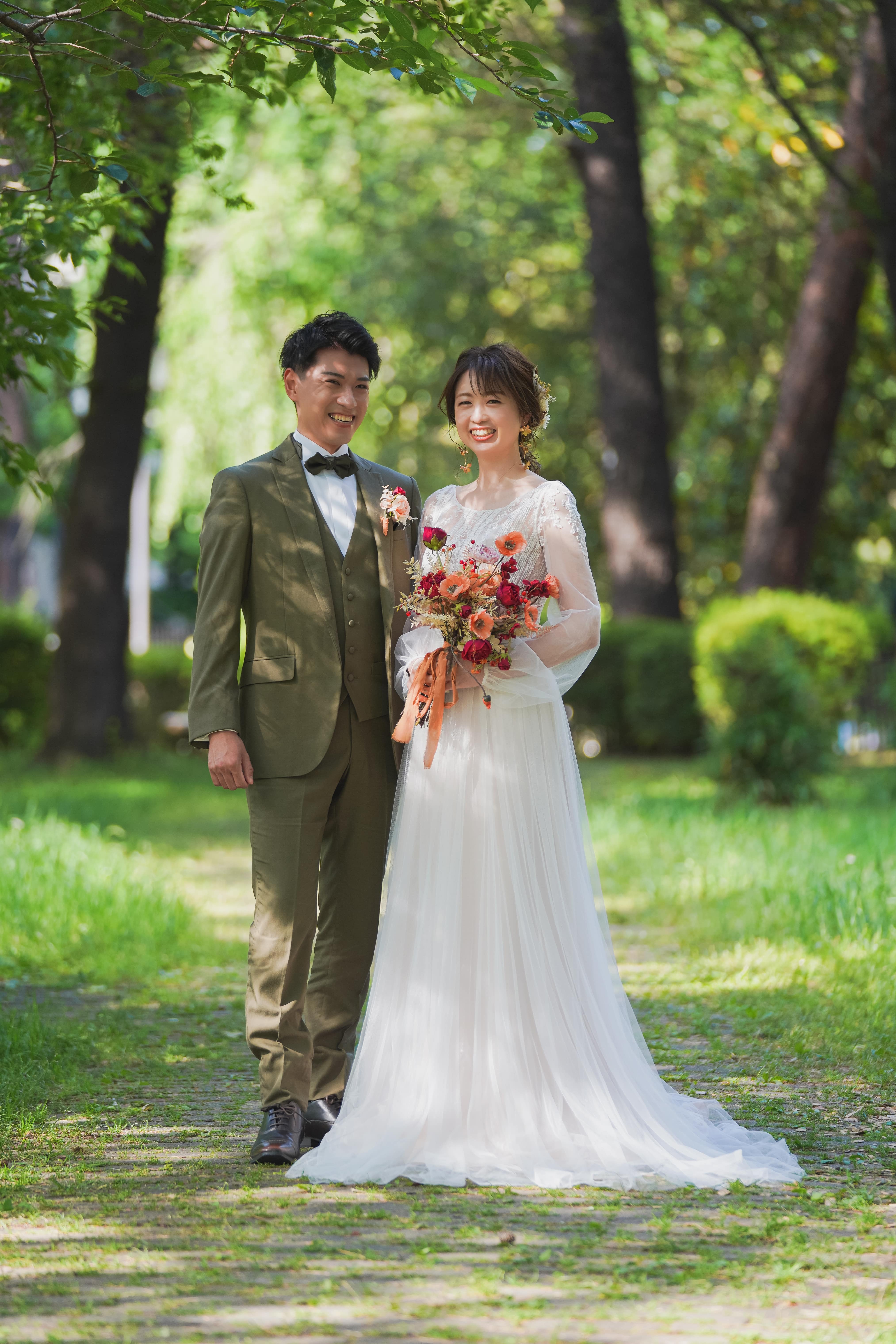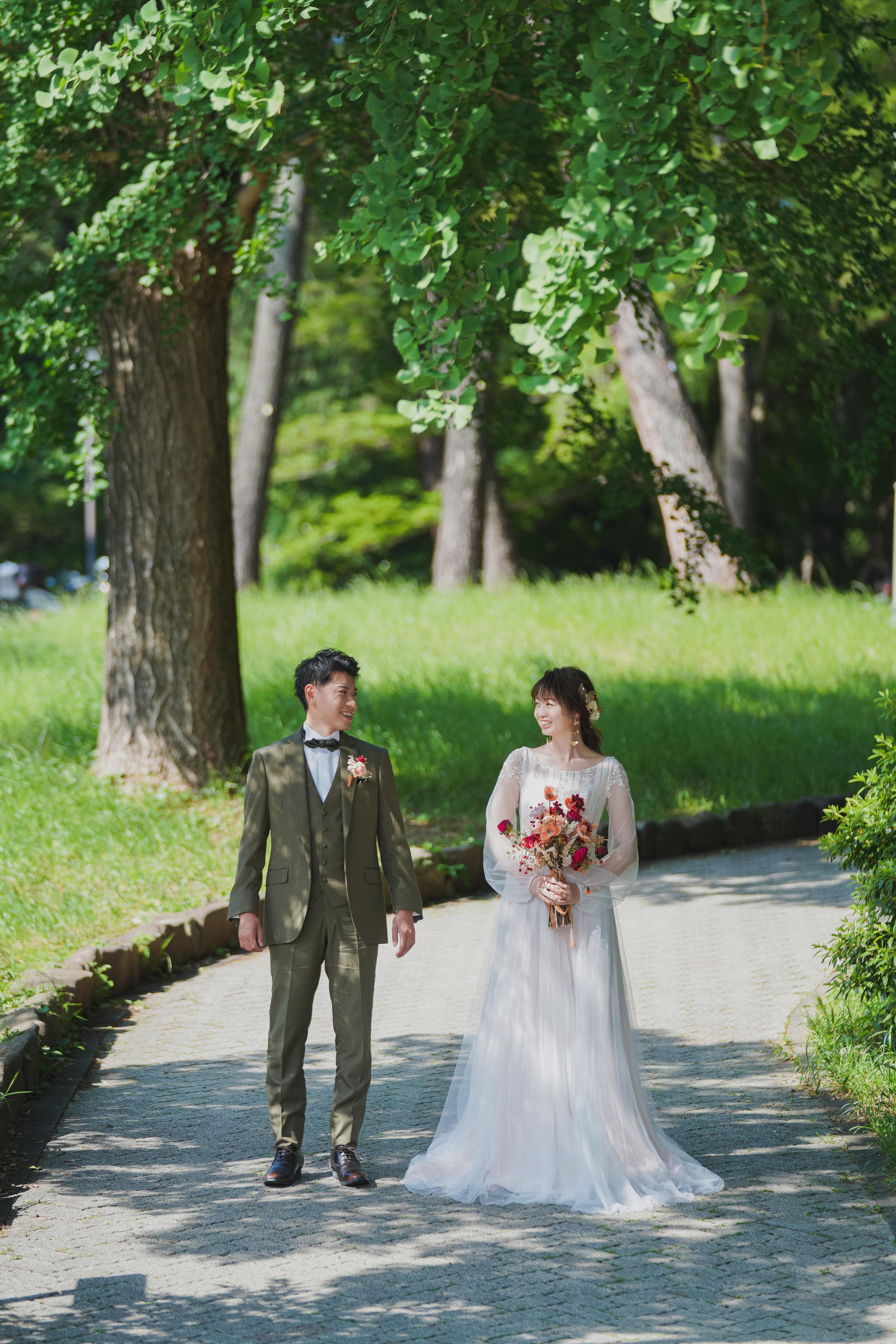 園内に設置されているベンチに腰掛けて寄り添いながらのカット。ご新婦様の少し照れている表情も可愛いです。