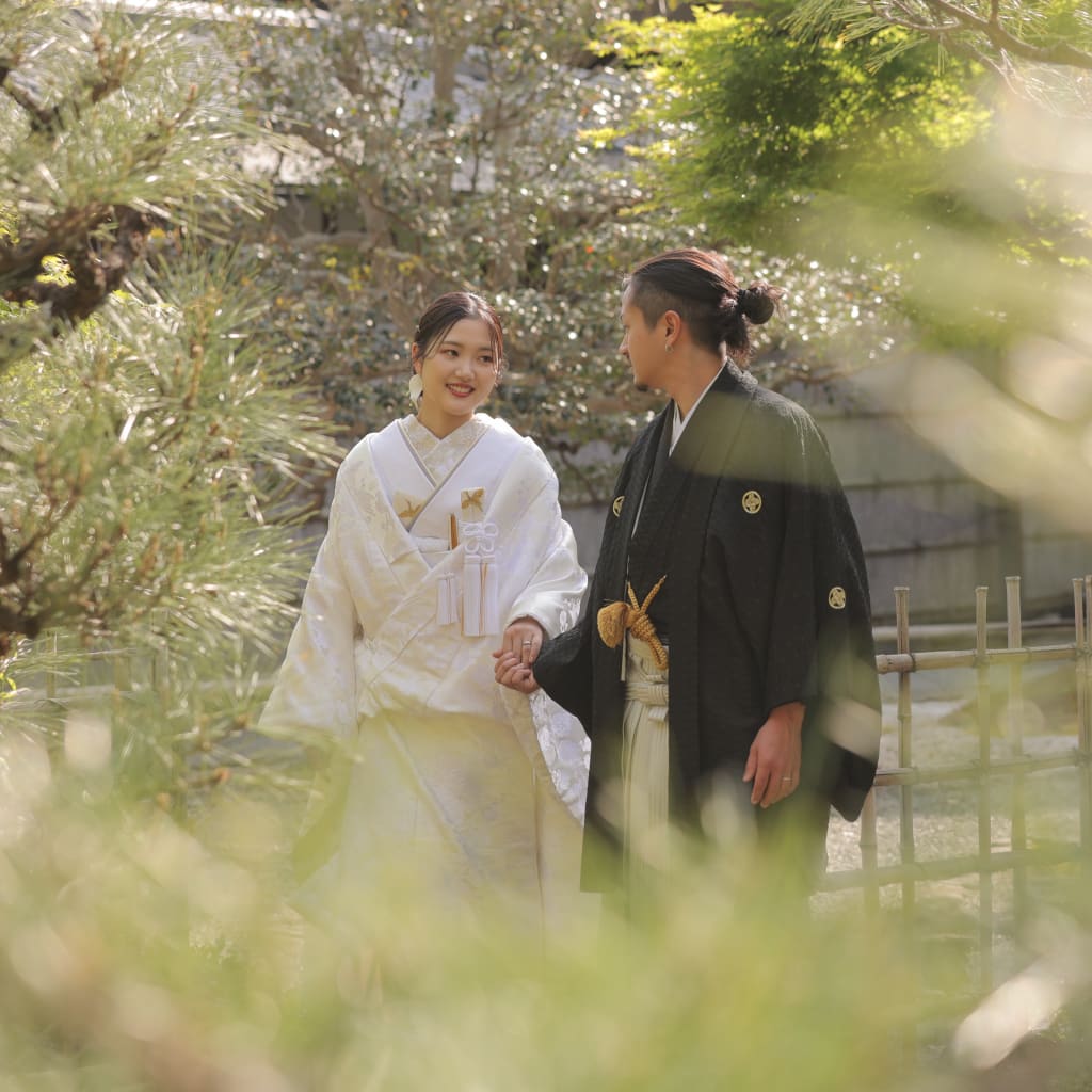 和傘をさして、手を取り合うおふたり。優しく見つめる新郎様へ微笑みかける新婦様の笑顔がとても綺麗です♡
