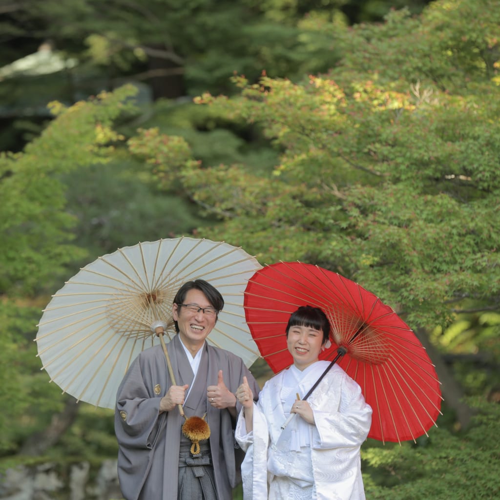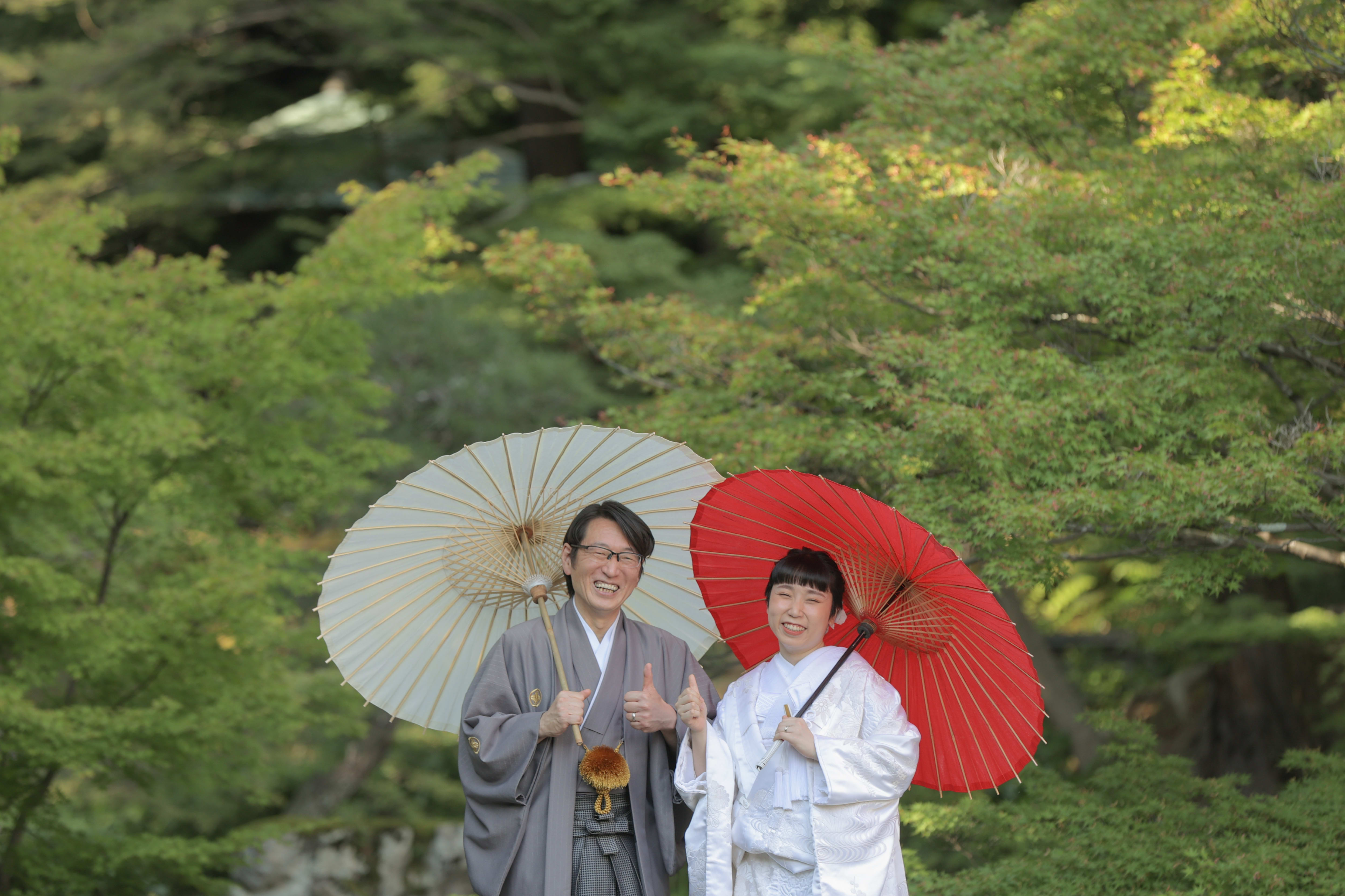 和傘を持って満面の笑みで^^仲睦まじいお二人のハッピー溢れる一枚です♪