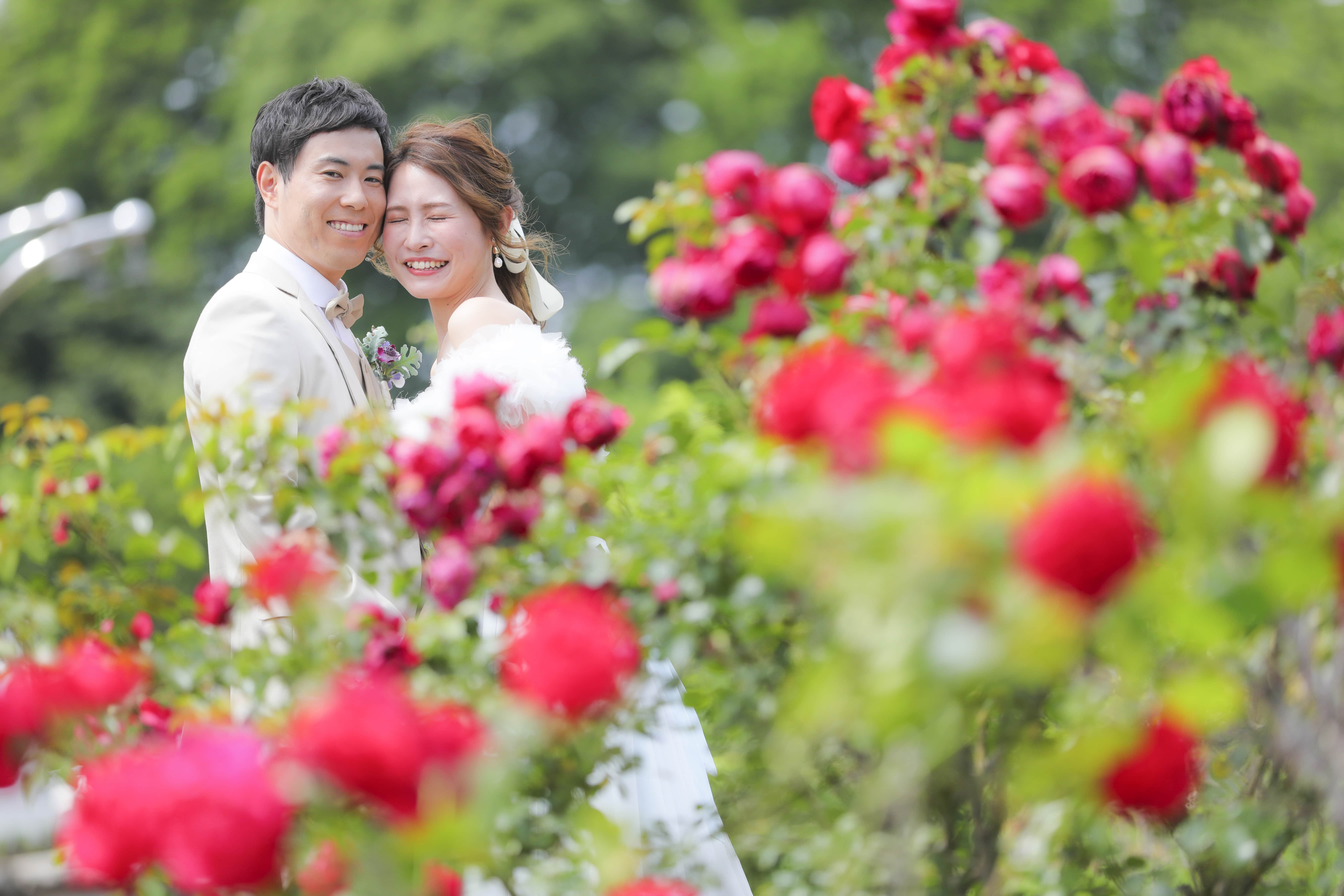 きれいに咲く真っ赤なバラとの撮影。季節に合わせたお花の撮影は毎年人気です!!