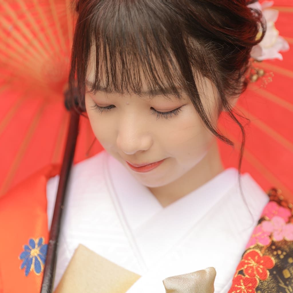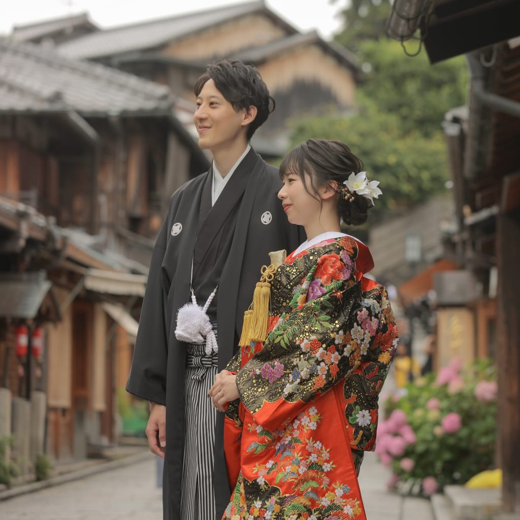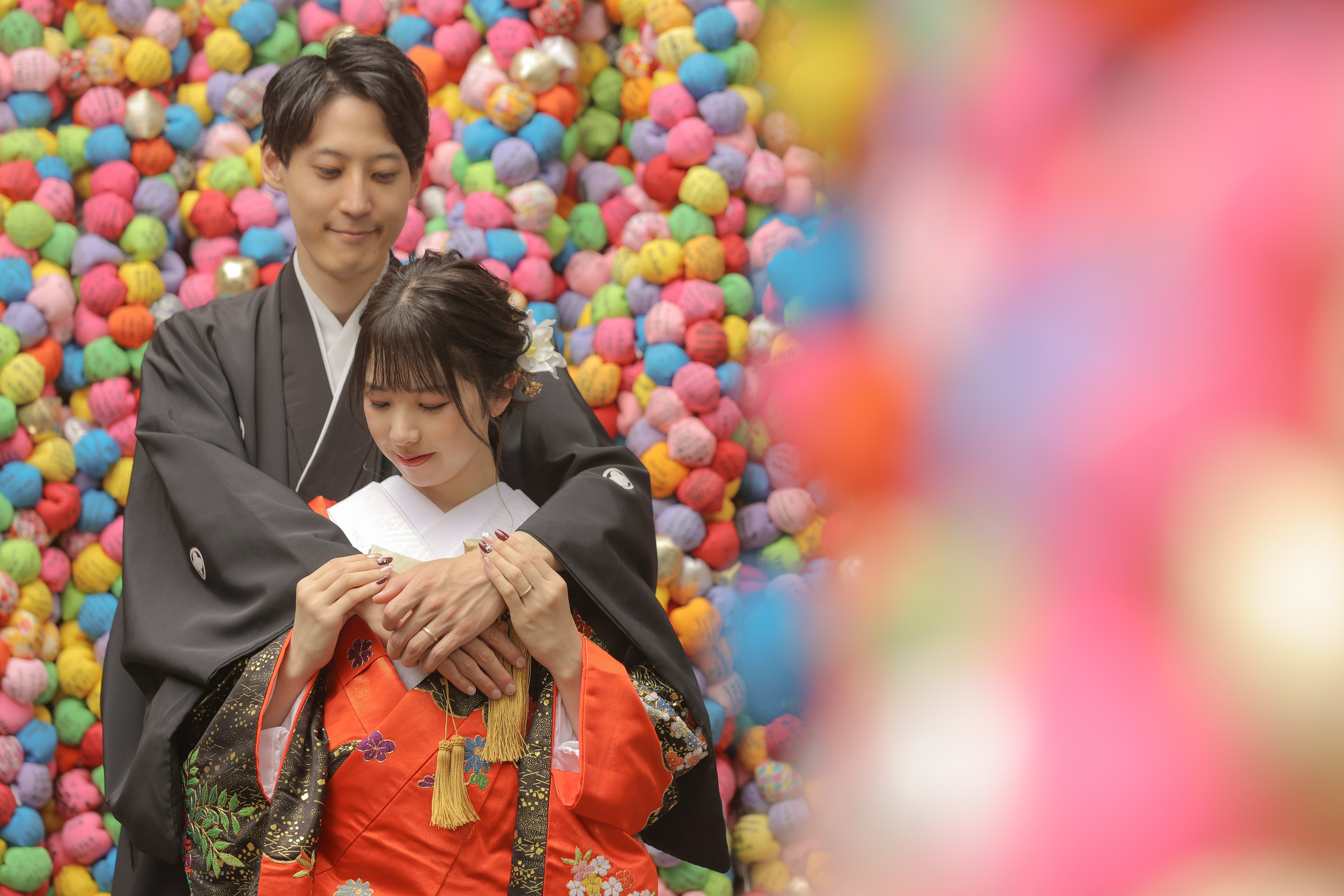 紫陽花の優しいピンクと新婦様の色打掛のはっきりとした色合いがどちらも目を引く1枚です♪