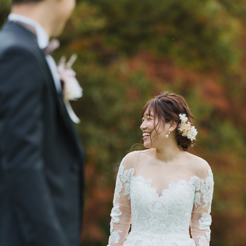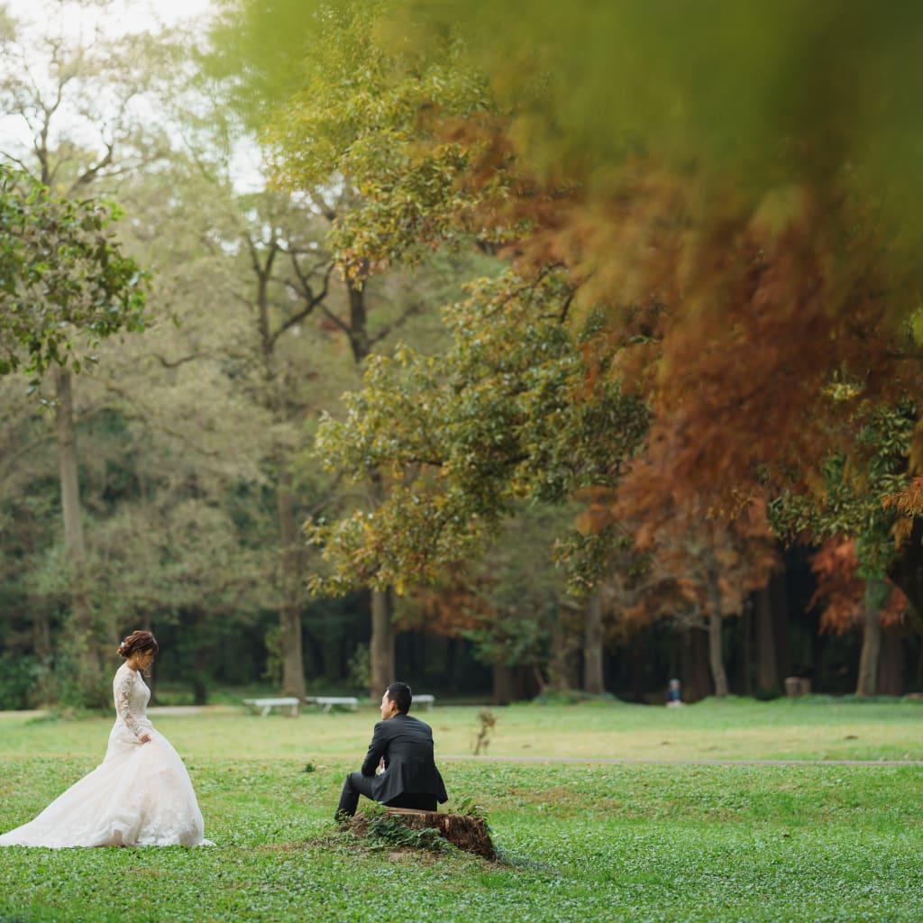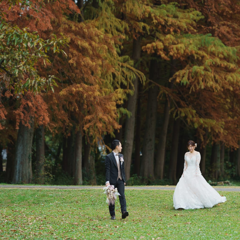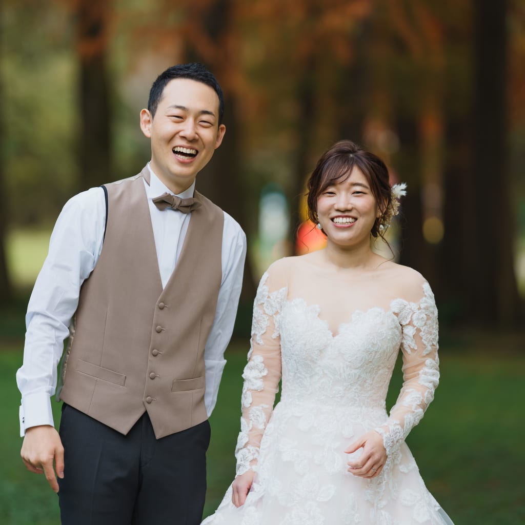 真っ直ぐな木の中に佇むおふたり。シンプルに綺麗です◎