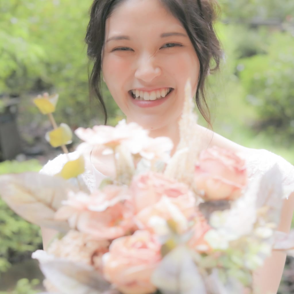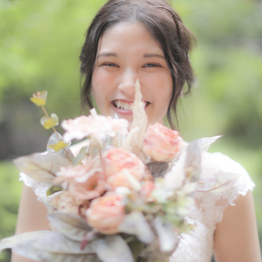 緑に包まれたご新婦様の笑顔!!ブーケ越しの笑顔がとってもかわいい!!