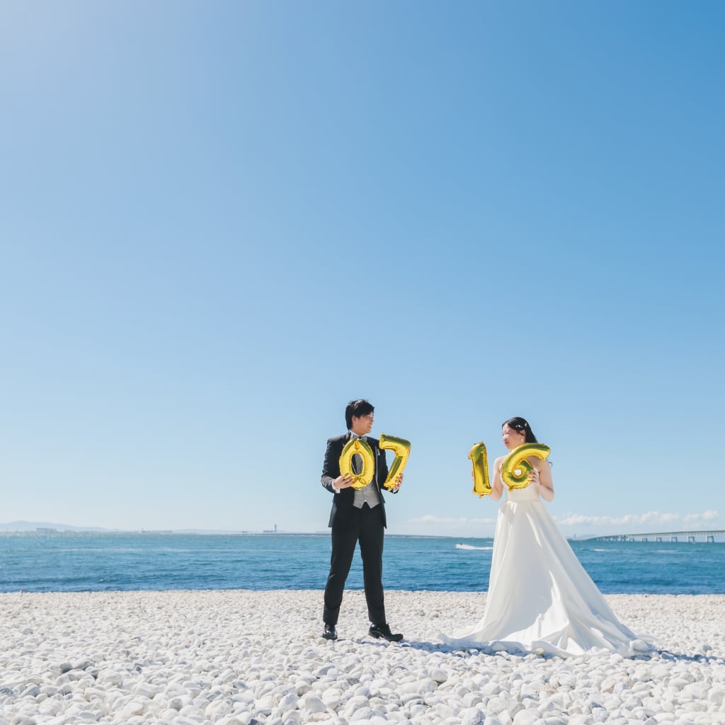海のキラキラを背景におふたりの素敵なバングルを主役に撮影しました!