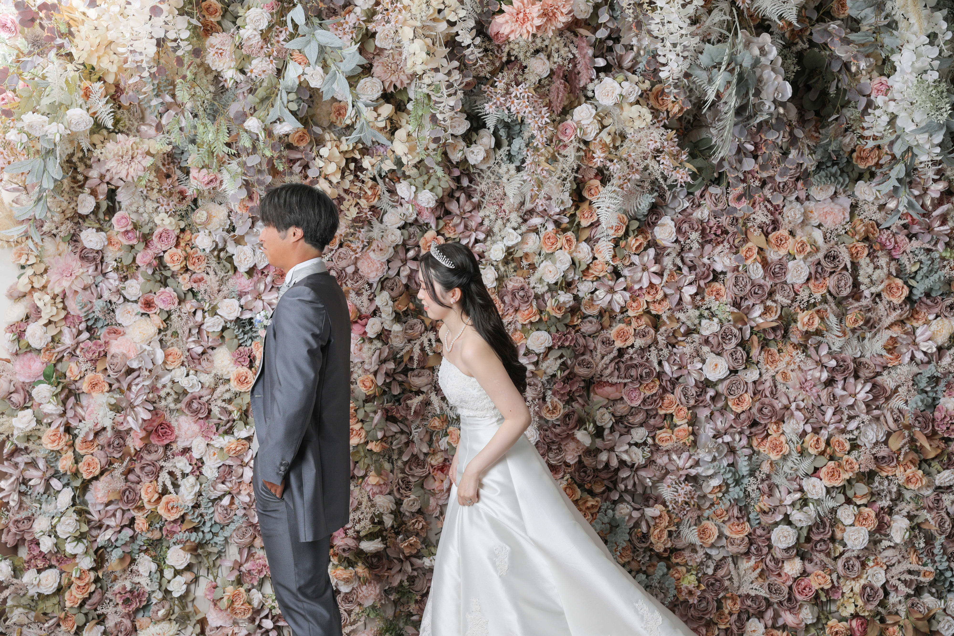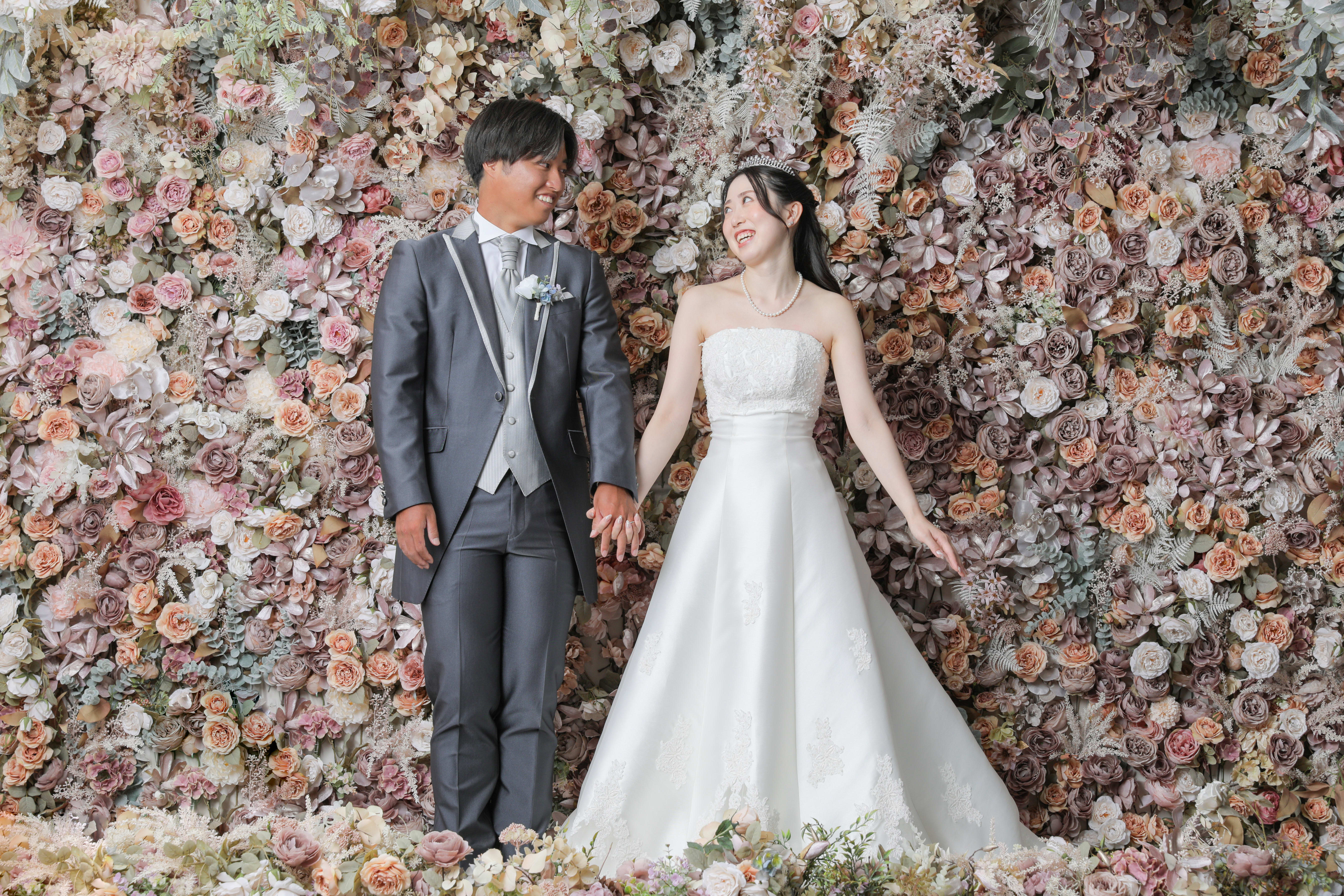 お二人にはお花畑の中でかくれんぼをしている様子をイメージしていただきました! ご新婦様がご新郎様を見つけたようです!