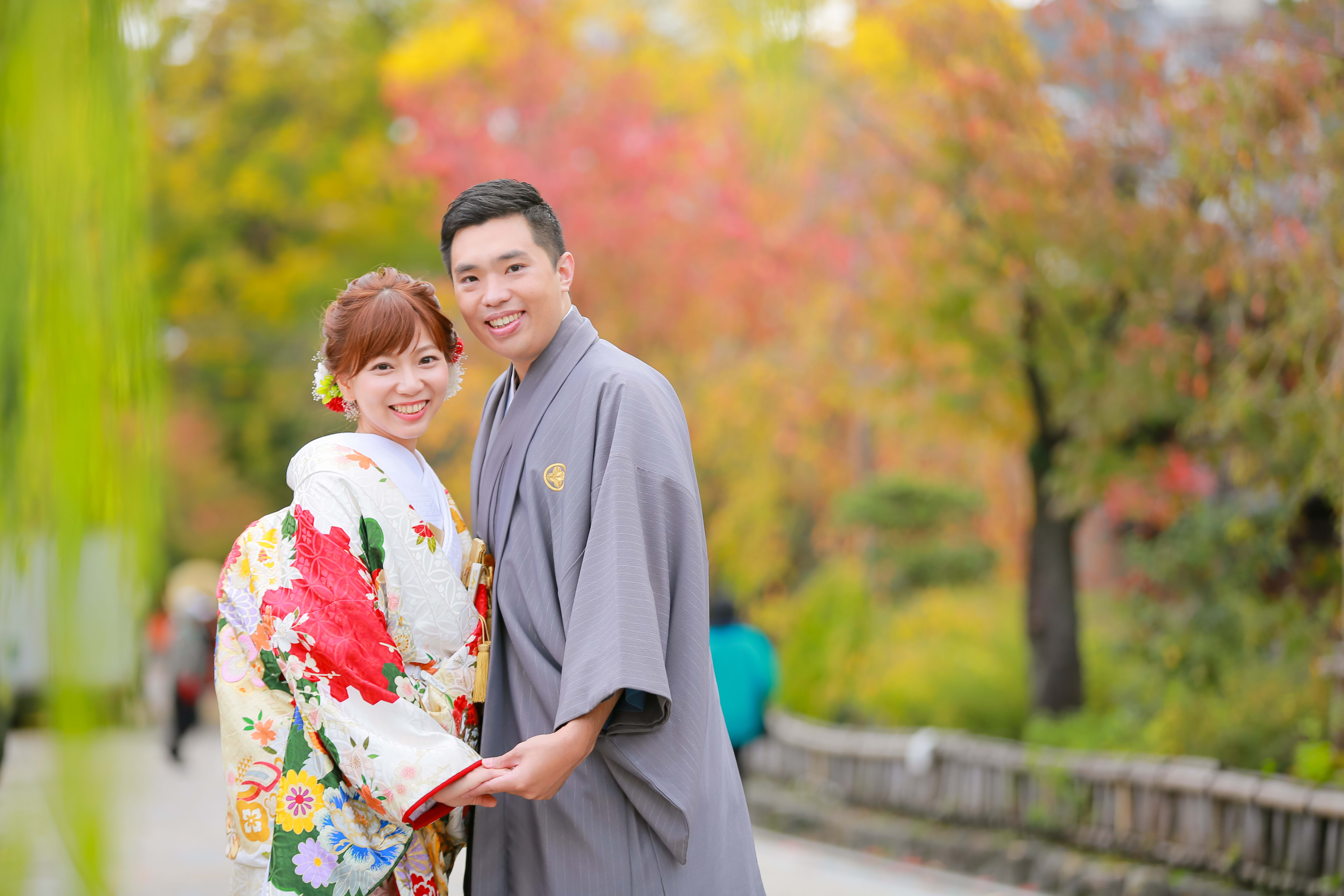 祇園と言えば、朱色の柵! 結婚のご報告にぴったりのお写真ですね♪