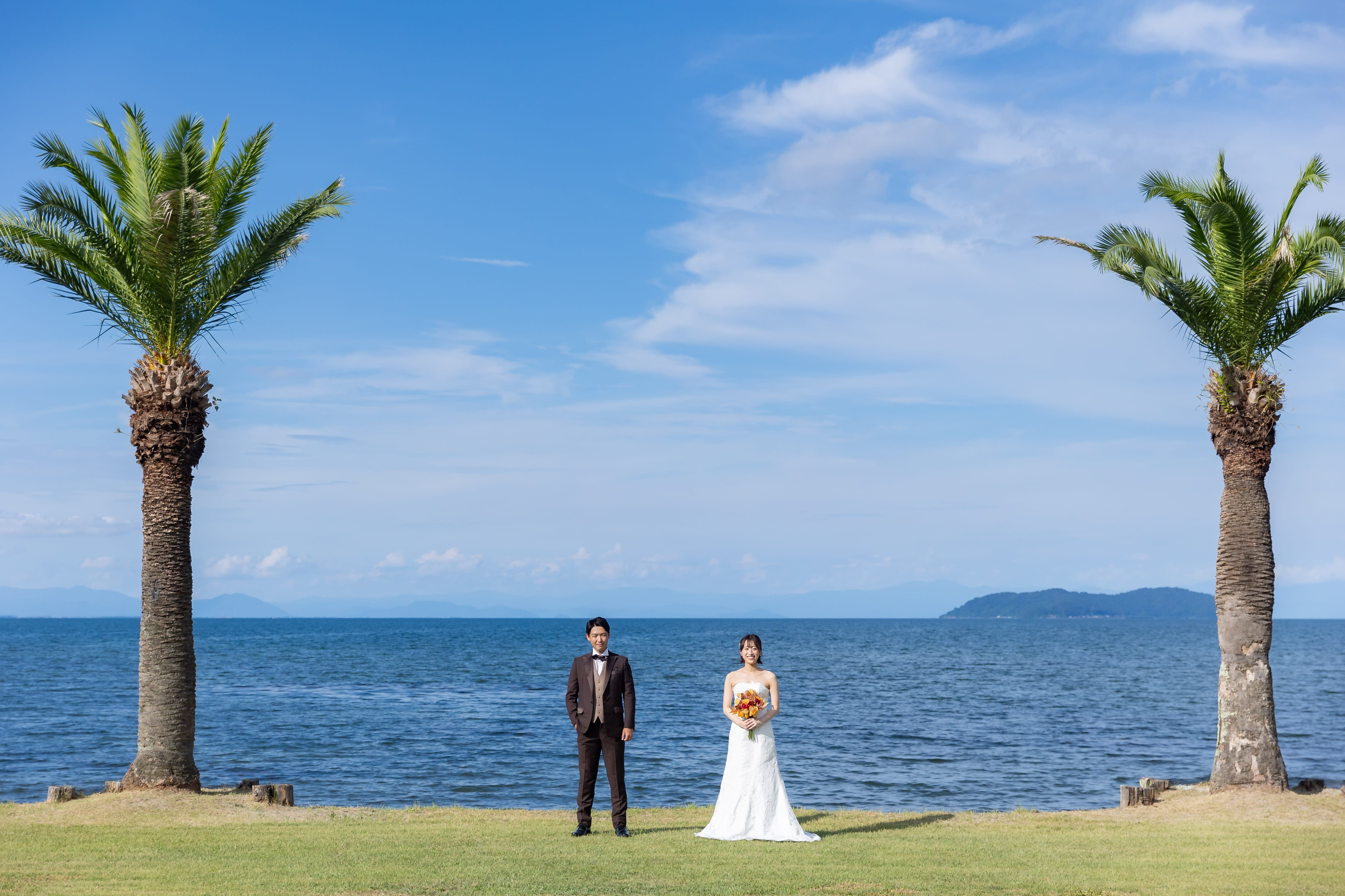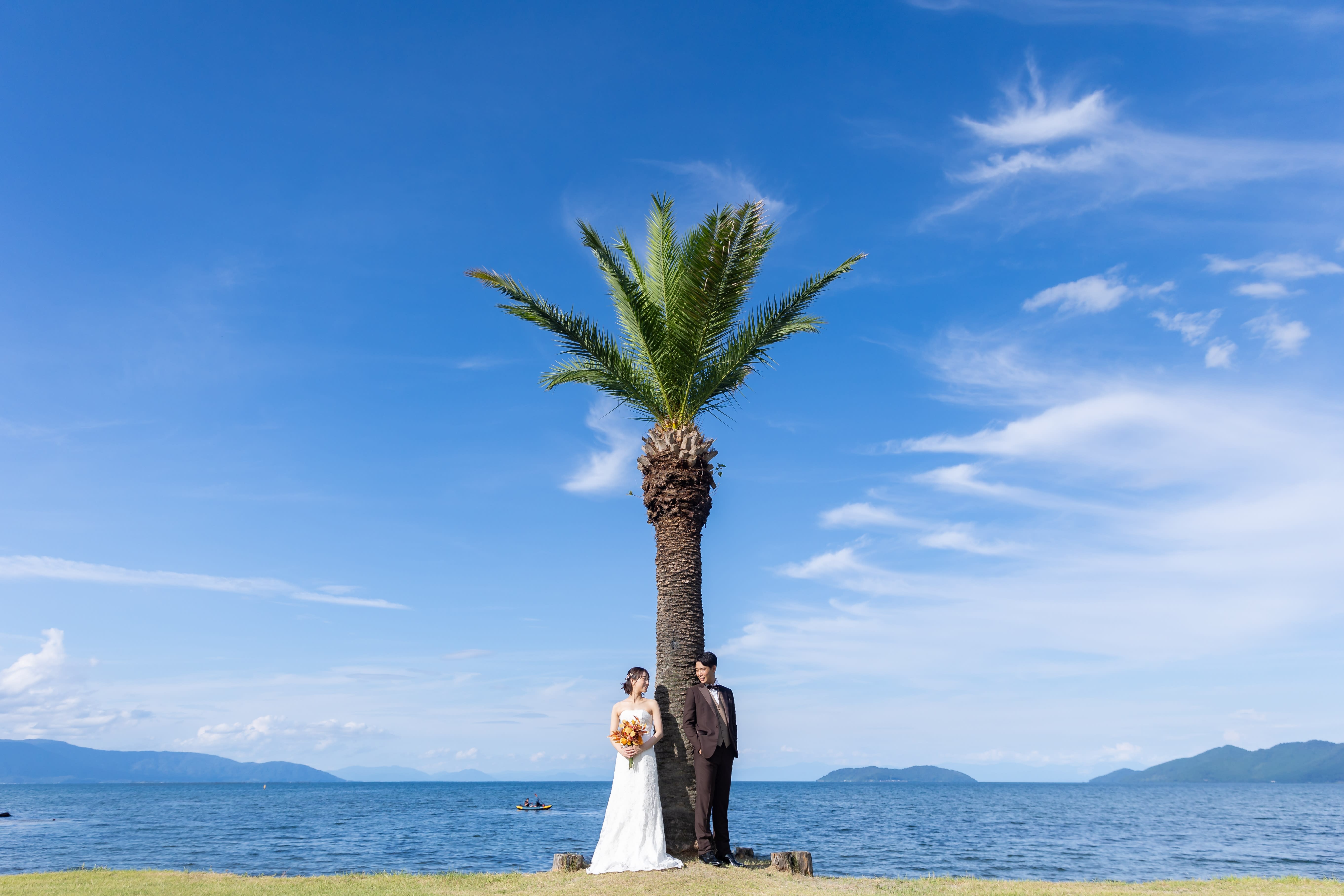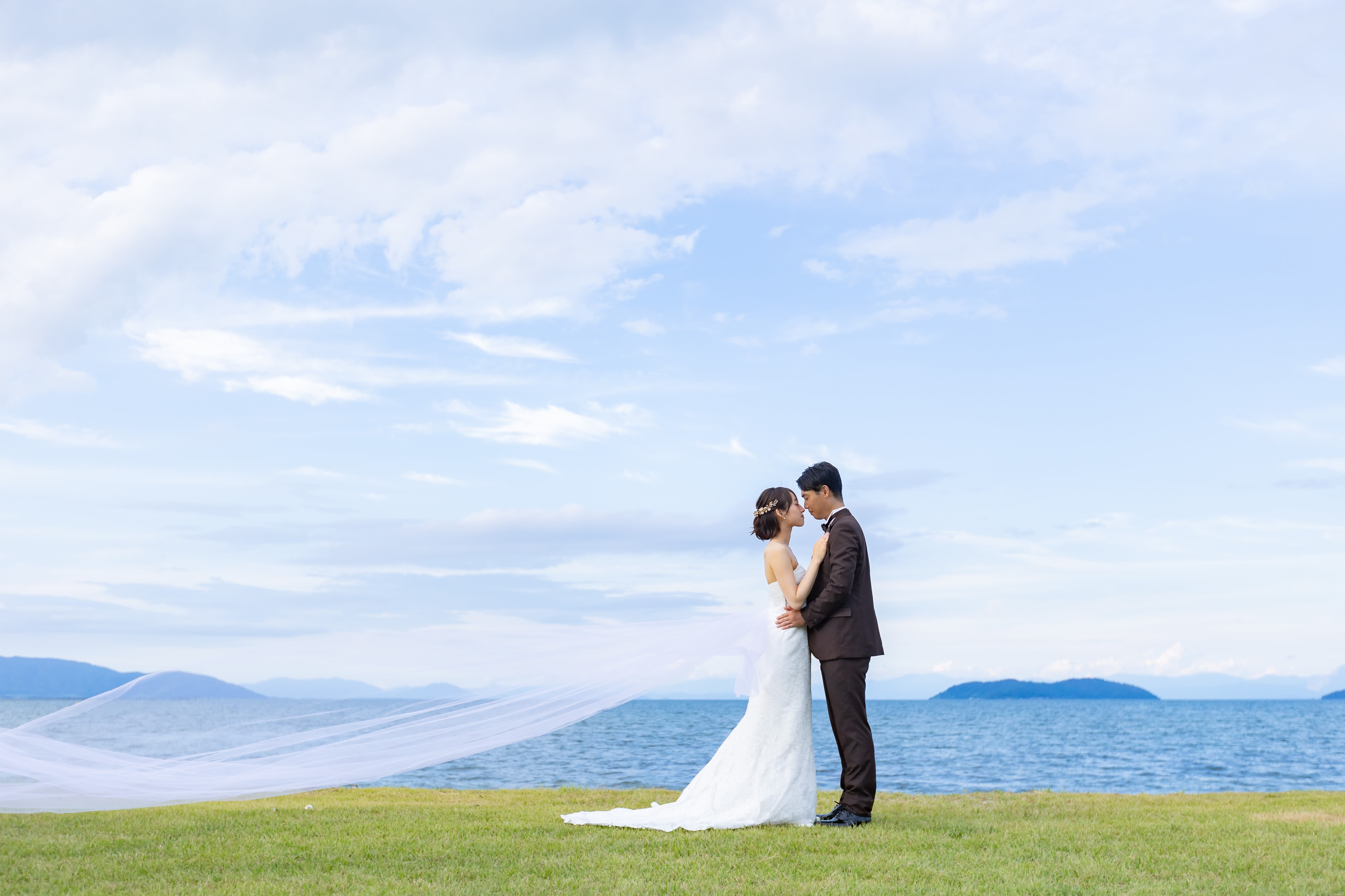 青い空と輝く水面、風になびくベール、そしてキスショット♡