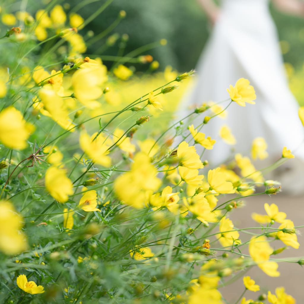お二人にお花畑の中を歩いていただきました!黄色のコスモスのふわっとした雰囲気とお二人の雰囲気がとても合っていました!